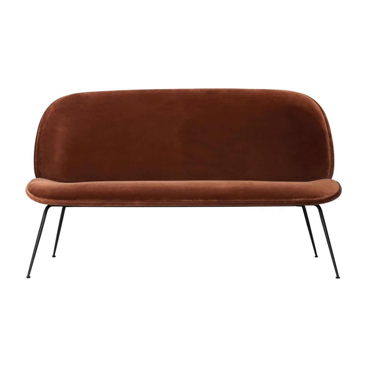 The creation of young design duo, Enrico Fratesi and Stine Gam, the Beetle Sofa is inspired by the shape, shell and structure of the insect. Gam Fratesi found the anatomy of the beetle very interesting; the structure is made up of different plates separated by thin sutures, and it is this external shell that supports and protects the animal's body. All these elements are perfectly linked and work in a fascinating way. This 2-seater sofa iteration sits atop delicate conical black legs. The design reinterprets the characteristic elements of the beetles' body: rigid on the outside and soft within, while maintaining comfort and functionality.
