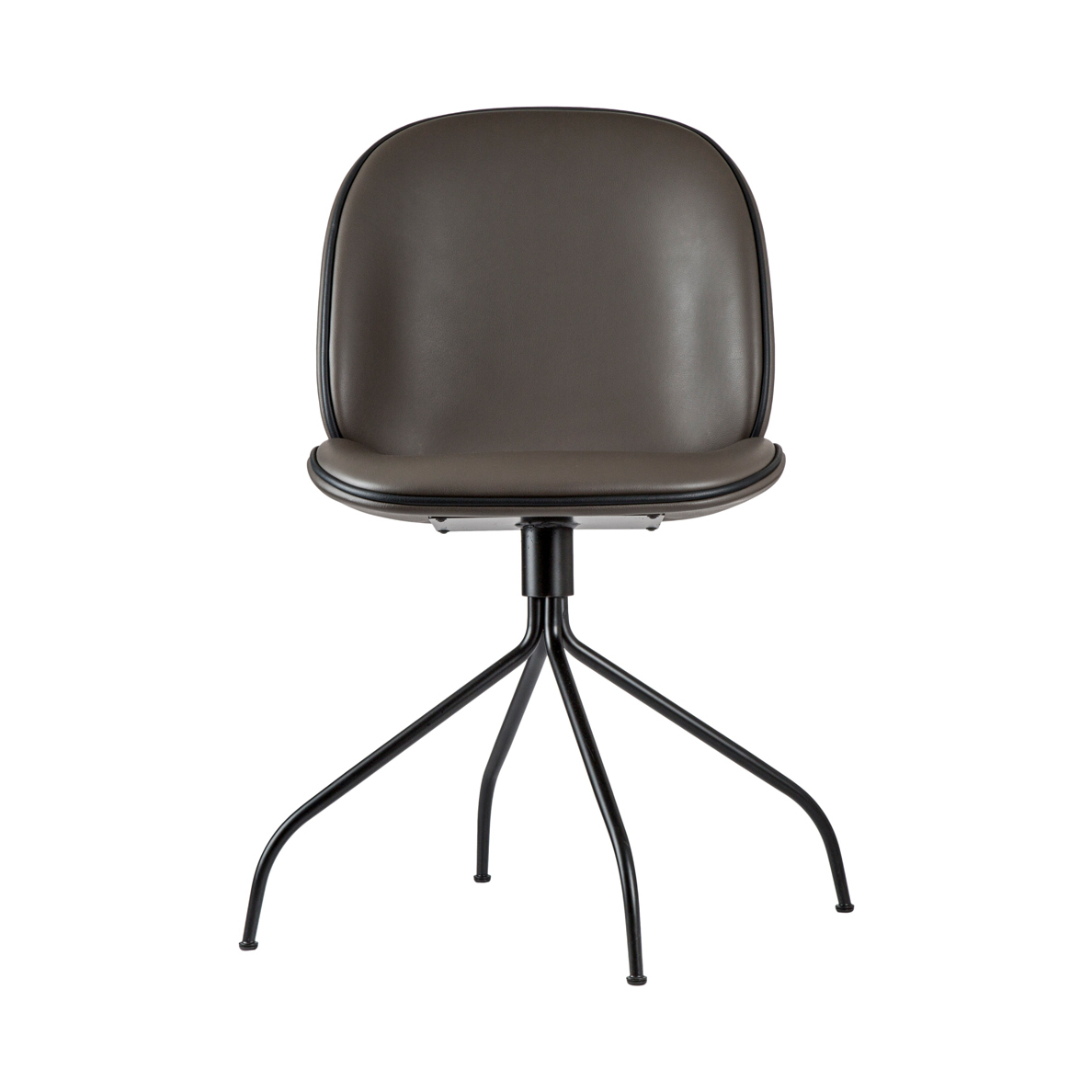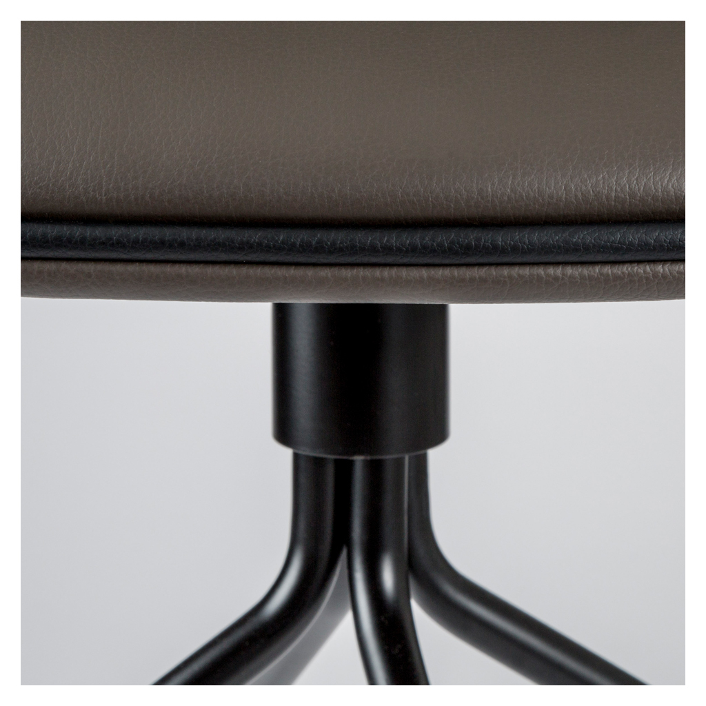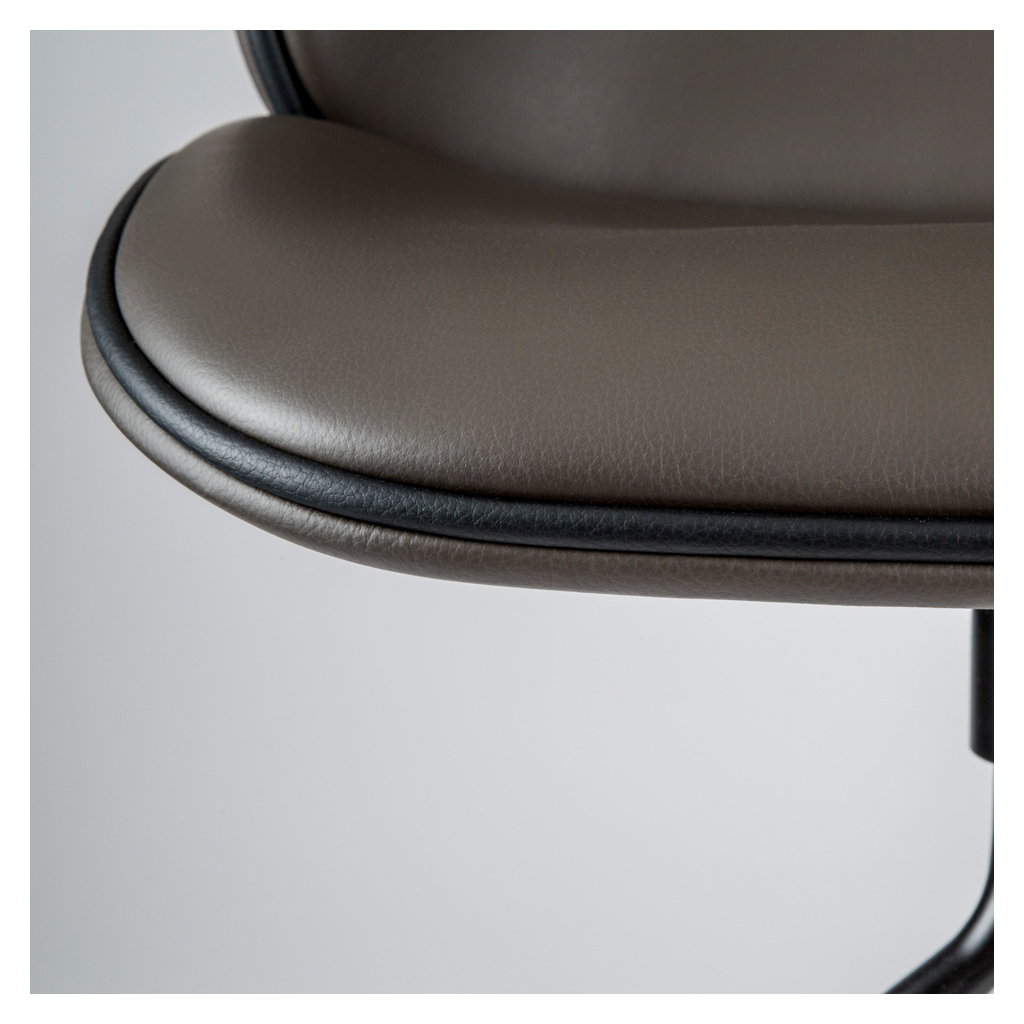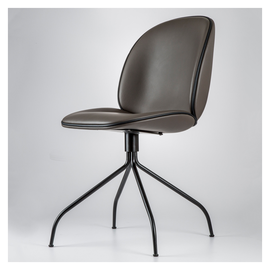 Designed in 2013 and first presented at Milan's annual Mindcraft exhibition, the Beetle Swivel Chair in premium Sierra cappuccino leather is the creation of young design duo, Enrico Fratesi and Stine Gam, and is inspired by the shape, shell and structure of the eponymous insect. Gam Fratesi found the anatomy of the beetle captivating; the structure is composed of different plates separated by thin sutures, and it is this external shell that supports and protects the animal's body. All of these elements are perfectly linked and work together in a way that fascinated the designers. The design of the chair reinterprets the characteristic elements of the beetle's body: rigid on the outside and soft within, while maintaining optimum comfort and superior functionality. The seat shell of the Beetle Swivel Chair is created using laminated moulded veneer, and shaped with sumptuous padding for ultimate comfort. The chair is upholstered in a luxurious Sierra cappuccino leather, which is impeccably finished with intricate black leather piping, while the swivel base features sleek black powder-coated steel legs that would accent any workspace or living area. Also available in black powder-coated steel or polished brass four-legged models with velvet upholstery in assorted colours.