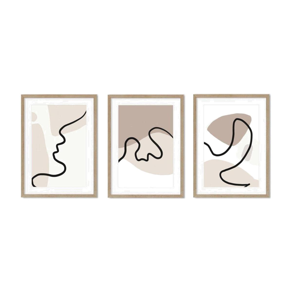Dimensions W44x H54x D2 cm. These contemporary hand-illustrated line drawings set of three framed prints will add a unique touch of style to any room in your home. The abstract eye-catching illustration perfectly complements a variety of home interiors. Printed on fine art paper with excellent colour reproduction and fade resistance. The artwork comes framed and ready to hang in a solid wood frame with oak finish and a white mount included. The size of each framed print is W44 x H54 cm measurements for the set are W132 x H54 cm. Features. Ready to hang solid wood framed prints. Real glass front High quality fine art paper. Made using eco-friendly materials including wood from sustainable forests. Produced in the UKAssembly not required..