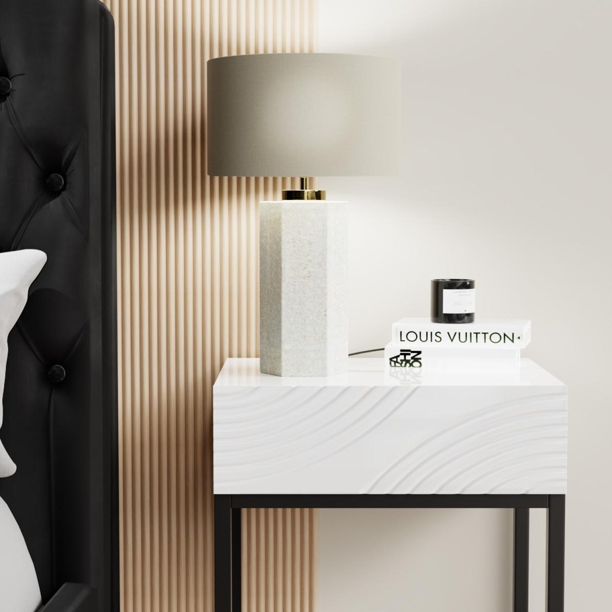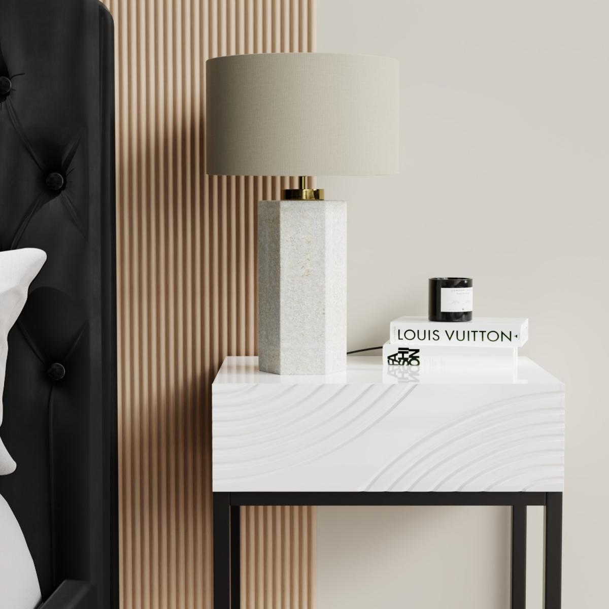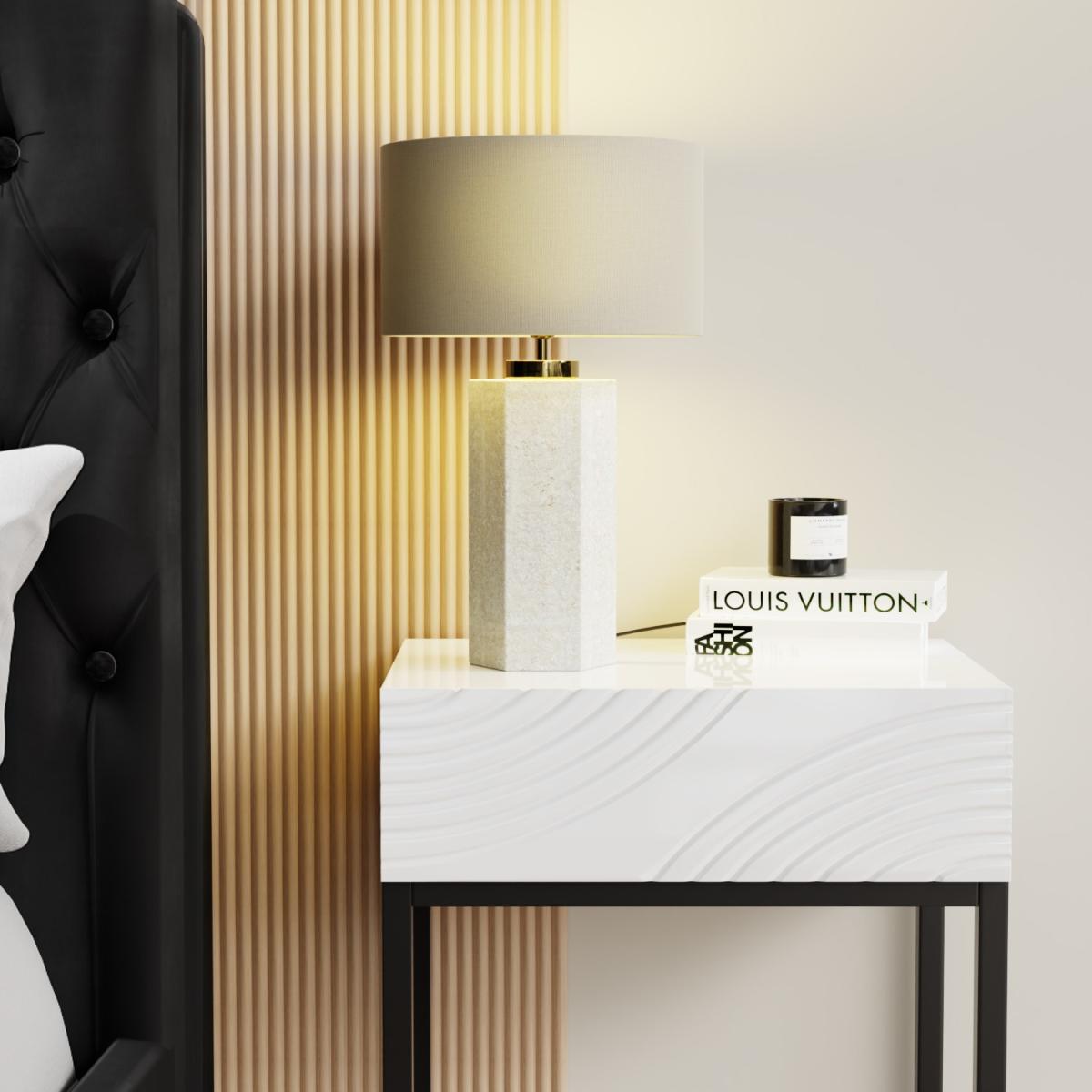 I love this lamp’s sleek combination of neutral tones and modern finishes, making it a versatile addition to a variety of interiors. Its beige and concrete look works particularly well in contemporary, Scandi, or industrial settings, where understated elegance and clean lines are key. The brass detail adds a subtle touch of warmth and sophistication, perfect for elevating minimalist schemes or adding interest to neutral palettes. For styling tips, consider placing it on a side table or desk in a living room or bedroom, paired with complementing textured cushions or accessories. It’s practical too, providing a soft, ambient glow that suits both functional and decorative needs.