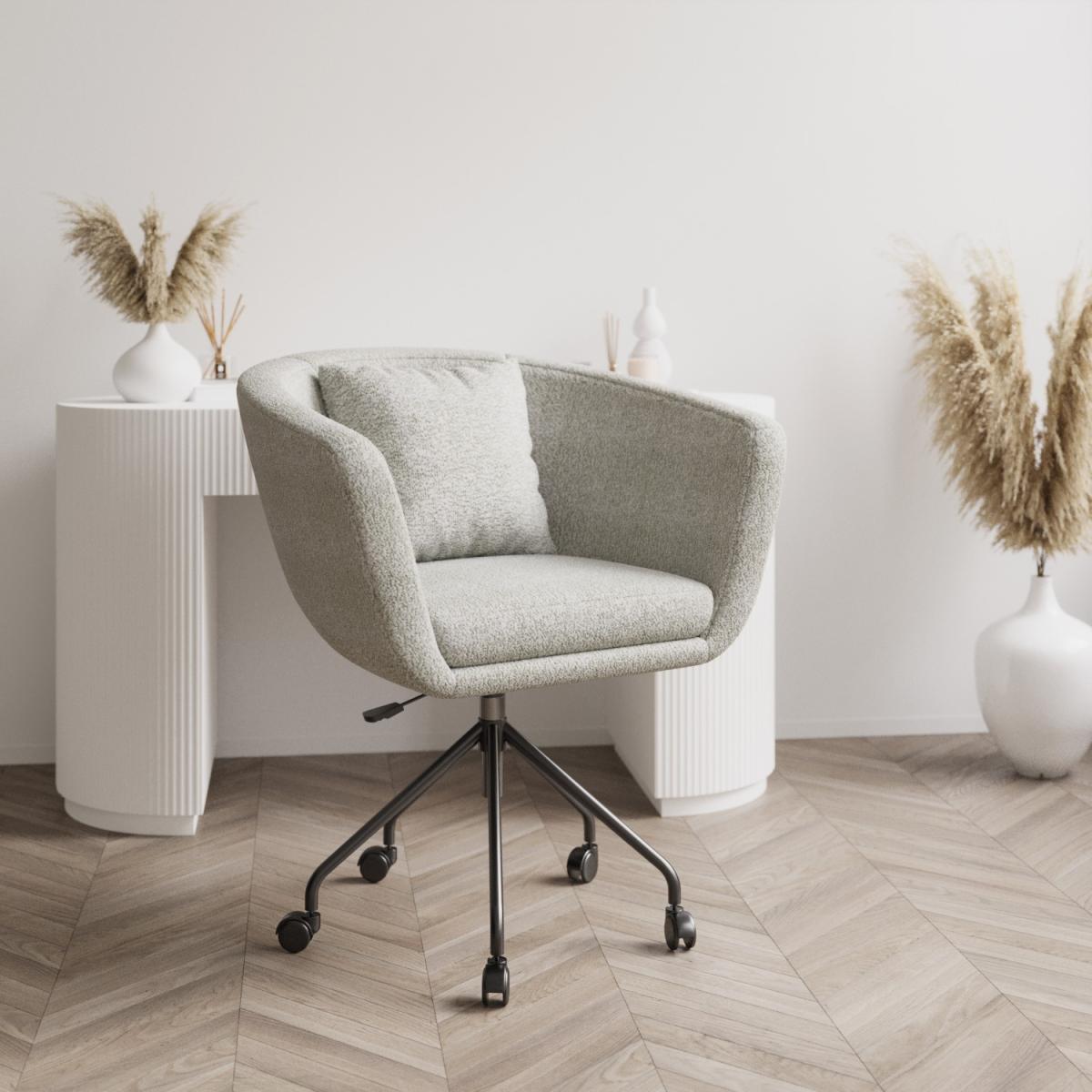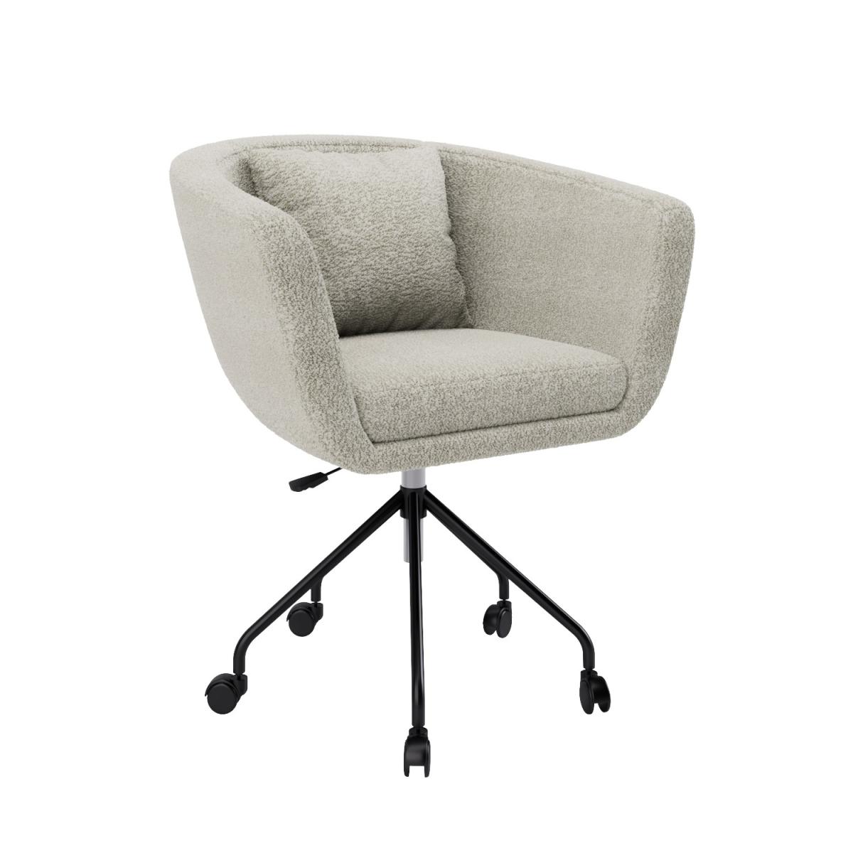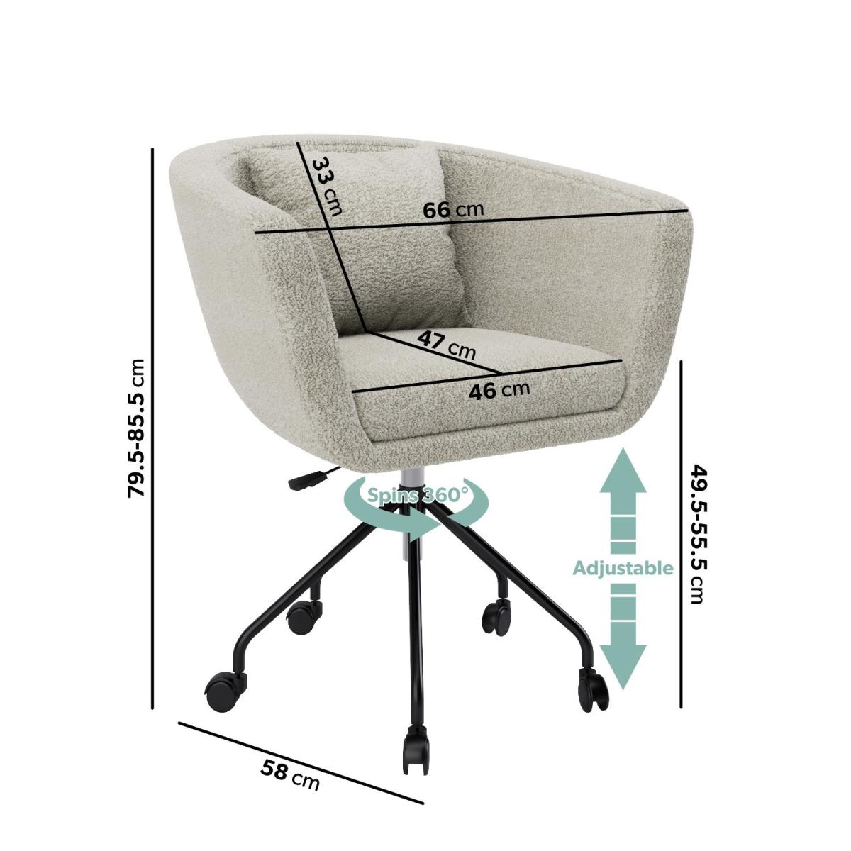 All about me Complete your dream home office with the Harris swivel office chair. A curved back with arms plus a foam-filled seat and back provide ultimate comfort all day while working from home. The modern textured upholstery looks great in any interior. Need to know Dimensions:W66 x D58 x H79.5-85.5 cm Weight: 11.5 kg Max supported weight: 150 kg Maximum seat height: 55.5cm Colour: Beige Finish: Upholstered Material:Boucle fabric and metal Assembly required: Yes Packaging dimensions: W67 x D61 x H52 cm