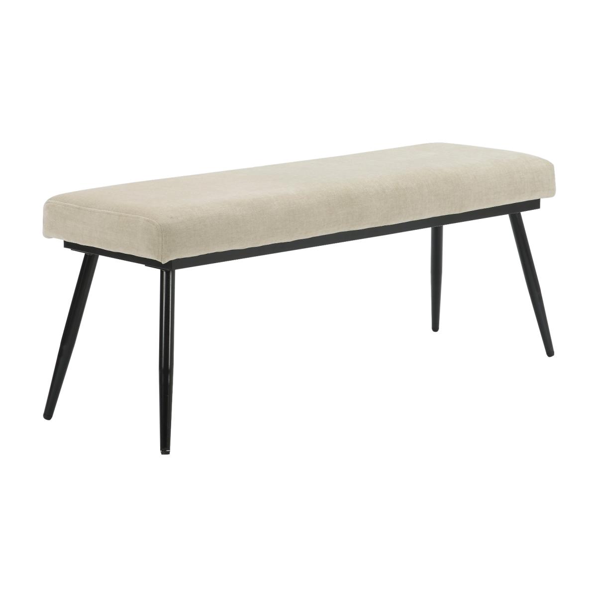 Create a modern kitchen or dining room with the Colbie dining bench, upholstered in stylish beige chenille fabric with contrasting smooth black legs. Complete the look with the matching Colbie range.