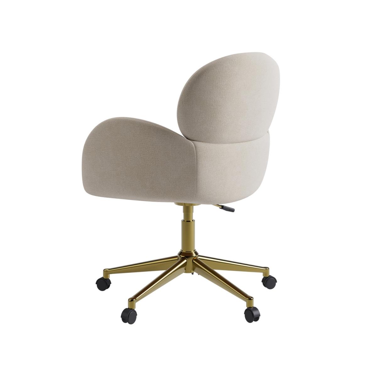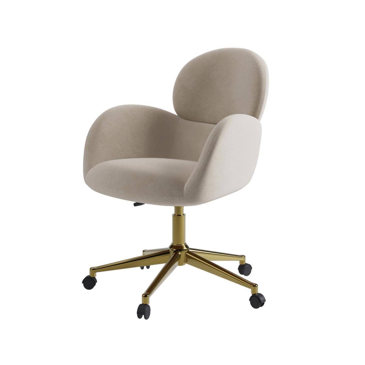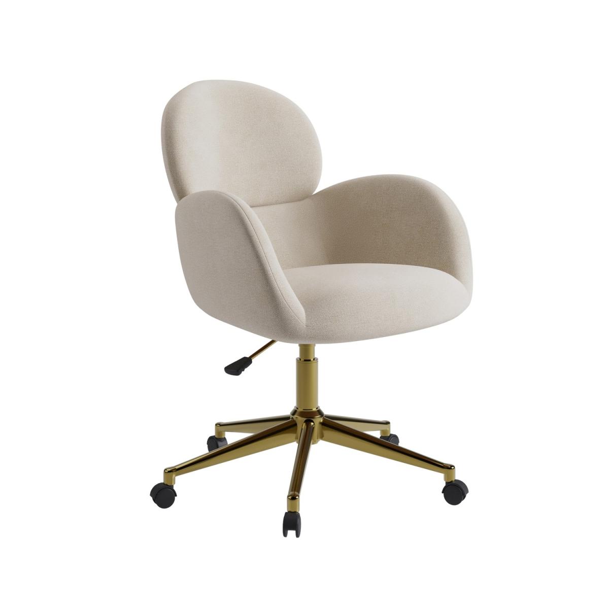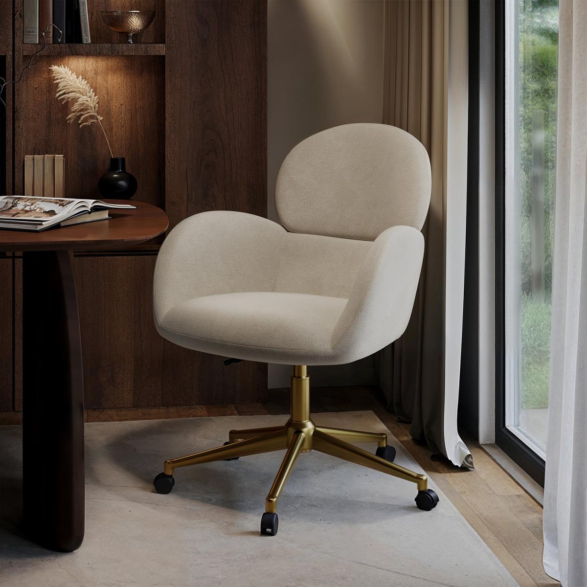 I love this beige chenille swivel office chair for its blend of comfort and understated style. Its neutral tone makes it incredibly versatile, seamlessly fitting into a range of interiors-from contemporary neutral schemes to softer, more cosy traditional spaces. The plush chenille fabric adds a touch of softness that’s perfect for home offices or study areas, while the swivel functionality ensures practicality. For styling tips, consider pairing it with a sleek wooden or glass desk to keep the look refined. It also works well with brass or gold accents, echoing the base’s metallic finish, to add a subtle touch of elegance. Keep the surrounding decor minimalistic or layered with textured accessories to highlight the chair’s inviting, tactile nature.