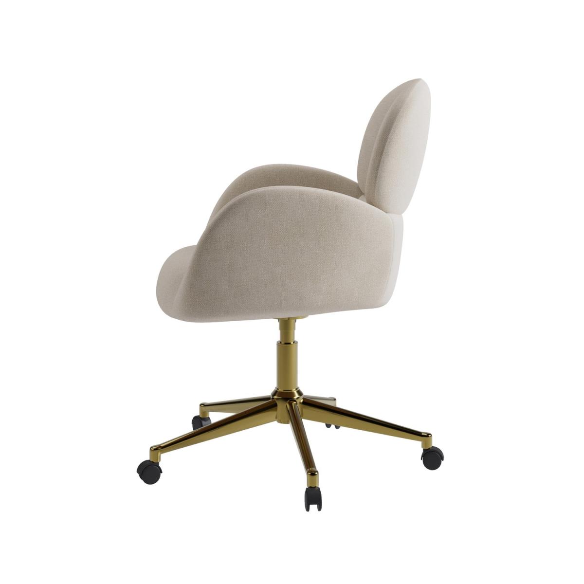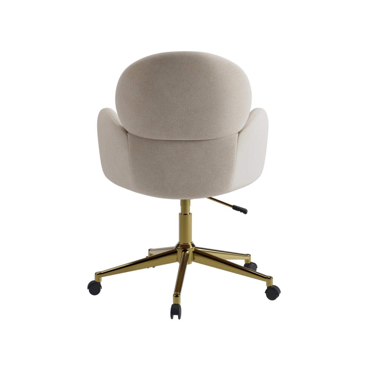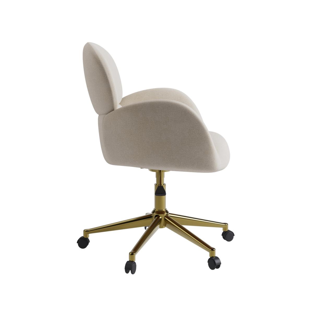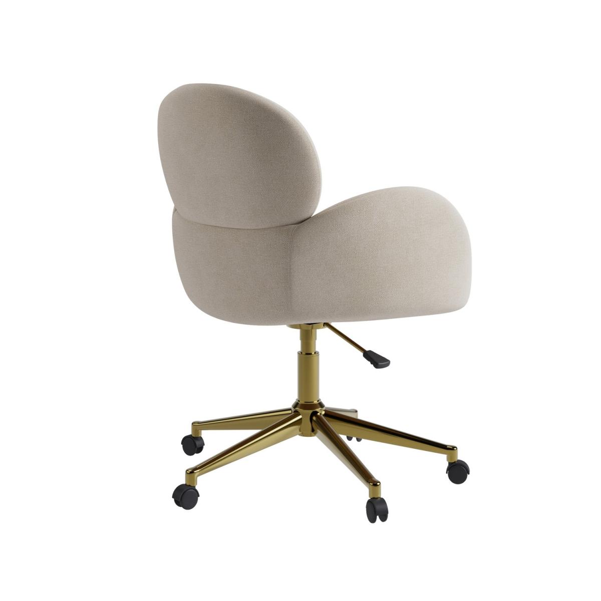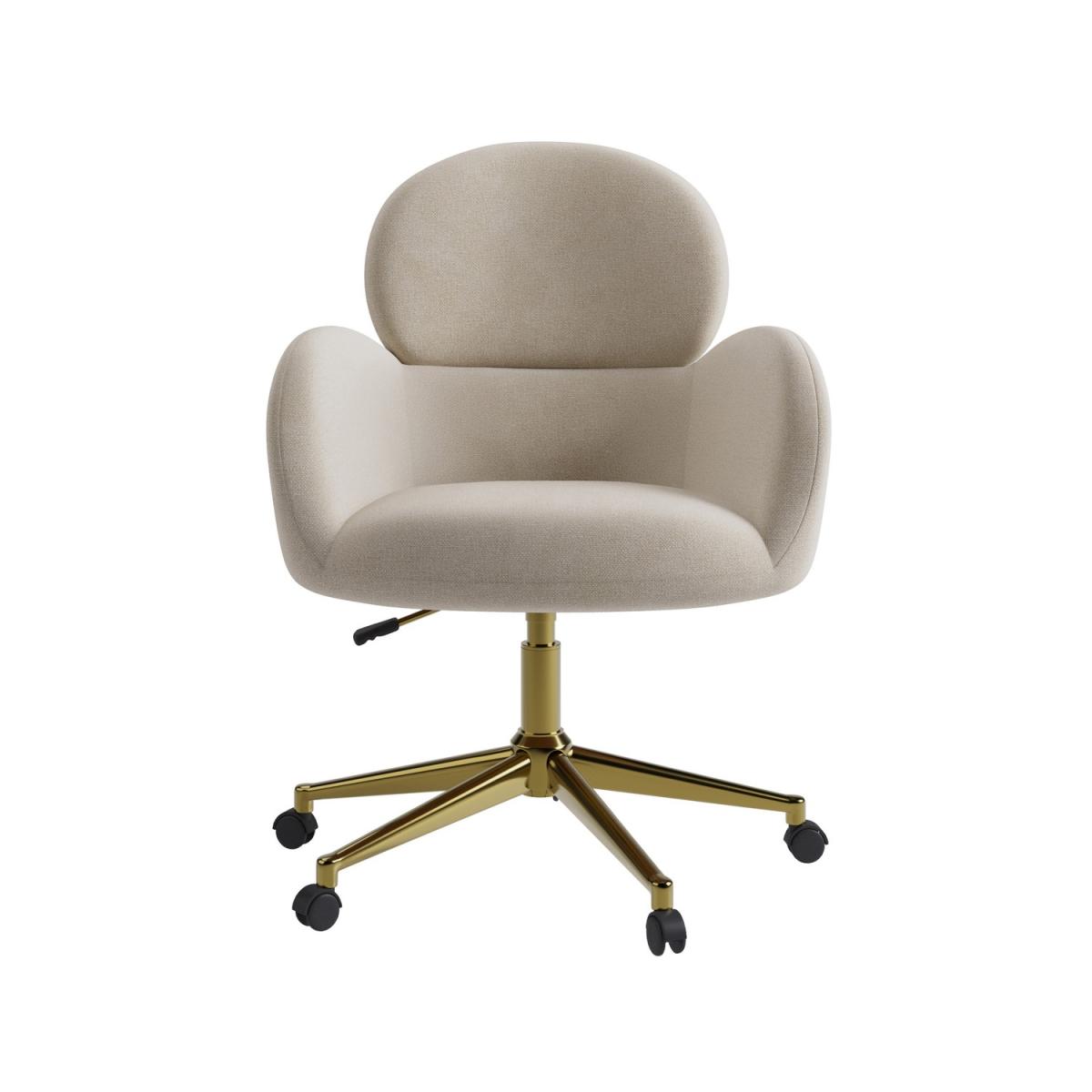 I love this beige chenille swivel office chair for its blend of comfort and understated style. Its neutral tone makes it incredibly versatile, seamlessly fitting into a range of interiors-from contemporary neutral schemes to softer, more cosy traditional spaces. The plush chenille fabric adds a touch of softness that’s perfect for home offices or study areas, while the swivel functionality ensures practicality. For styling tips, consider pairing it with a sleek wooden or glass desk to keep the look refined. It also works well with brass or gold accents, echoing the base’s metallic finish, to add a subtle touch of elegance. Keep the surrounding decor minimalistic or layered with textured accessories to highlight the chair’s inviting, tactile nature.