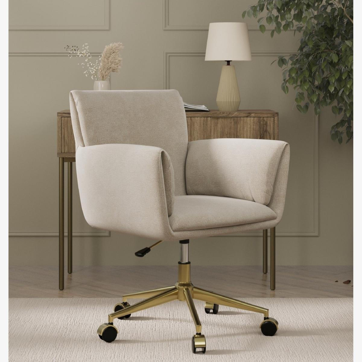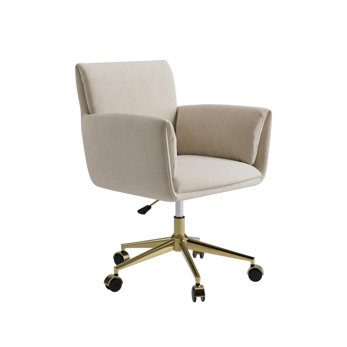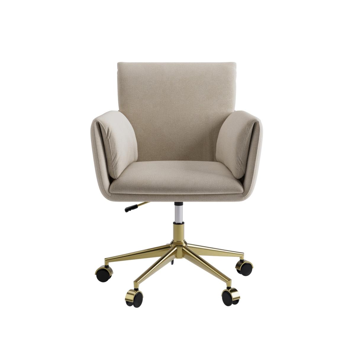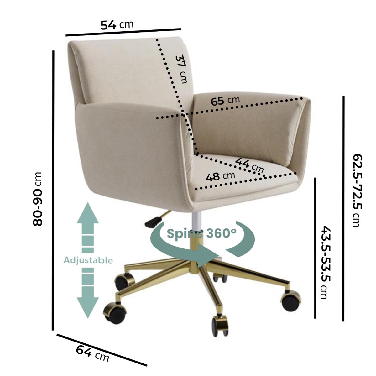 Soft and durable beige chenille fabric adds warmth and texture, seamlessly complementing modern and traditional interiors. The tall backrest provides excellent back support, promoting better posture, with armrests adding extra comfort. Effortlessly customise the seat height with a smooth gas lift mechanism to suit different heights. Stylish gold accents and smooth mobility for added functionality. Foam-filled cushioning on the seat, back and armrests offers long-lasting comfort and excellent support. The Beige Fabric Swivel Office Chair is the perfect blend of style, comfort, and functionality, making it an ideal addition to your office or dressing room. Upholstered in soft, durable beige chenille fabric, this chair offers a neutral and versatile look that can easily complement a variety of spaces. The ergonomic design provides excellent back support, ensuring comfort during long working hours. With a tall backrest, adjustable height, and armrests, it offers full support for improved posture. The gold legs and castors add a touch of elegance, while the swivel mechanism ensures easy mobility. Whether used in a home office, workspace, or dressing room, this office chair brings both style and comfort to any setting.