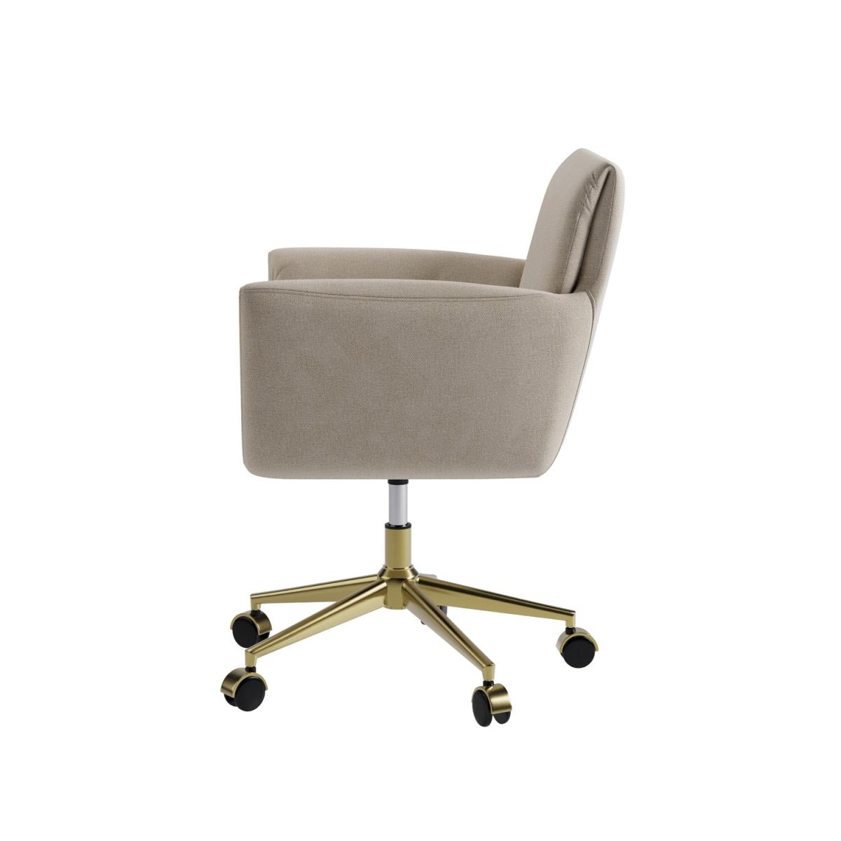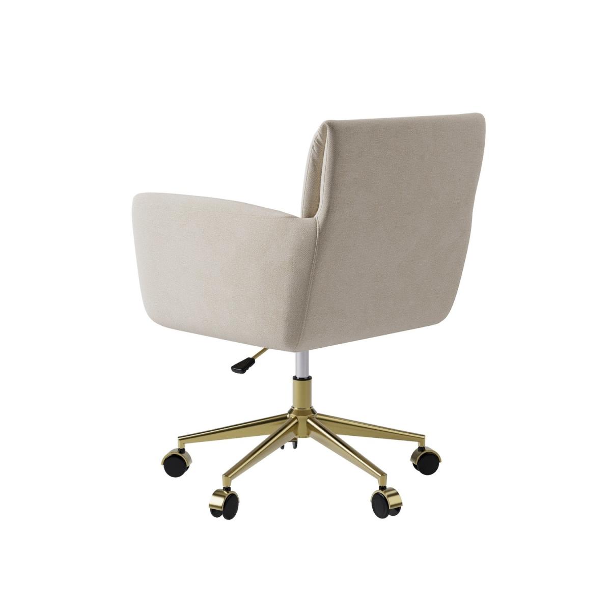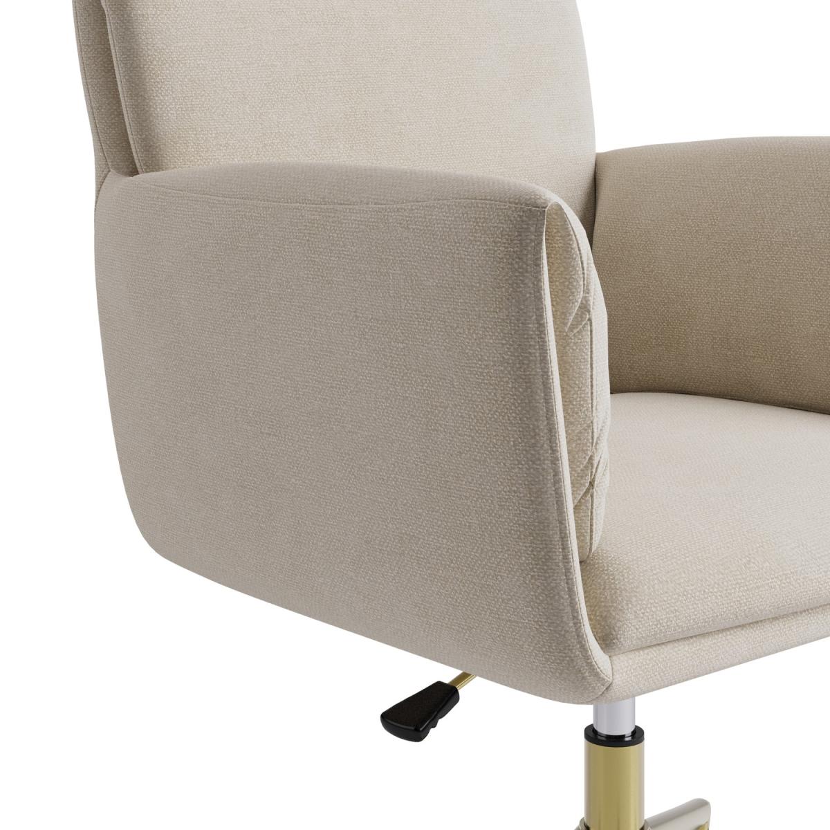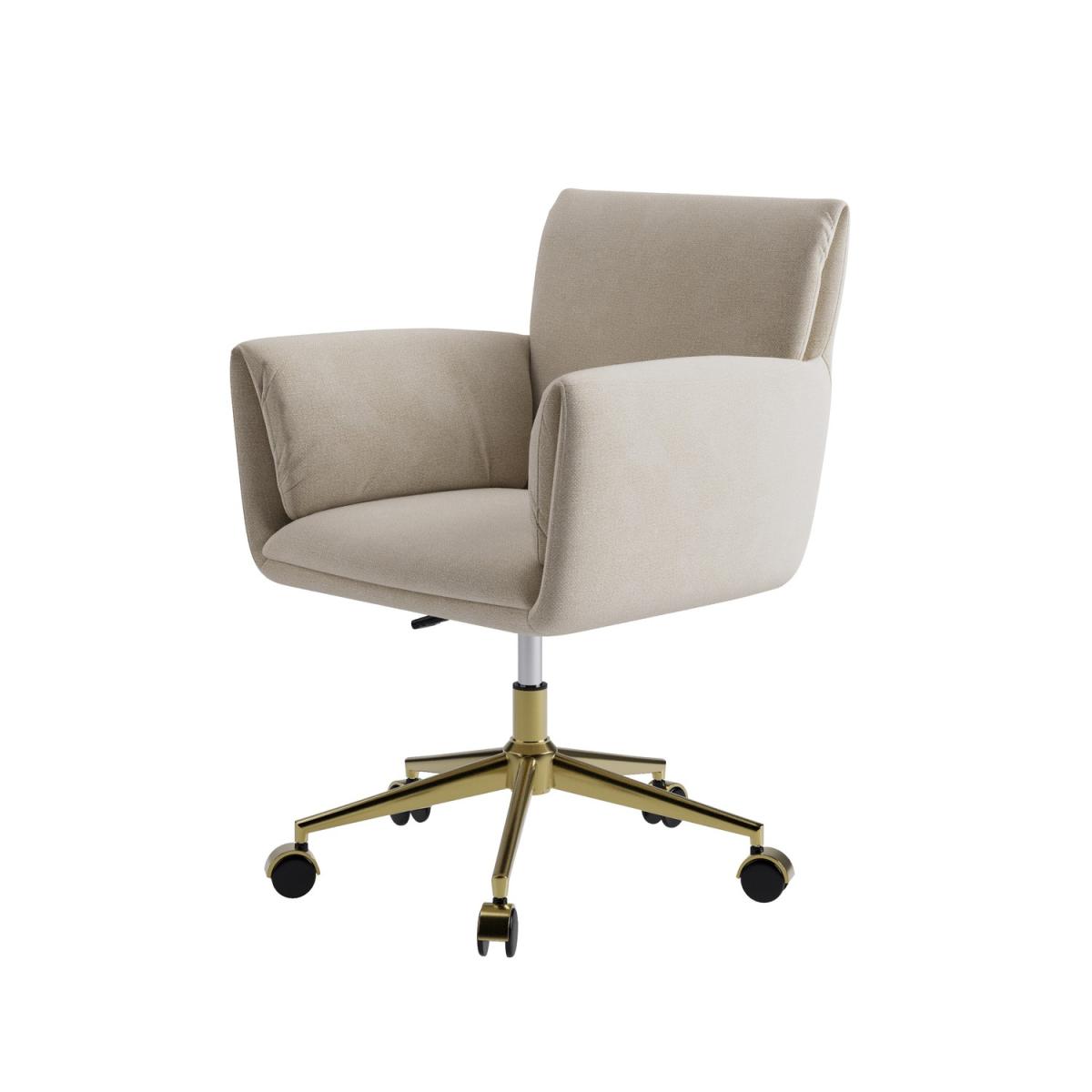 Soft and durable beige chenille fabric adds warmth and texture, seamlessly complementing modern and traditional interiors. The tall backrest provides excellent back support, promoting better posture, with armrests adding extra comfort. Effortlessly customise the seat height with a smooth gas lift mechanism to suit different heights. Stylish gold accents and smooth mobility for added functionality. Foam-filled cushioning on the seat, back and armrests offers long-lasting comfort and excellent support. The Beige Fabric Swivel Office Chair is the perfect blend of style, comfort, and functionality, making it an ideal addition to your office or dressing room. Upholstered in soft, durable beige chenille fabric, this chair offers a neutral and versatile look that can easily complement a variety of spaces. The ergonomic design provides excellent back support, ensuring comfort during long working hours. With a tall backrest, adjustable height, and armrests, it offers full support for improved posture. The gold legs and castors add a touch of elegance, while the swivel mechanism ensures easy mobility. Whether used in a home office, workspace, or dressing room, this office chair brings both style and comfort to any setting.