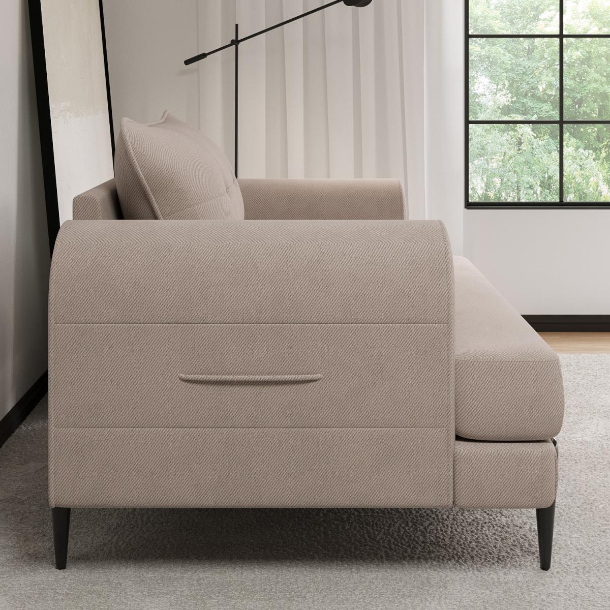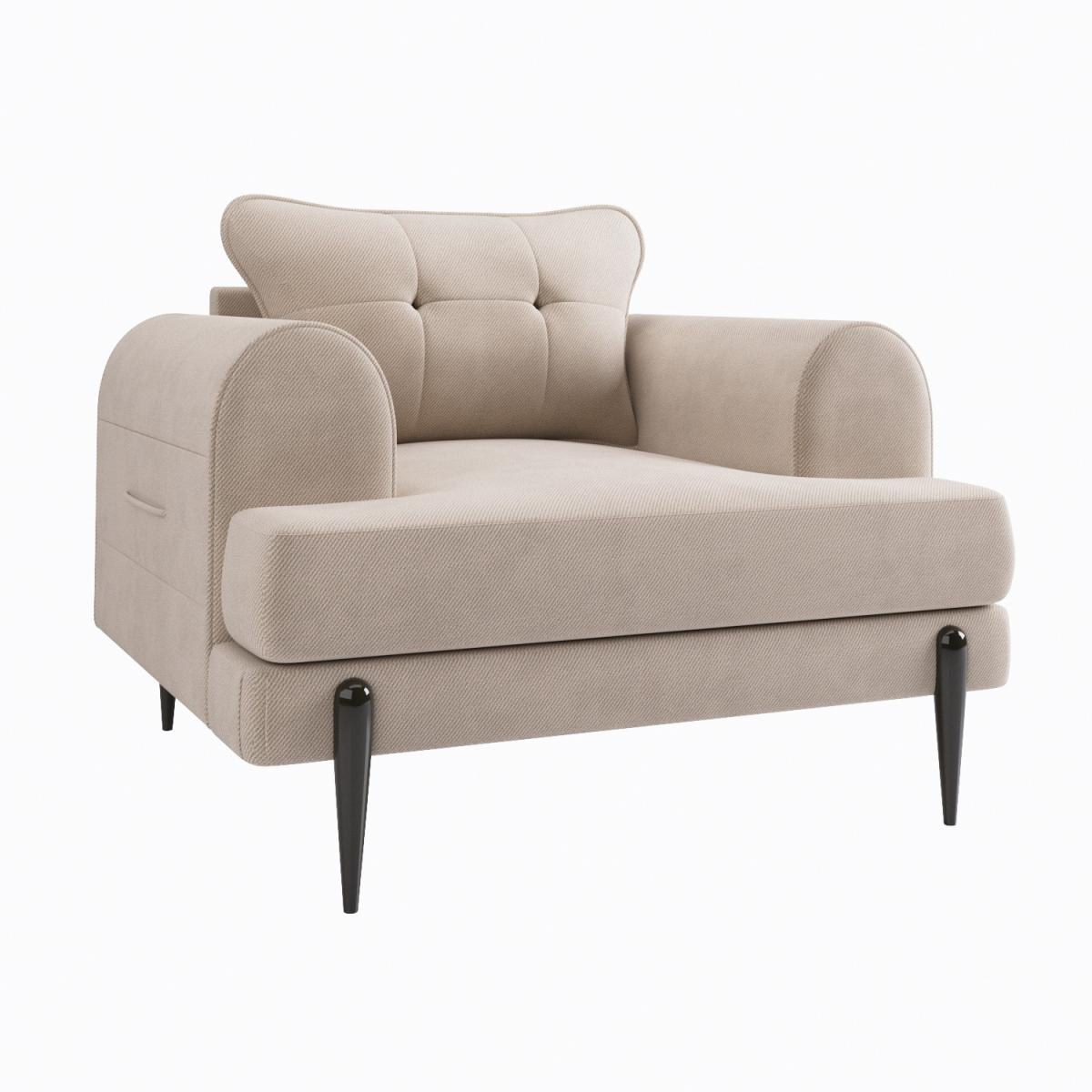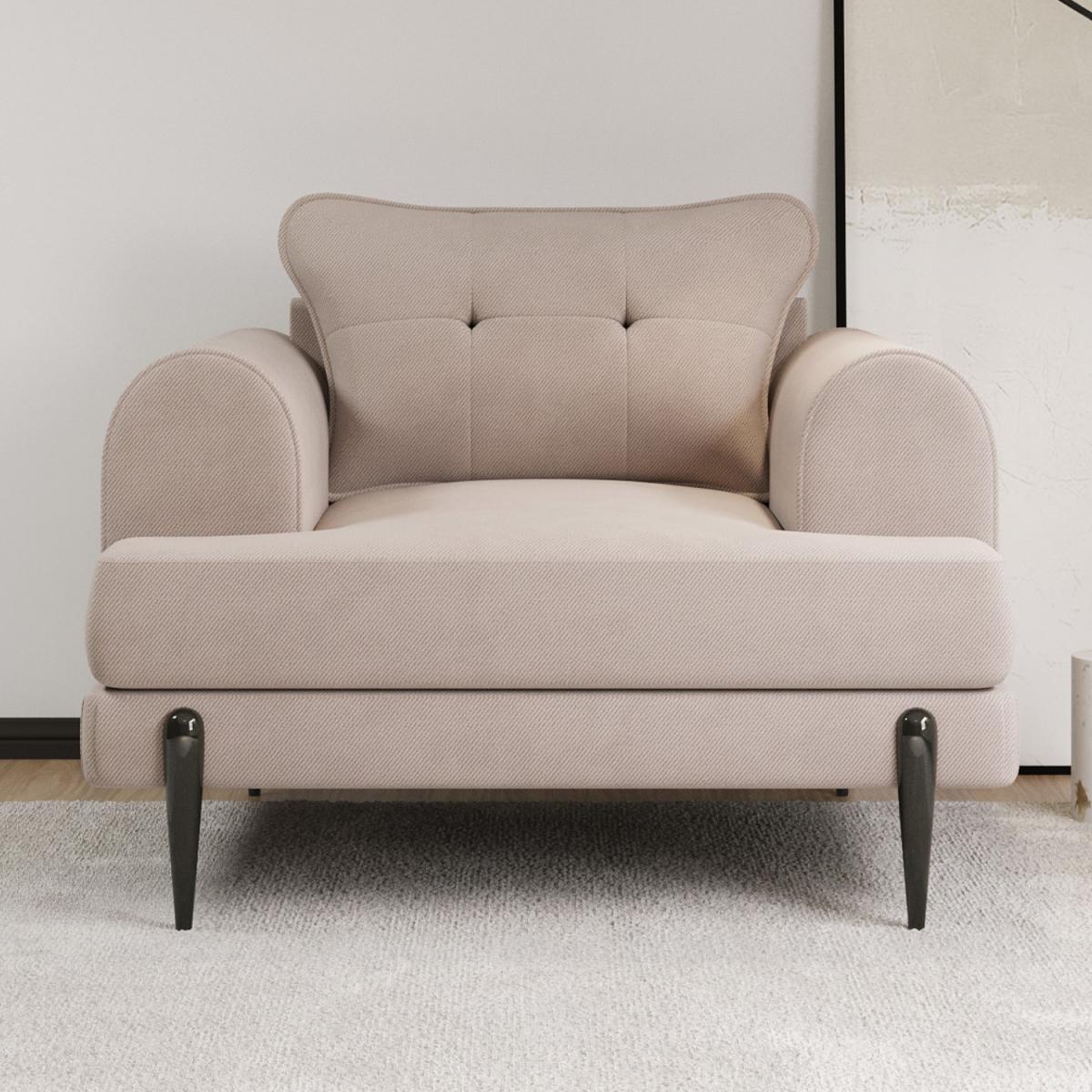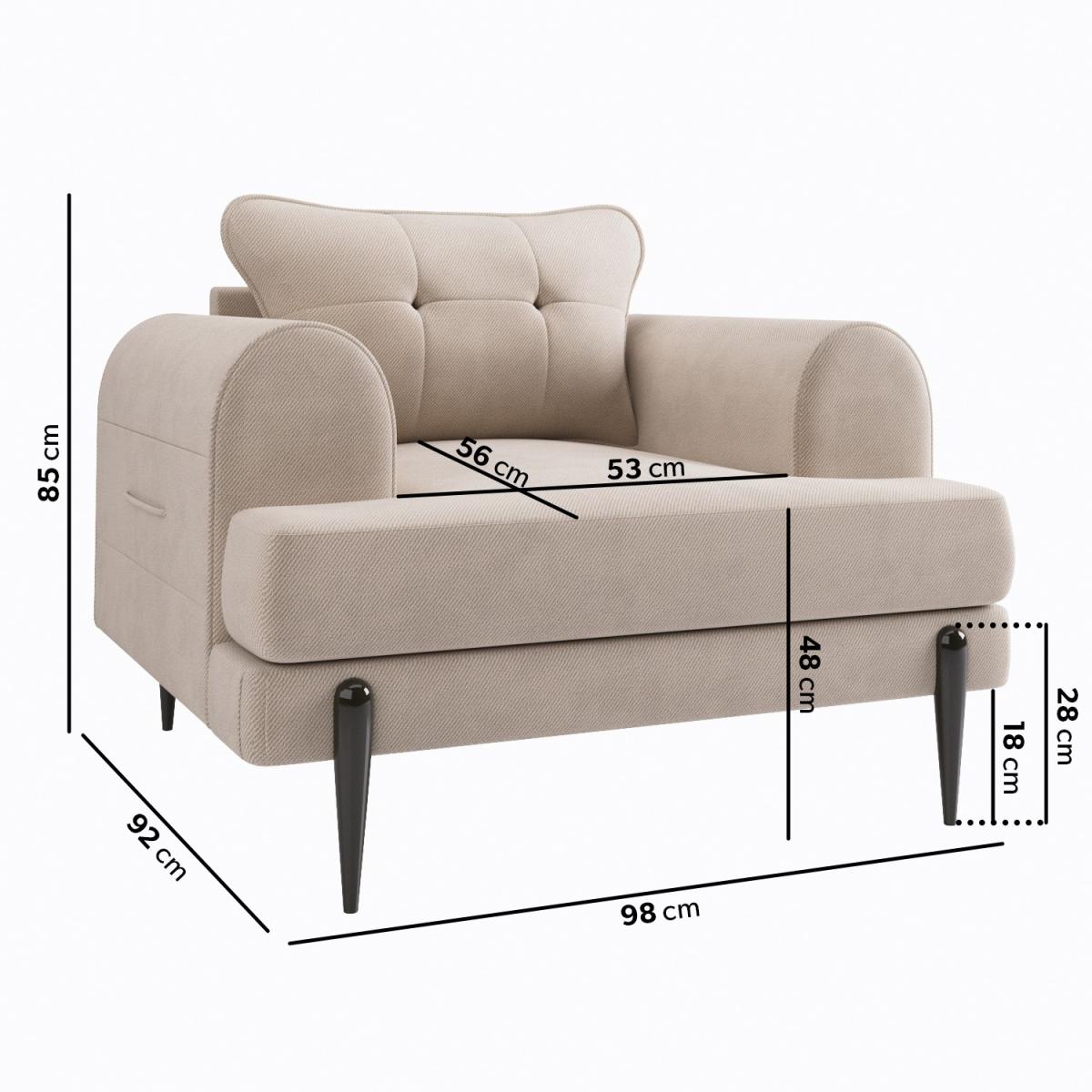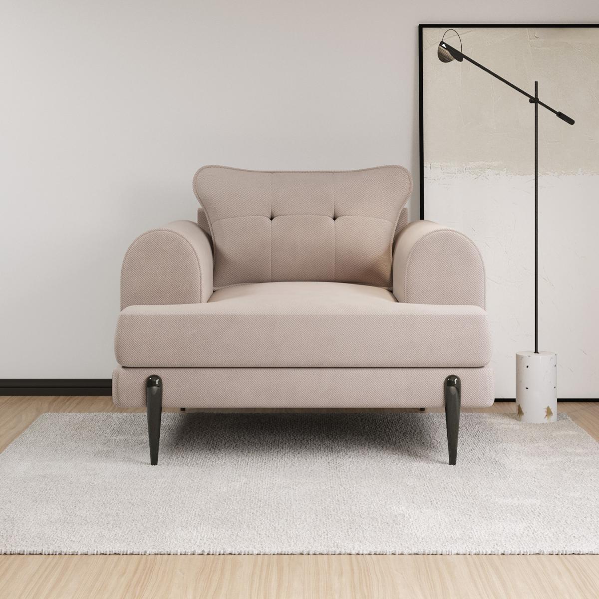 All about me. The Rosie armchair creates a statement in any living room with a quilted back detail and neutral woven upholstery that pairs beautifully with any interior style. Pair with the matching Rosie furniture for the perfect look. Need to know. Dimensions. W98 x D92 x H85 cm Packaging dimensions. W100 x D94 x H57 cm Weight. 30 kg Maximum supported weight. 110 kg per seat Colour. Beige black legs Finish. Upholstered Material. Woven fabric metal legs Filling. Foam Frame. Strong plywood and eucalyptus wood Assembly required. Yes - just attach the legs.
