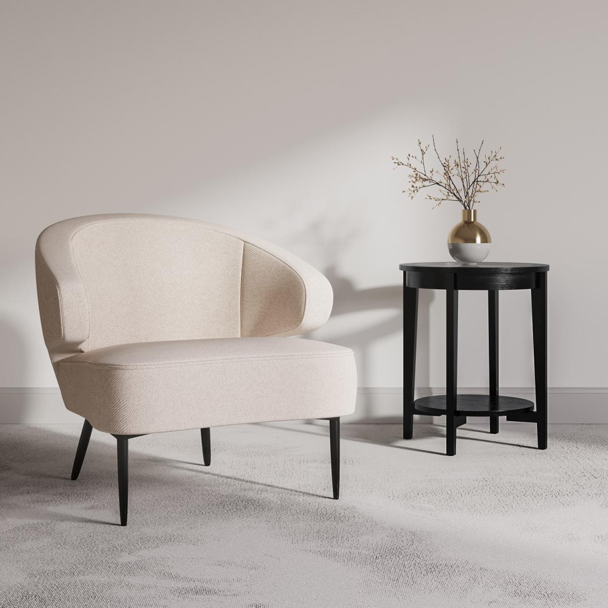I love this armchair for its sleek, modern silhouette and versatile colour palette, making it a great statement piece without overpowering a room. The beige fabric brings warmth and neutrality, allowing it to blend seamlessly into both contemporary and minimalist interiors. The black metal legs add a subtle touch of contrast and sophistication, and it’s lightweight enough to move around easily for practical styling. It works well as an accent piece in living rooms or bedrooms, paired with textured cushions or a cosy throw for layered visual interest. To keep the space feeling balanced, consider placing it near a bold accent piece or artwork to make it pop, or use it alongside other neutral furniture for a calm, understated look.