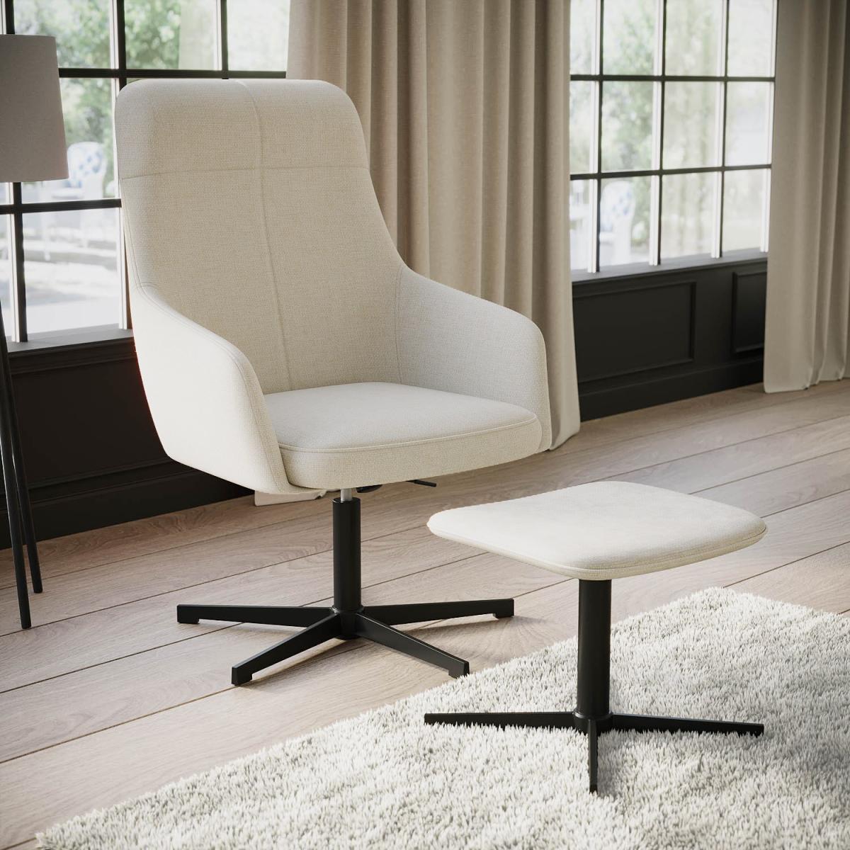 All about me The Mila armchair and footstool is the perfect place to sit back, relax and put your feet up after a long day. The tilt mechanism allows you to recline comfortably, and the chair swivels all the way around so you can get on and off from wherever you like. The beige woven fabric looks great in neutral and modern interiors, and the sturdy metal base means it's built to last. Need to know Chair dimensions:W70 x D77-89.5 x H95-106 cm Footstool dimensions: W47 x D43 x H47 cm Weight: 17.8 kg Max supported weight: 130 kg Colour: Beige and black base Finish: Upholstered Material:Woven fabric and metal base Assembly required: Yes Packed dimensions: W93 x D73 x H59 cm