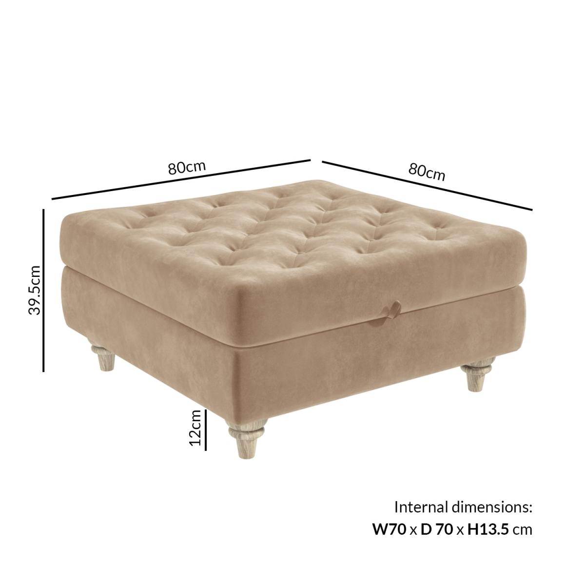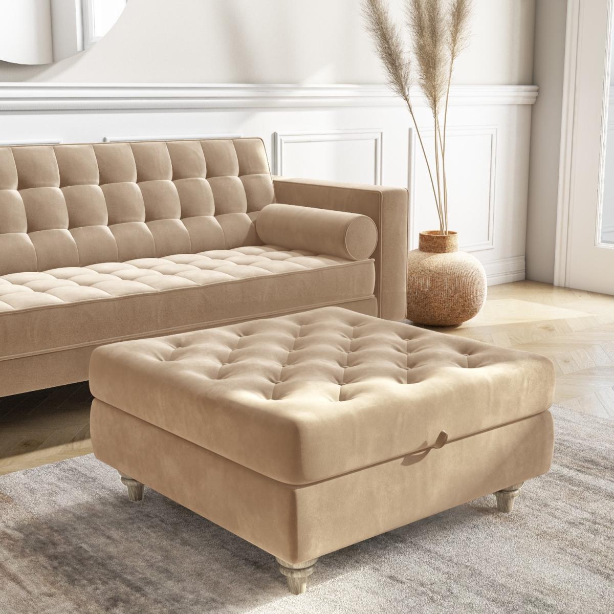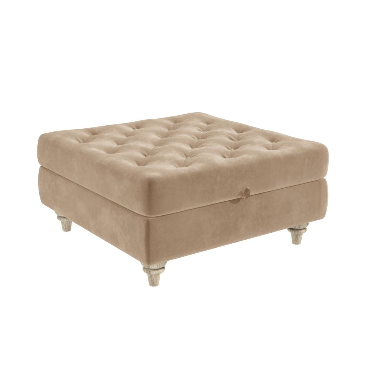 Features we love Elegant ottoman footstool ideal for any room in the home. Beautifully upholstered in a plush beige velvet fabric Luxurious button tufted top and sculptured wooden legs. Makes a perfect match to the Elba sofa collection. Other colours in the Inez range are available All about me. Give your home an opulent touch with this gorgeous Inez ottoman footstool. Combining style with storage it’ll make a versatile addition to any room in your home. It can be used as an extra seat and it doubles as a gorgeous coffee table once you place a tray on top or you can just put your feet up and relax. The internal storage features anti-slam mechanism fixtures so the lid stays open and it’s perfect for storing your snuggly throw your favourite magazines remote controls and more. . Need to know. Overall dimensions. W80 x D80 x H39.5 cm (including legs at 12 cm) Internal dimensions. W70 x D70 x H13.5 cm Max supported weight. 100kg Colour. Beige Finish. Upholstered and polished (legs) Material. Wood construction (with eucalyptus wood) and velvet For use. Indoors Weight. 20kg Assembly required. Yes just the legs to attach.
