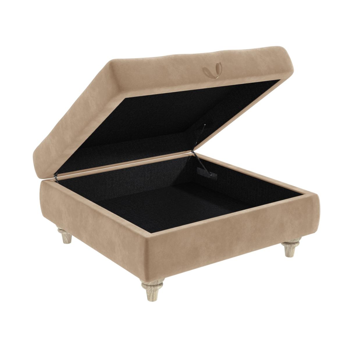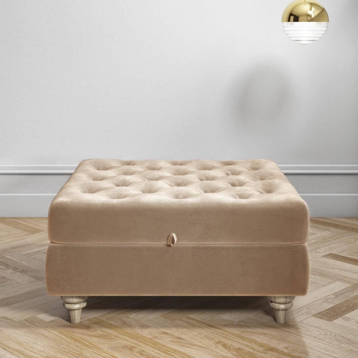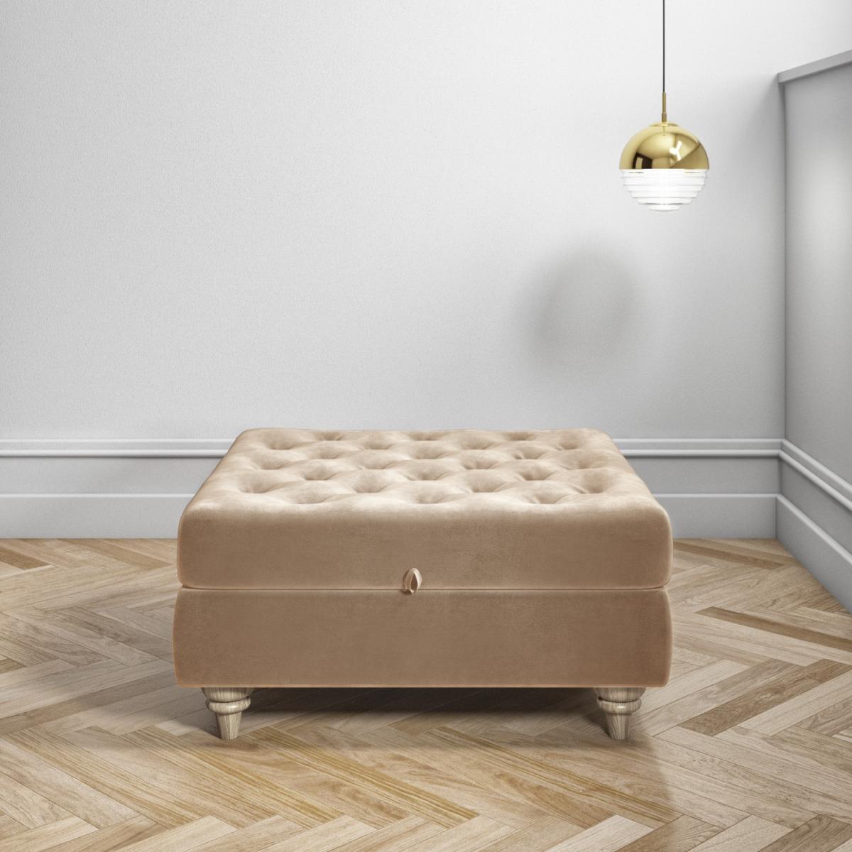 Features we love Elegant ottoman footstool ideal for any room in the home. Beautifully upholstered in a plush beige velvet fabric Luxurious button tufted top and sculptured wooden legs. Makes a perfect match to the Elba sofa collection. Other colours in the Inez range are available All about me. Give your home an opulent touch with this gorgeous Inez ottoman footstool. Combining style with storage it’ll make a versatile addition to any room in your home. It can be used as an extra seat and it doubles as a gorgeous coffee table once you place a tray on top or you can just put your feet up and relax. The internal storage features anti-slam mechanism fixtures so the lid stays open and it’s perfect for storing your snuggly throw your favourite magazines remote controls and more. . Need to know. Overall dimensions. W80 x D80 x H39.5 cm (including legs at 12 cm) Internal dimensions. W70 x D70 x H13.5 cm Max supported weight. 100kg Colour. Beige Finish. Upholstered and polished (legs) Material. Wood construction (with eucalyptus wood) and velvet For use. Indoors Weight. 20kg Assembly required. Yes just the legs to attach.