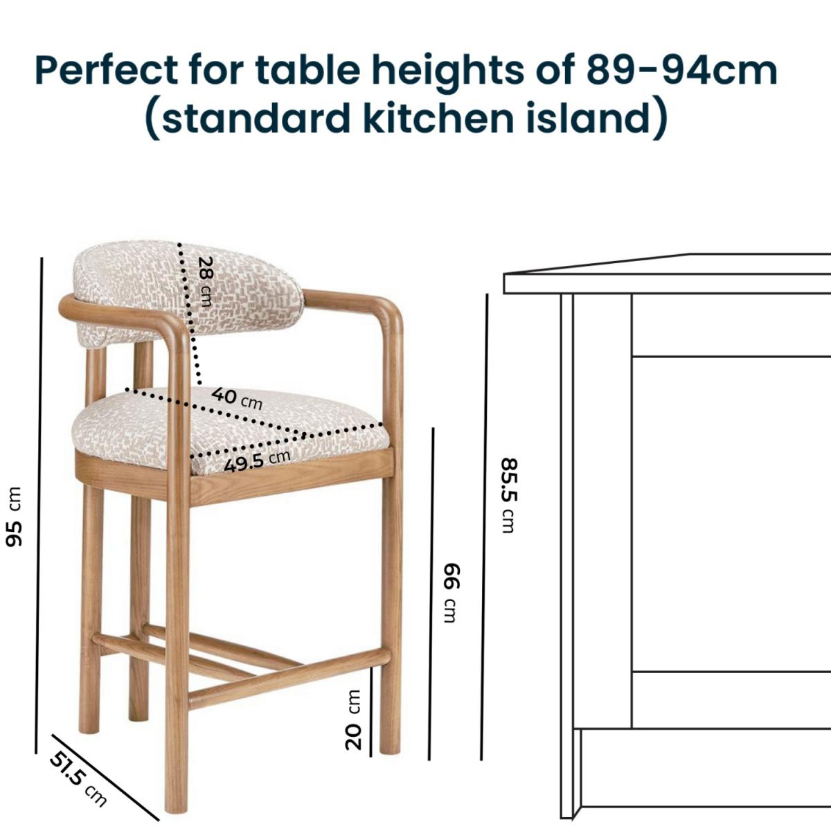 Elegant and versatile, the fabric complements any interior decor with its refined texture and tone. Crafted for durability and support, the natural wood finish enhances the stool’s sophisticated appeal. Adds a modern and unique design element, making the stools stand out in any dining space. Designed with comfort in mind, the armrests and backrest ensure a relaxed dining experience. Blends seamlessly with both modern and traditional interiors, offering flexibility in styling your space. High-quality materials ensure longevity and performance, even with daily use. Elevate your kitchen island or breakfast bar with the Darla Jacquard Kitchen Counter Stool, where contemporary design meets timeless elegance. Upholstered in neutral textured fabric, this stool exudes sophistication while seamlessly blending with a variety of interior styles. The solid rubberwood legs provide sturdy support and a natural touch, while the exposed back detail adds a unique and modern twist to its design. The Darla kitchen stool combines comfort and style, making it an eye-catching yet practical addition to any dining room. Perfect for everyday use in busy kitchens or dining areas. Designed with the ideal height for standard kitchen counters, they combine practicality with aesthetic charm, making them a smart choice for all kitchens.