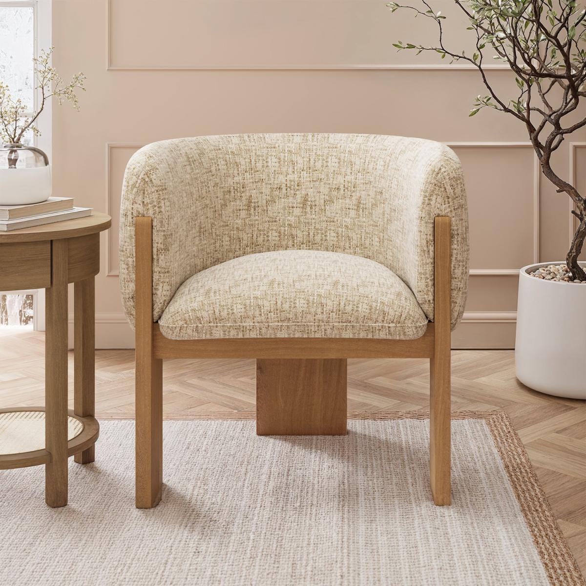 Combining a minimalist look with a warm, inviting feel that effortlessly enhances modern interiors. : Thoughtfully designed with plush, foam-filled cushioning for a cosy and well-supported feel. Soft and durable melange fabric constructed using the hopsack weave. Perfect for living room, bedroom or office, the Scandi-inspired armchair complements any decor. Arrives fully assembled, so you can sit back and relax instantly. Add a Scandi feel and touch of modern elegance to your space with the Jordyn Armchair. Designed for both style and comfort, it features a gently curved backrest and sloped arms, giving you a cosy, wrapped-in feel. The foam-filled seat cushion offers plush comfort, while the soft beige mélange fabric, woven in a classic hopsack weave, adds a lovely touch of texture and warmth. With its clean lines and minimalist charm, this chair fits right in with any modern space.