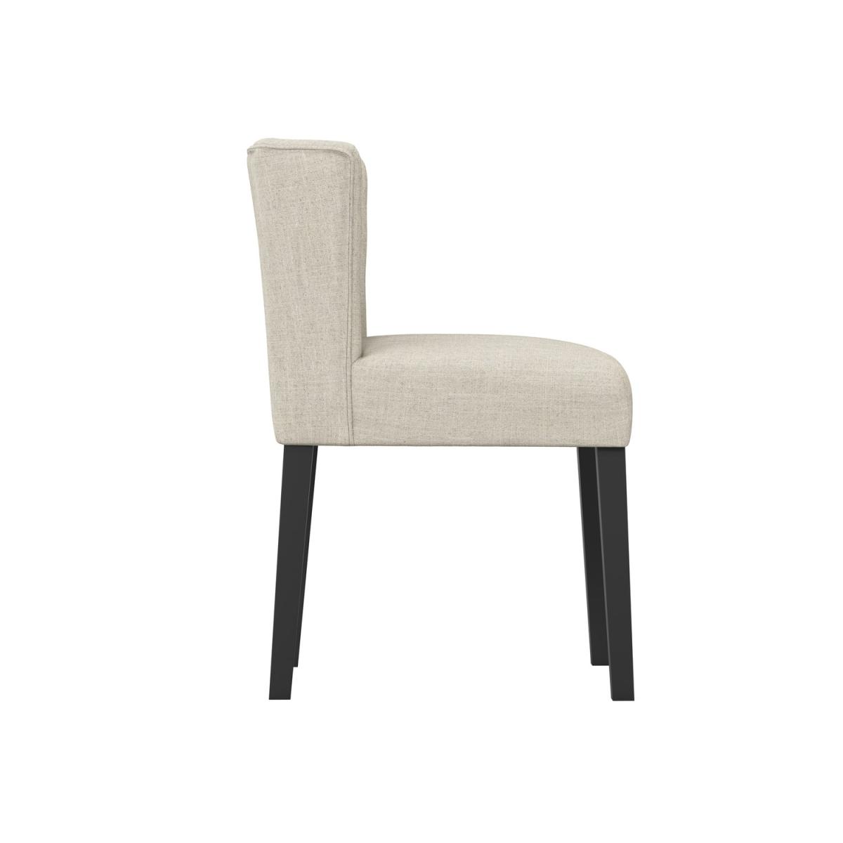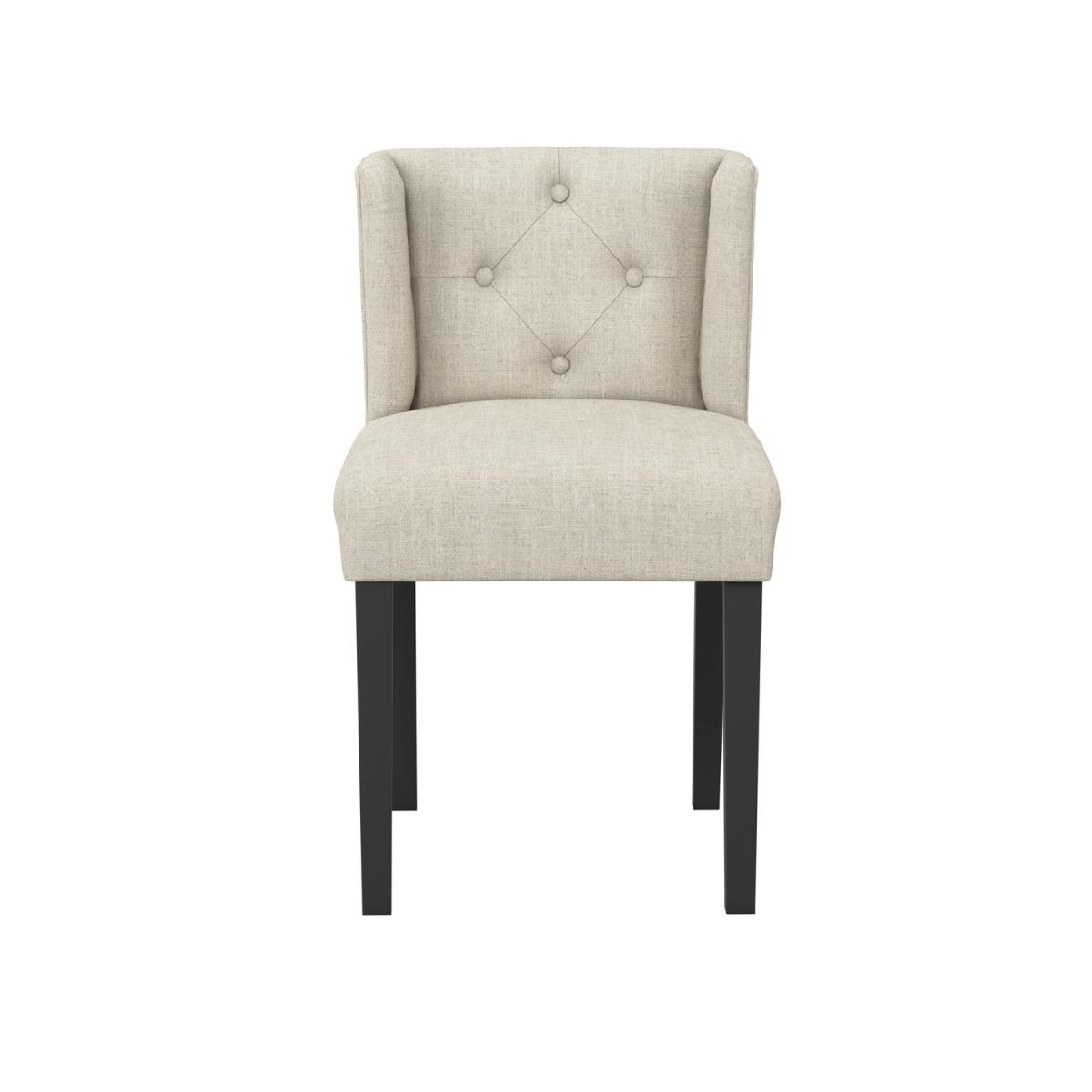 The gently curved winged back provides extra comfort and support, making this chair perfect for gatherings or casual lounging. The chesterfield detailing on the backrest adds a sophisticated touch, elevating the chair’s design and creating a luxurious focal point. The neutral linen fabric and classic design makes this chair suitable for both contemporary and traditional interiors, adding an elegant touch to any room. The black wooden legs offer stability and durability while complementing the neutral fabric, providing a sleek, modern contrast. Whether used at the dining table, as an accent piece in the living room, or in other areas of your home, this chair brings a timeless design that compliments any space and interiors. The Shay dining chair is the perfect blend of style and comfort, making it a standout addition to any dining room or seating area. Featuring a luxurious linen fabric in a neutral beige tone, this chair brings a soft and refined look to your space, ideal for both modern and classic interiors. The winged back provides excellent support and adds an extra touch of sophistication, while the plush buttoned chesterfield design brings a refined, sophisticated aesthetic. The sleek black wooden legs ensure the chairs durability while adding a modern aesthetic to your dining setup. This chair is perfect for family meals and relaxed gatherings. Whether used at your dining table or as an accent piece, this chair is versatile and timeless. Number of chairs: 1 Dimensions:W49 x D57 x H79 cm Weight: 7.8 kg Colour: Beige Finish: Upholstered Material: Linen fabric & solid rubberwood Assembly required: Yes Maximum supported Weight: 120kg Package dimensions:W57 x D47 x H51 cm For domestic use only. Domestically UKFR certified.