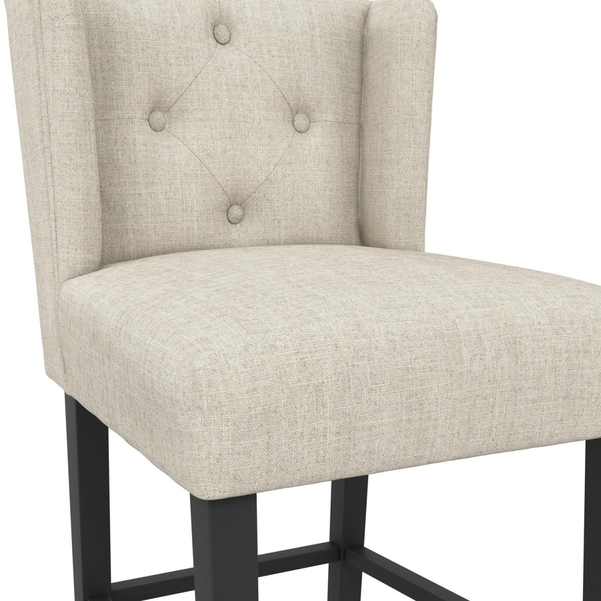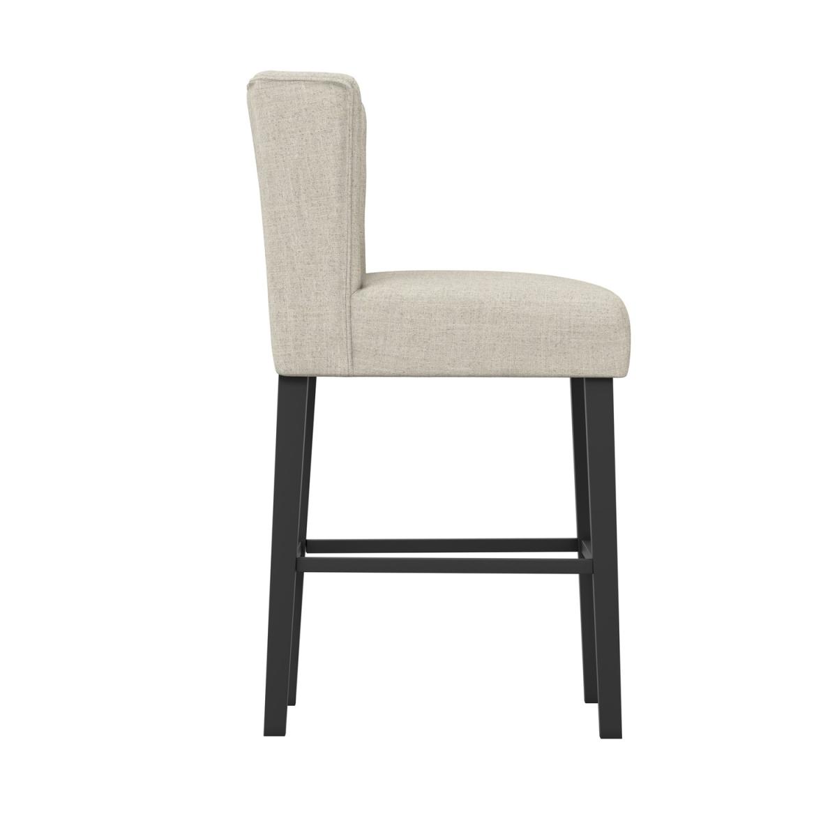 The gently curved winged back provides extra comfort and support, making this chair perfect for gatherings or casual lounging at your bar area. The chesterfield detailing on the backrest adds a sophisticated touch, elevating the chair’s design and creating a luxurious focal point. The neutral linen fabric and classic design makes this chair suitable for both contemporary and traditional interiors, adding an elegant touch to any room. The black wooden legs offer stability and durability while complementing the neutral fabric, providing a sleek, modern contrast. Suitable for everyday meals, casual gatherings, or as an elegant accent in your kitchen or bar area. This Shay bar Stool offers a perfect blend of modern style and elegance, ideal for upgrading your kitchen or bar area. Its neutral beige linen fabric and the chesterfield design provides a sophisticated look. Designed with sturdy black wooden legs, the stool offers both durability and a sleek look that complements a variety of interior styles. The gently curved winged back enhances comfort while adding a chic aesthetic. The Shay Bar Stool is perfect for casual meals or entertaining guests in your bar area. Number of Stools: 1 Dimensions:W49 x D61 x H96 cm Weight: 9.4 kg Colour: Beige Finish: Upholstered Material: Linen Fabric, Rubberwood Assembly required: Yes Maximum Supported Weight: 120kg Packed dimensions: W57.5 x D47.5 x H59 cm For domestic use only. Domestically UKFR certified.