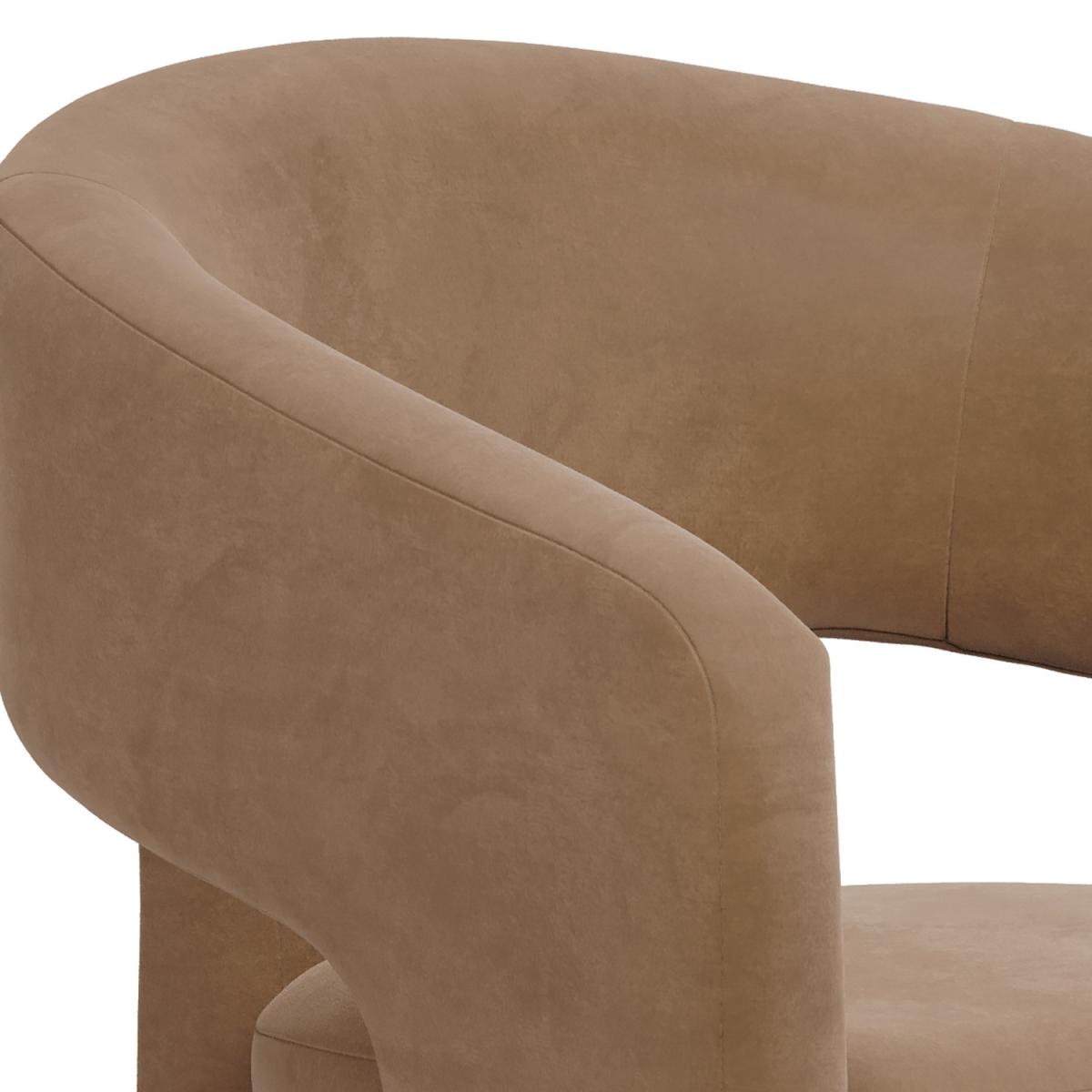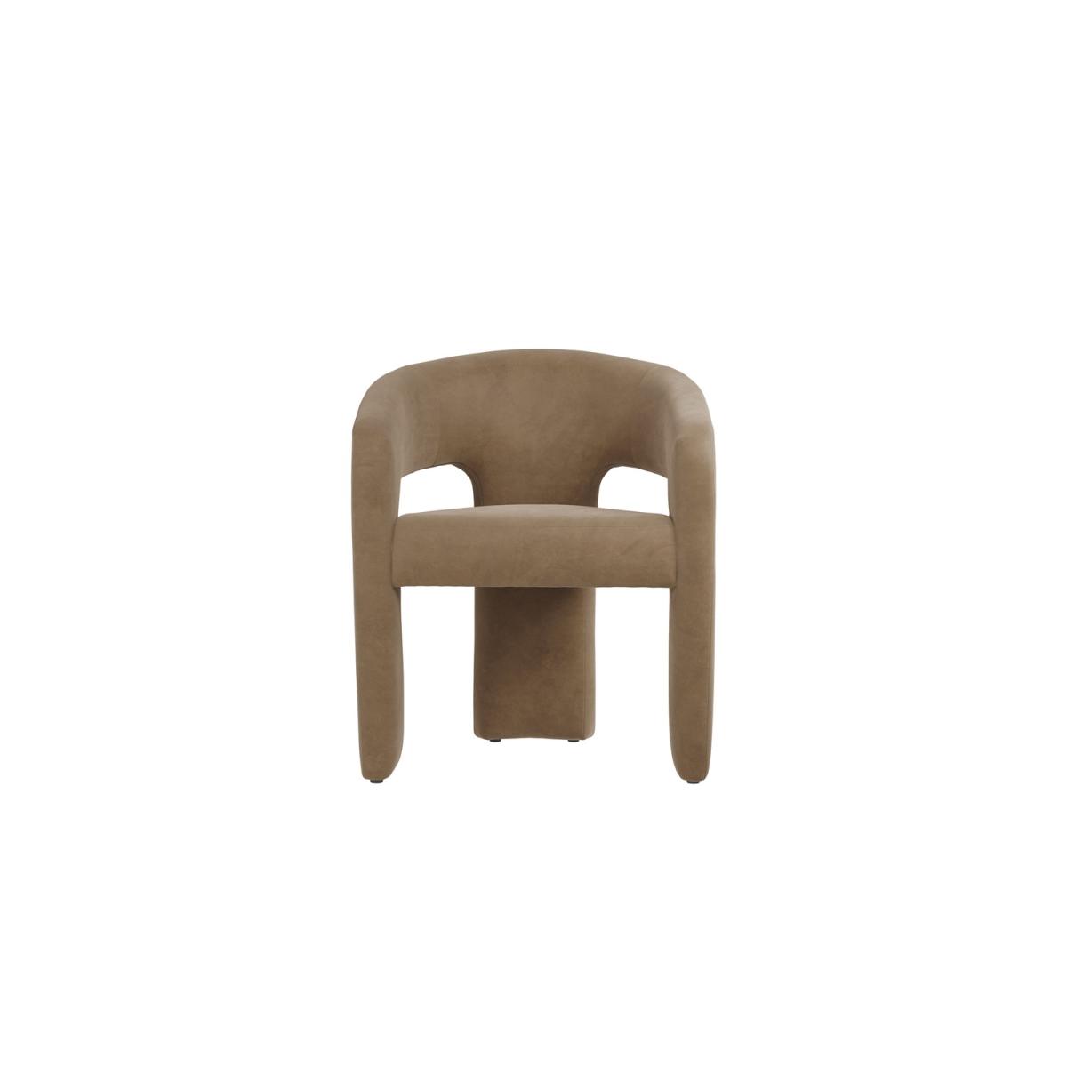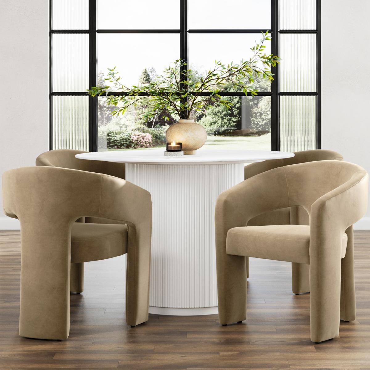 The Alba chair features a sleek, rounded design with cut-out detailing, adding an elegant touch to your dining room. Upholstered in a luxurious, soft beige coloured velvet fabric, the chair provides a plush feel, combining comfort with visual appeal. A curved backrest and padded armrests provide excellent support, ensuring comfort for long meals or extended seating. Whether placed around a dining table for a complete set or used as an accent chair in a living room or hallway, this chair is a versatile piece for any room. Designed with comfort in mind, the Alba dining chair ensures a supportive and luxury comfort perfect for gatherings or family meals. The Alba Dining Chair adds modern elegance and comfort to any dining space. Fully upholstered in a luxurious, soft beige velvet, this chair offers both comfort and style, with its plush fabric ensuring luxury comfort at the dining table. The sleek, curved design, complemented by subtle cut-out detailing, adds an elegant touch that elevates its overall aesthetic. Its versatile design makes it perfect for a range of interiors, effortlessly blending in and enhancing the room. Whether used as a set around your dining table or as a standalone accent chair, the Alba Dining Chair adds a contemporary appeal to your home while providing the support and comfort needed for long meals or relaxed gatherings. Number of chairs: 1 Dimensions:W59 x D52.5 x H75 cm Weight: 9 kg Colour: Beige Finish: Fully Upholstered Material: Velvet Assembly required: Yes Maximum Supported Load: 120kg Package dimensions:W58 x D62 x H79 cm For domestic use only. Domestically UKFR certified.