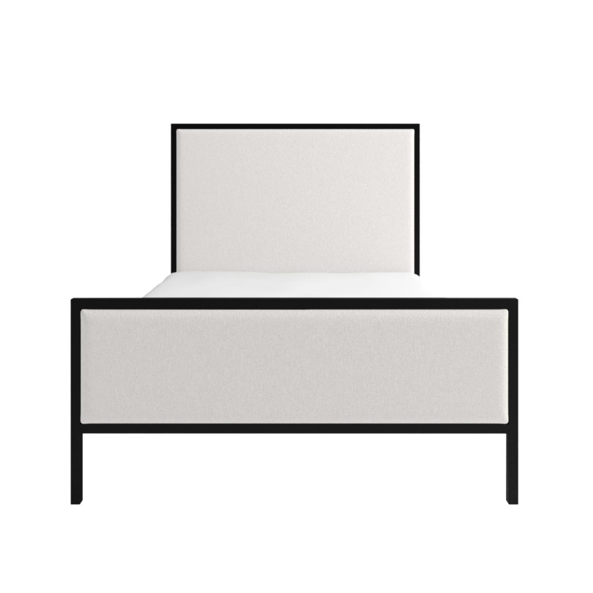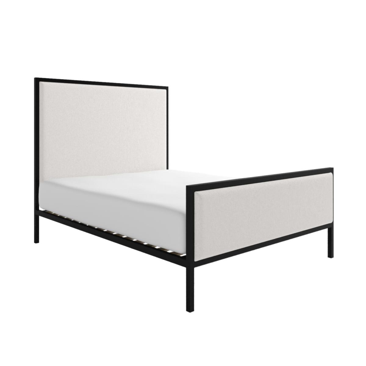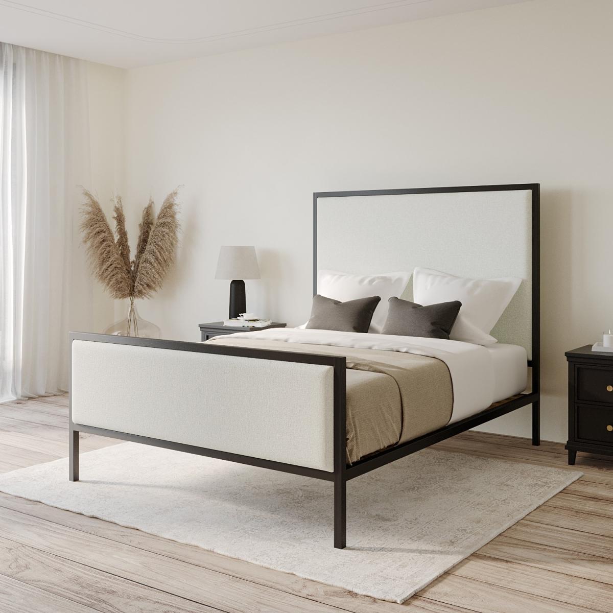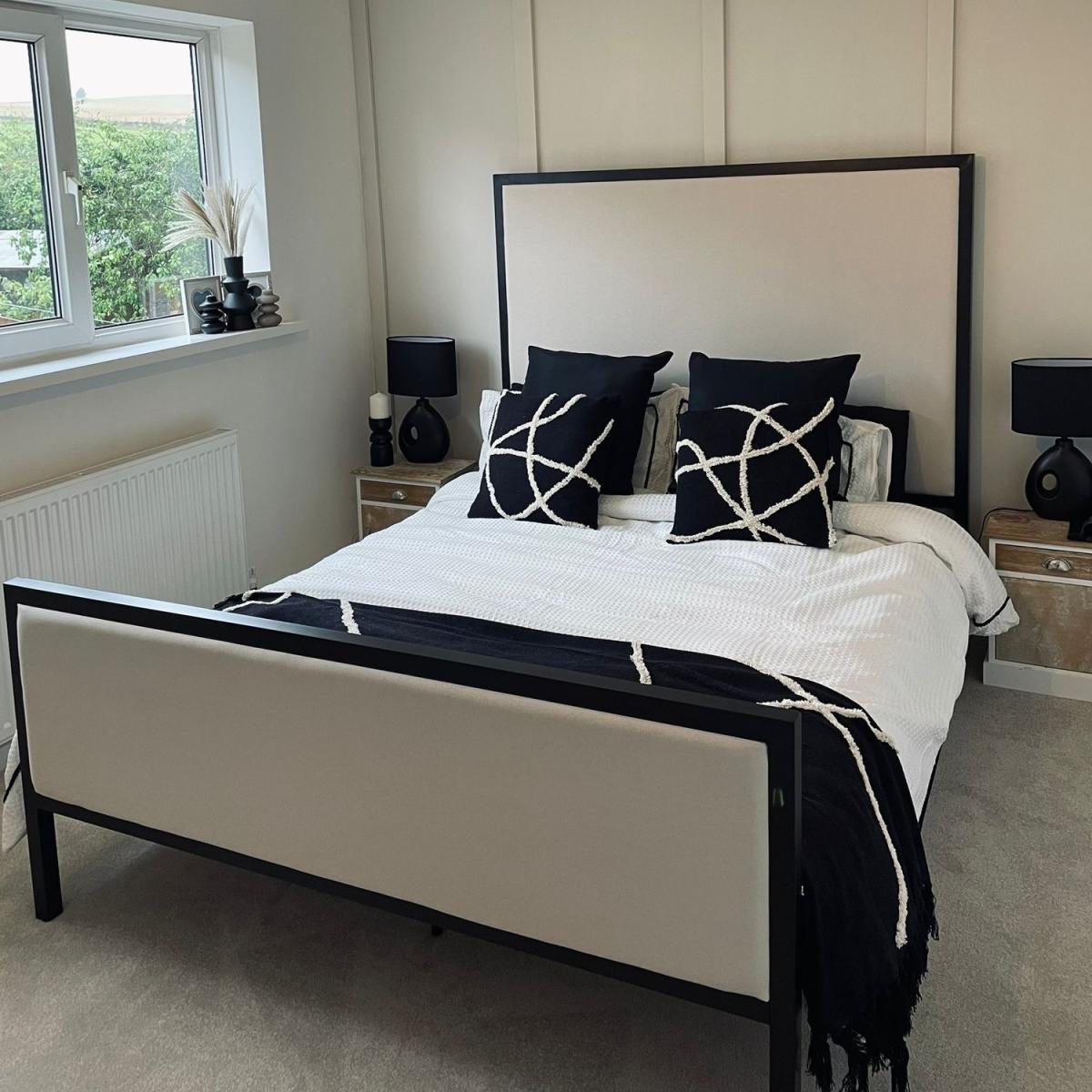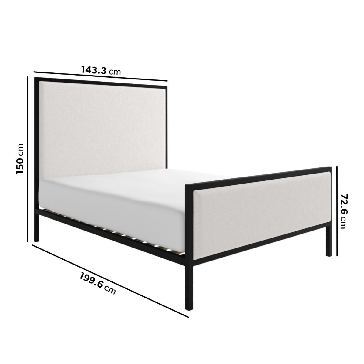 Features we love Double bed with beige upholstered headboard Black metal frame gives stylish two-tone contrast Contemporary design complements any interior Sprung-slatted base for ultimate comfort and support Receive 10% of your perfect mattress with this bed All about me Make a timeless statement in your bedroom with the Alexandra double bed. Its upholstered beige fabric headboard is framed with chic black metal to create a stylish two-tone design. The sprung-slatted base ensures optimum support and a comfortable night's sleep. It fits a standard UK double mattress, which is not included, allowing you to choose the perfect mattress for your comfort. Need to know Dimensions:W143 x D200 x H150 cm Finish: Upholstered Material:Woven fabric Colour: Beige and black Frame: Metal Base: Sprung-slatted Product weight: 45kg Maximum weight capacity: 120kg Assembly Required:Yes Mattress Included: No Mattress Size Required: UK double (4ft6/135x190cm) Packaging Dimensions: Box 1: W157 x D150 x H13 cm. Box 2: W190 x D203 x H13 cm Packaging weights: Box1: 33.9kg, Box2: 16.8kg