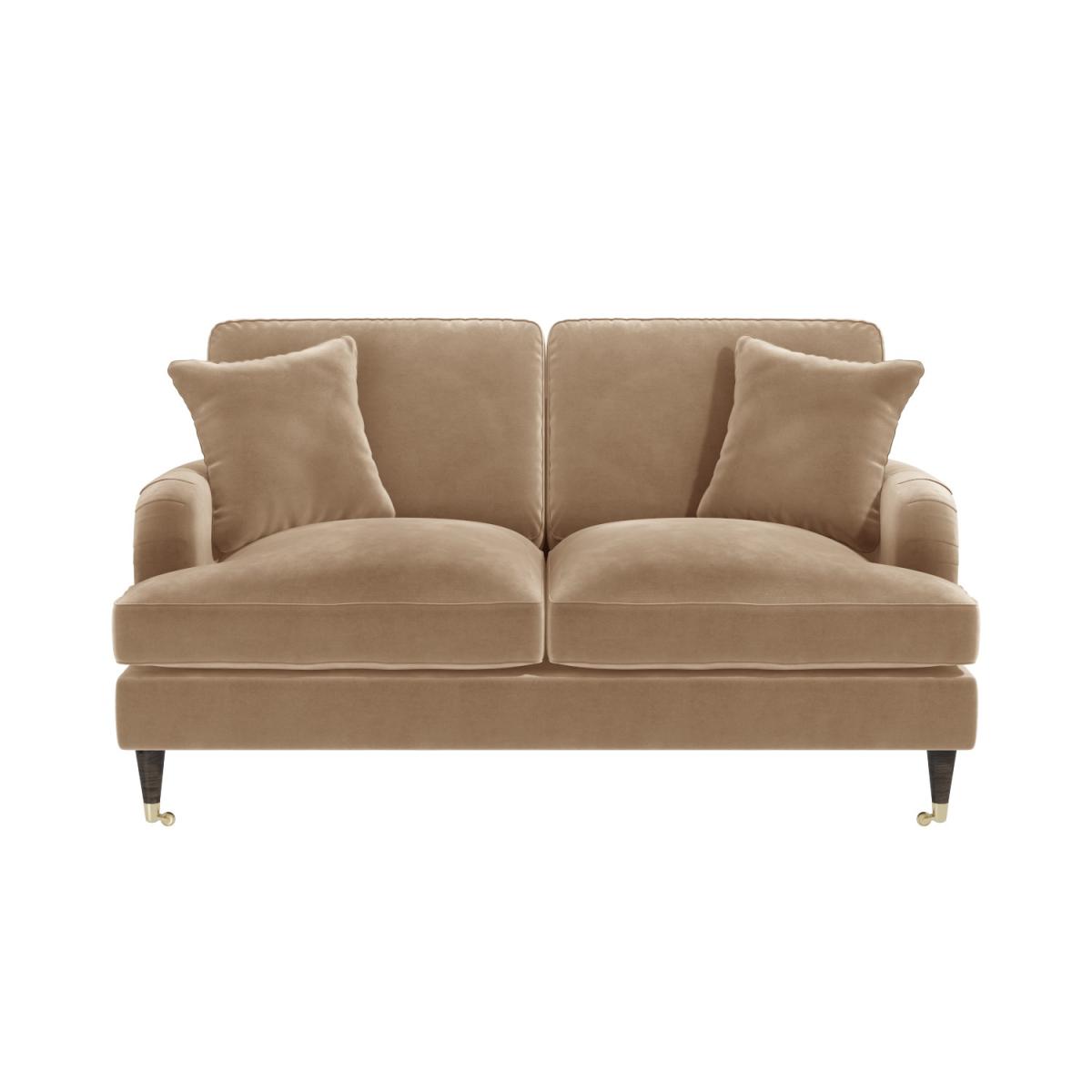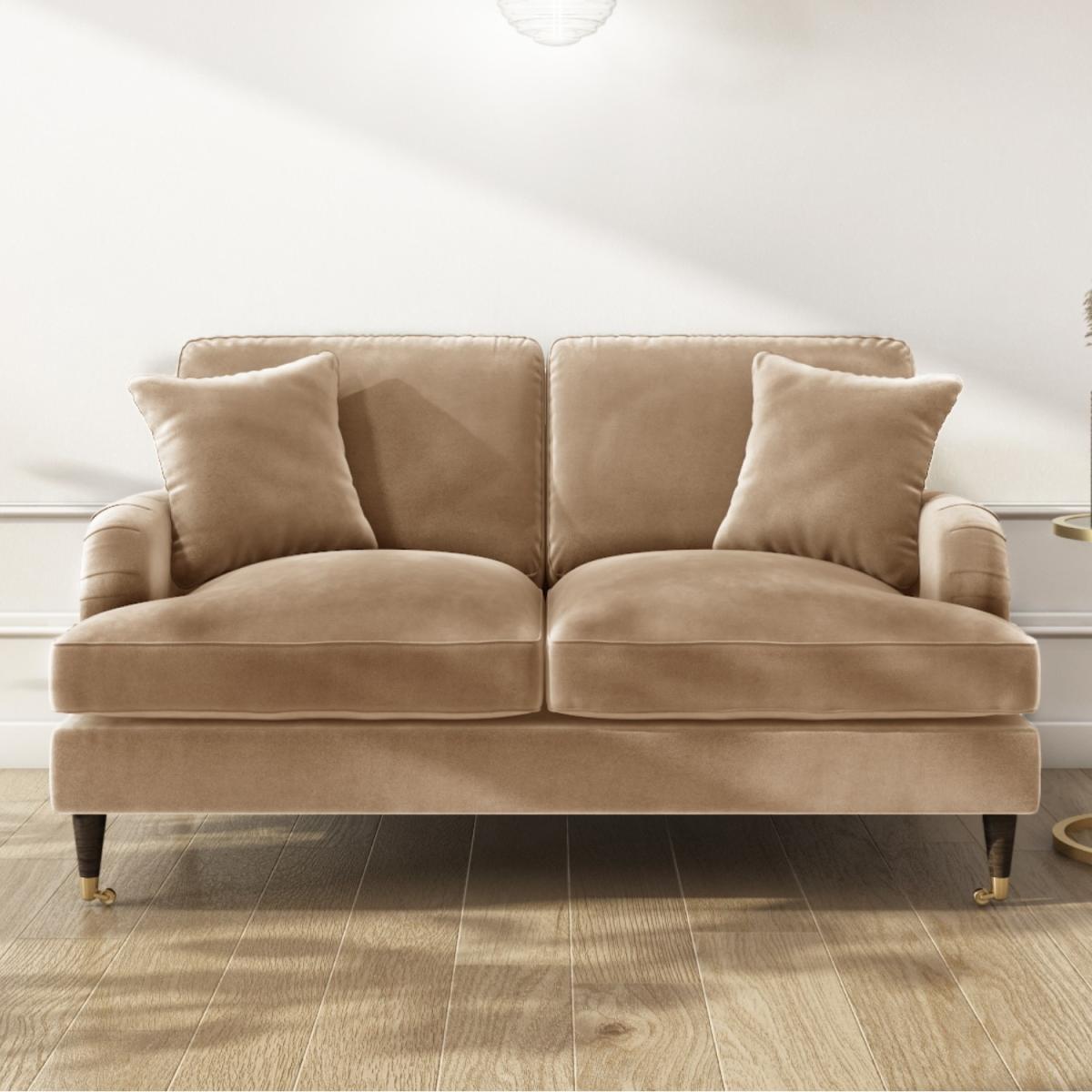 Features we love Beautifully upholstered in soft-to-touch velvet The beige velvet finish brings a touch of luxury Modern silhouette with saddle arms and tailored piping Deep seating with two matching throw cushions Dark wood legs with front castors for easy placement. All cushions are filled with comfortable spongey foam Removable cushion covers – use a damp cloth to clean Minimum assembly – just attach the legs All about me Discover maximum comfort and minimum maintenance with this gorgeous sofa. This plush Payton two-seater sofa offers traditional styling with a modern twist thanks to its dark wooden legs with gold accent front castors and classic ruched saddle arms. Beautifully tailored and upholstered in a warm beige it brings a splash of natural warmth to your living space making it the perfect statement piece. It comfortably seats three and comes accompanied with two matching throw cushions which add a final flourish of elegance. Adding this trend-setting piece to your home is easy. There's minimum assembly; it's just a case of fixing the legs into position. Need to know. Overall dimensions. H85 x W150 x D96 cm Seating dimensions. W124 x D60 cm Packed dimensions. No. of Boxes 1 - Weight 50kg – H61 x W152 x D98 cm Colour. Beige Finish. Velvet upholstery and wooden legs Material. Opulence velvet (100% polyester) wooden frame and legs and metal castors Filling. Foam Assembly required. Yes.