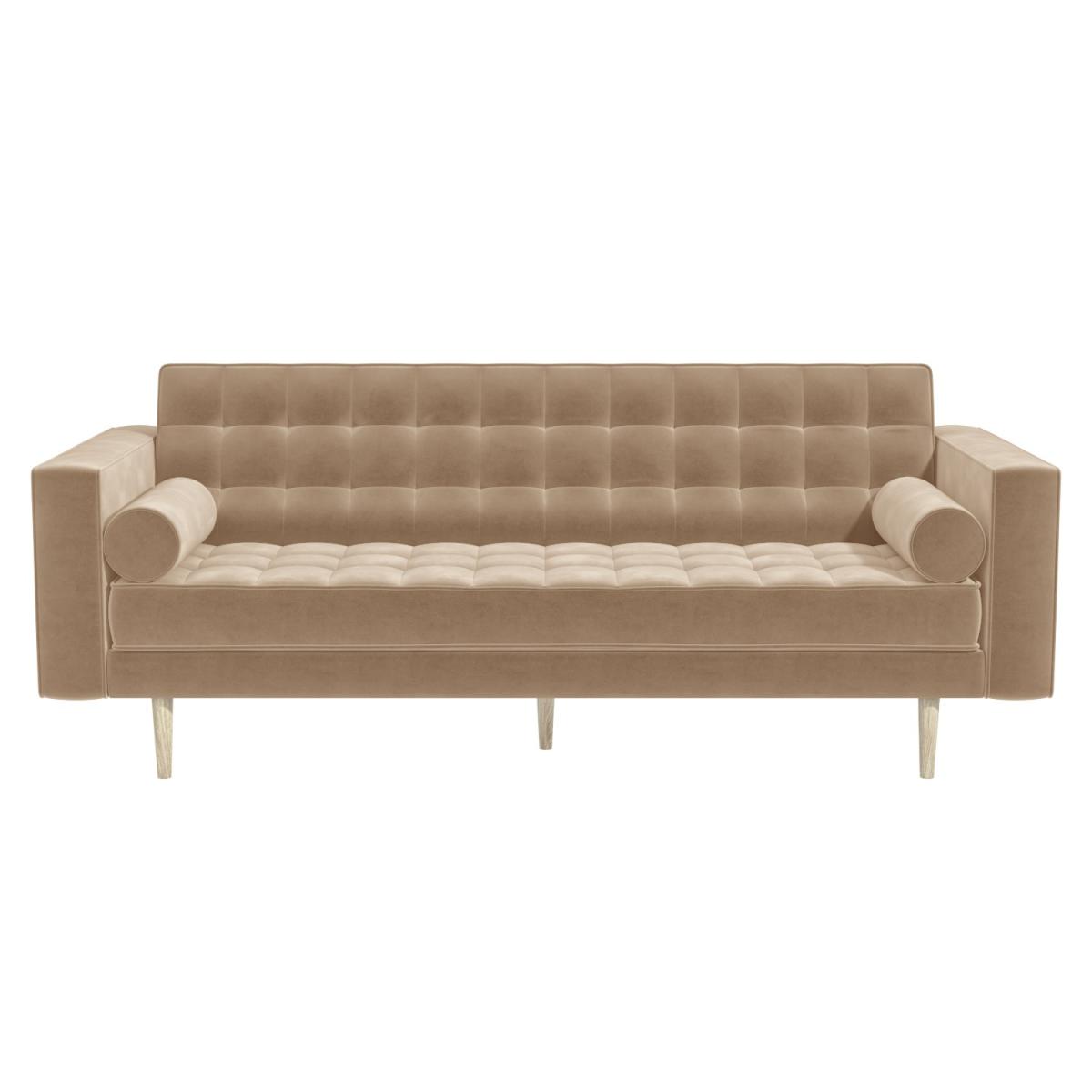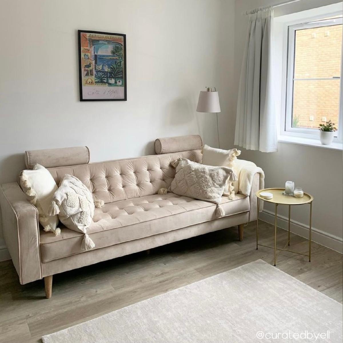 Features we love Mid-century inspired design with a fresh and modern twist Discover supreme comfort with this gorgeous foam-filled sofa. Double piping and deep button detailing incorporate a touch of traditional styling. Sophisticated beige velvet finish. Tapered whitewash wood legs contrast beautifully keeping the design fresh. Included bolster cushions add comfort and elegance All about me. The Elba 3 seater sofa is a beautiful combination of classic and contemporary styling. Discover maximum comfort and minimum maintenance with this gorgeous foam-filled sofa. The clean square lines are inspired by the mid-century whilst the double piping and buttoned back add just the right amount of opulence. The clean arms and tall tapered legs in a contrasting whitewash wood keeps the design fresh. It's finished beautifully in a sophisticated beige velvet. The sofa has been carefully crafted with a combination of tough materials so you can rest easy. The frame has been made using solid eucalyptus wood and thick plywood. Whilst the interior consists of S springs and quality foam to create a durable and comfortable platform. The design sits upon solid birch legs in washed oak effect which contrasts the neutral beige finish beautifully whilst giving the sofa a floating effect that is ideal for enhancing the look of space in smaller rooms. The sofa is complete with two bolster cushions adding that finishing touch of luxury and comfort. The sofa will require minor assembly it shouldn't take longer than 20 minutes as it's simply a case of fixing the tapered legs into position. Need to know. Dimensions. H78 x W209 x D85 cm Packed Dimensions. No. of Boxes 1 - Weight 48kg - H49 x W210 x D87 cm Material. Solid birch solid eucalyptus wood and; thick plywood Finish. Beige Velvet Filling. Foam Assembly required. Yes – less than 20 minutes.