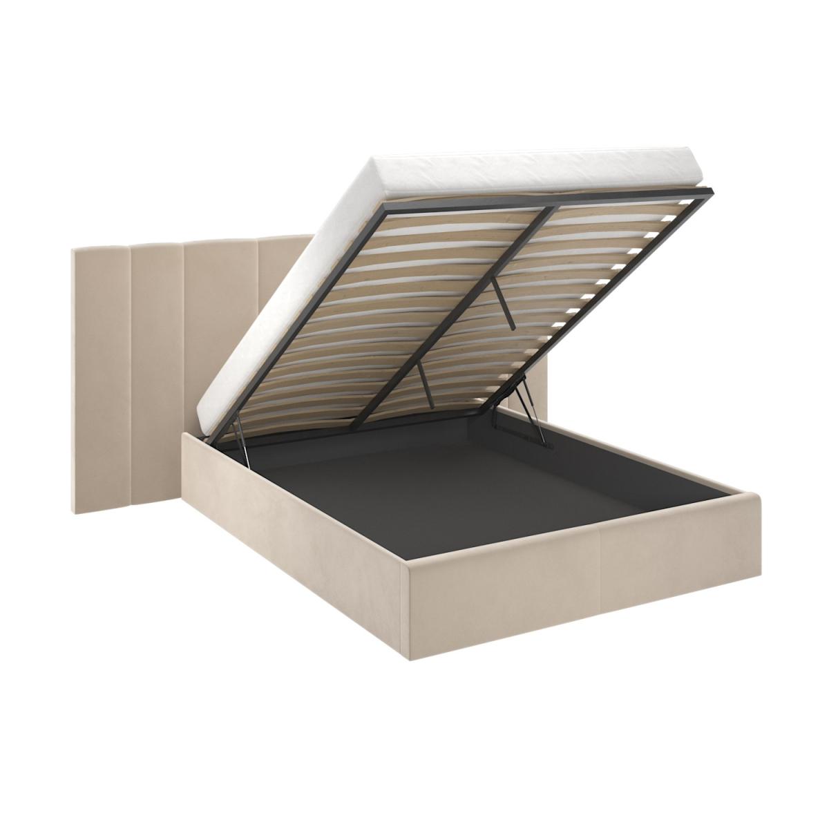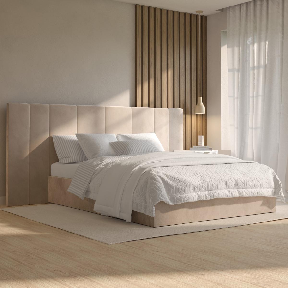 All about me Upgrade your master bedroom with this luxurious Iman bed frame. Enhanced by the long and wide feature headboard and plush padding, it'll instantly elevate any interior. With easy-access storage and a fabric base to protect items from dust, it's functional as well as stylish and comfortable. With a sturdy wood frame construction, it's built to last. Plus, it's sprung-slatted for ultimate comfort and fits a UK standard double mattress. Save 10% off your perfect mattress when bought with this bed Need to know Product dimensions:W244 x D207 x H112 cm Product weight: 43.3kg Bed mattress size: Standard UK Double (4ft 6”) Colour: Beige Finish: Upholstered Material: Wood, solid wood combination, metal, foam, fabric/Velcro base and velvet Bed base: Sprung-slatted Assembly required: Yes Mattress included: No Packaging dimensions: Box 1: W114 x D145.5 x H13 cm / Box 2: W26 x D196 x H15.5 cm Packaging weights: Box 1: 27.5kg / Box 2: 19.8kg