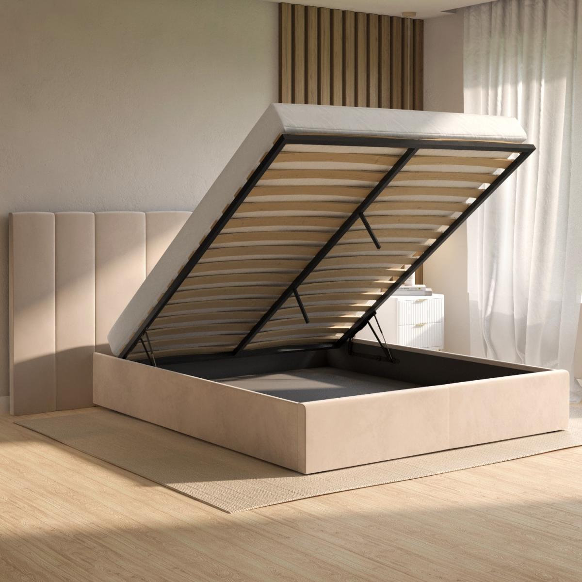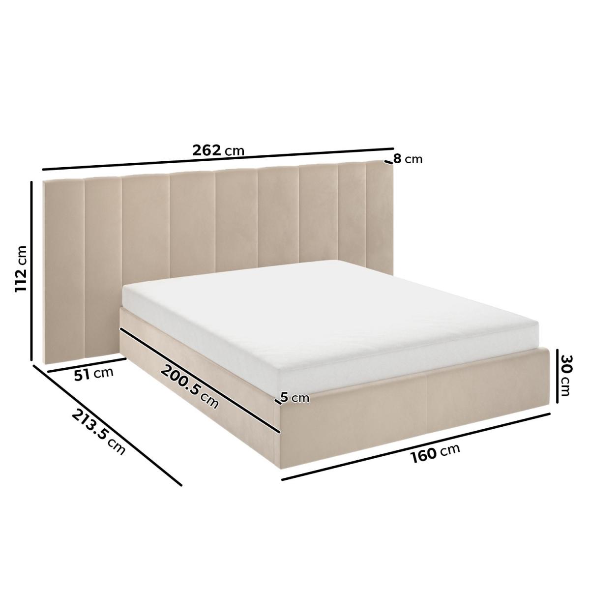 All about me Upgrade your master bedroom with this luxurious Iman bed frame. Enhanced by the long and wide feature headboard and plush padding, it'll instantly elevate any interior. With easy-access storage and a fabric base to protect items from dust, it's functional as well as stylish and comfortable. With a sturdy wood frame construction, it's built to last. Plus, it's sprung-slatted for ultimate comfort and fits a UK standard king-size mattress. Save 10% off your perfect mattress when bought with this bed Need to know Product dimensions: W260 x D214.5 x H112 cm Product weight: 52.1kg Bed mattress size: Standard UK King (150 x 200cm / 5ft) Colour: Beige Finish: Upholstered Material: Wood, solid wood combination, metal, foam, fabric/Velcro base and velvet Bed base: Sprung-slatted Assembly required: Yes Mattress included: No Packaging dimensions: Box 1: W114 x D161.5 x H13 cm / Box 2: W26 x D203.5 x H15.5 cm Packaging weights: Box 1: 33.6kg / Box 2: 22.5kg