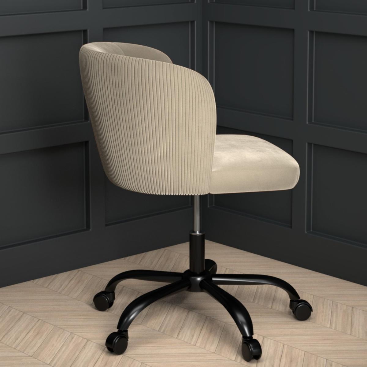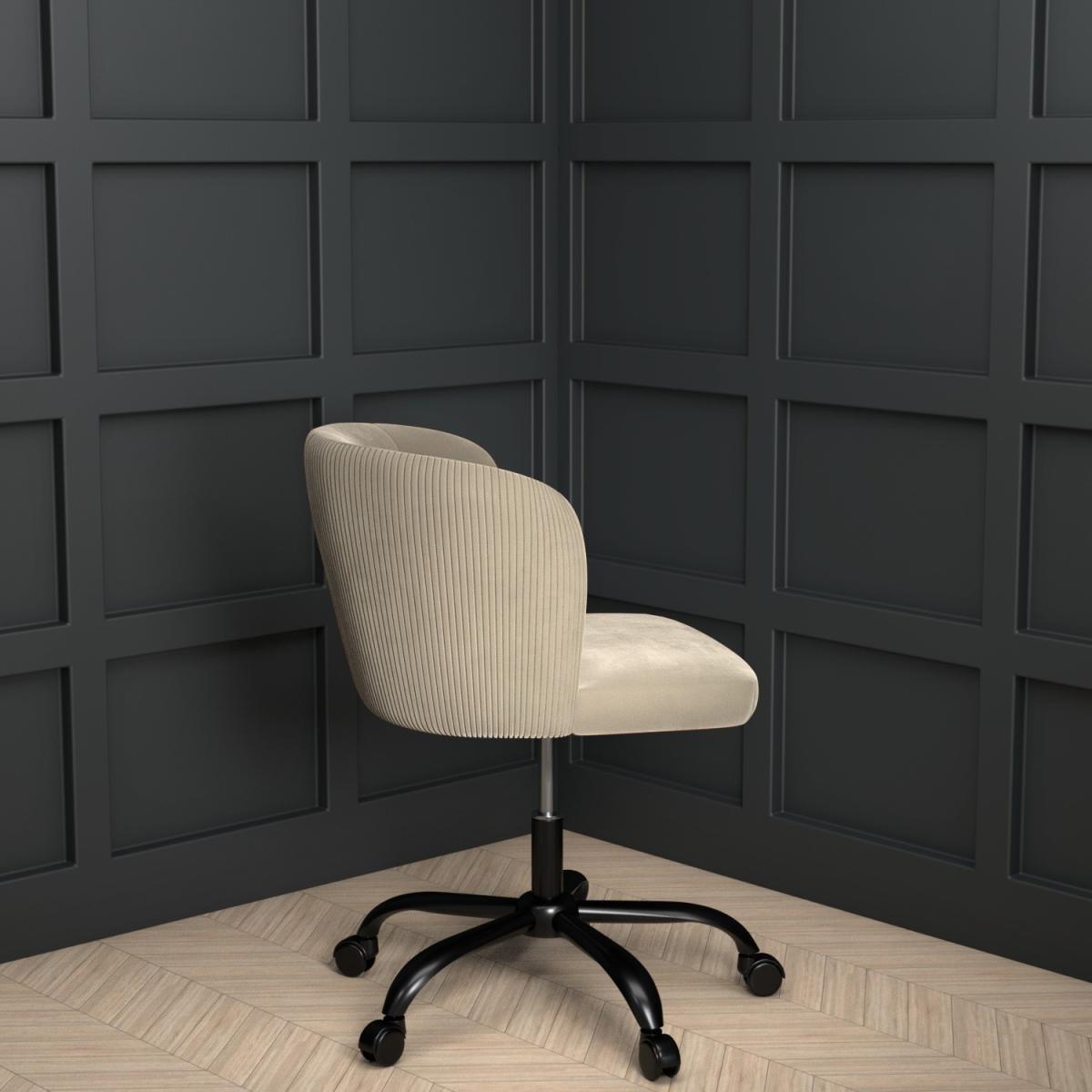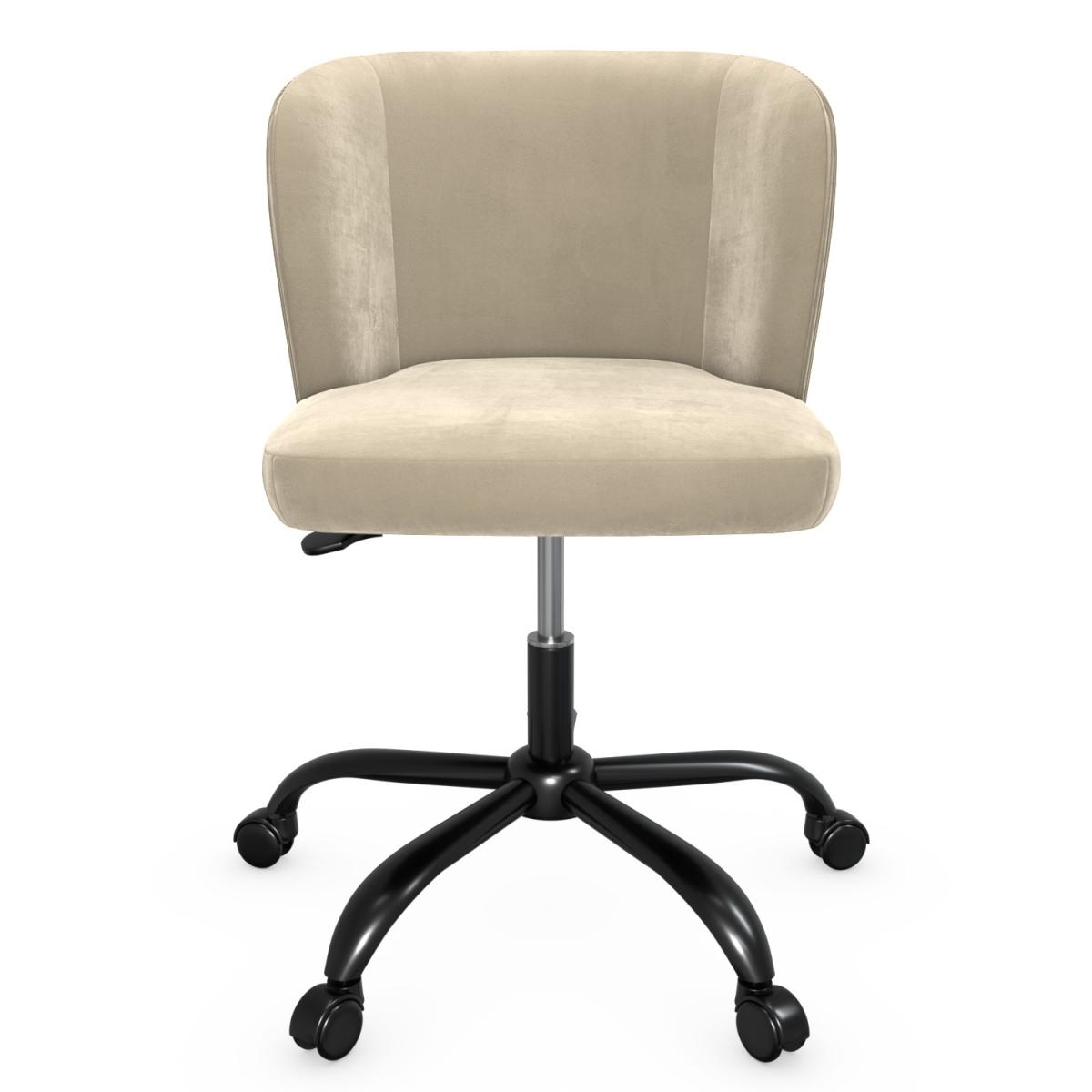 Features we love It adds a luxurious touch to any home office. Upholstered in a beige velvet it’ll coordinate easily. With contrasting black legs and stunning pleated back360-degree swivel gives you freedom while you work. Curved backrest offers comfort and ample back supportGas-lift mechanism ensures the perfect height position. Made to last thanks to its sturdy steel construction Need to know. Dimensions. H75.5-82.5 x W58 x D64 cm Colour. Beige and black Finish. Velvet and painted (legs) Material. Velvet upholstery foam and steel For use. Indoors Weight. 8kg Assembly required. Yes (just the legs) Range. Holly.