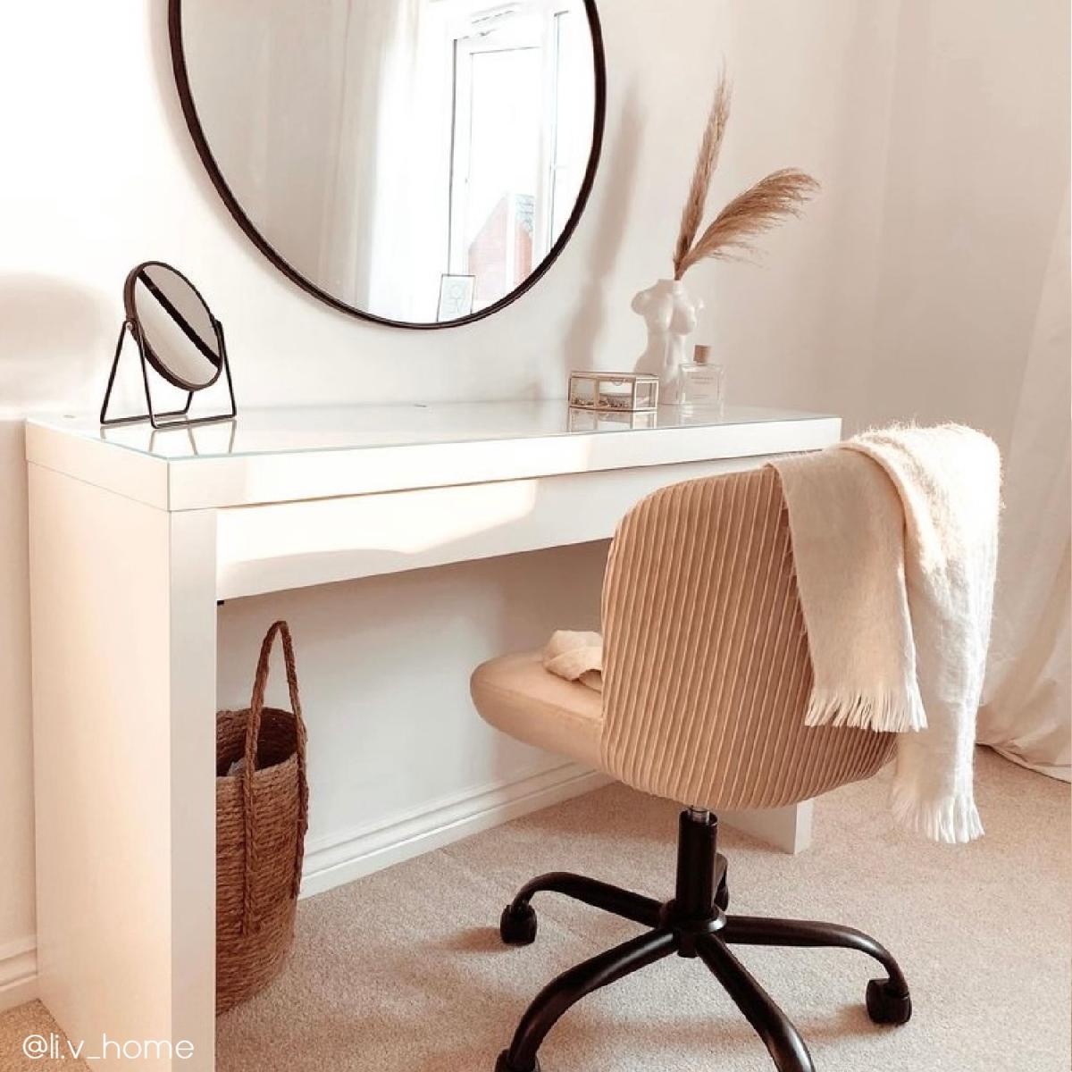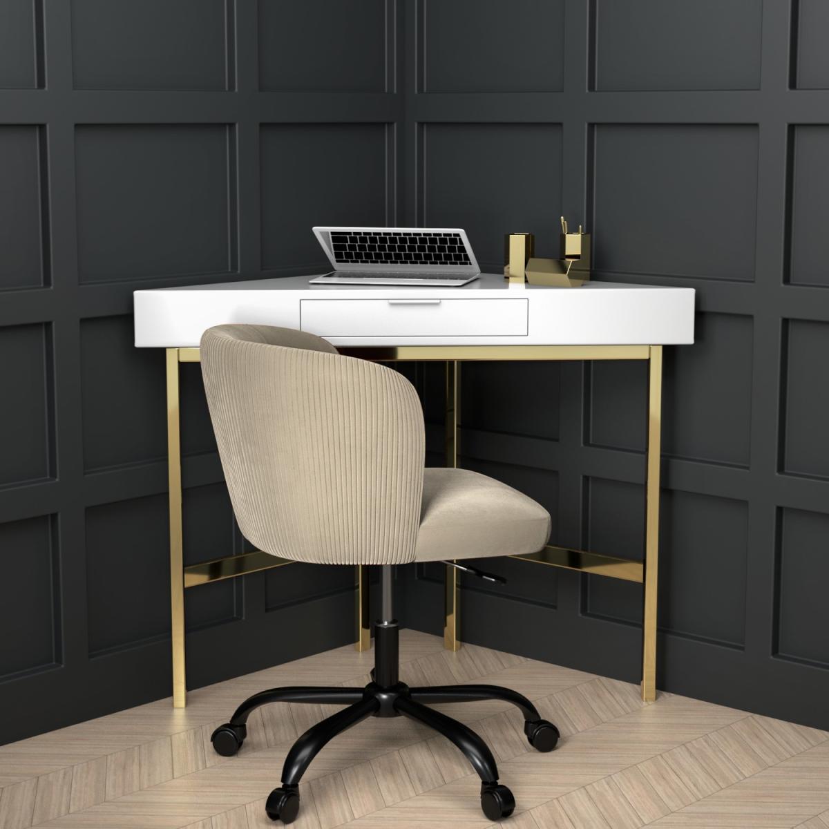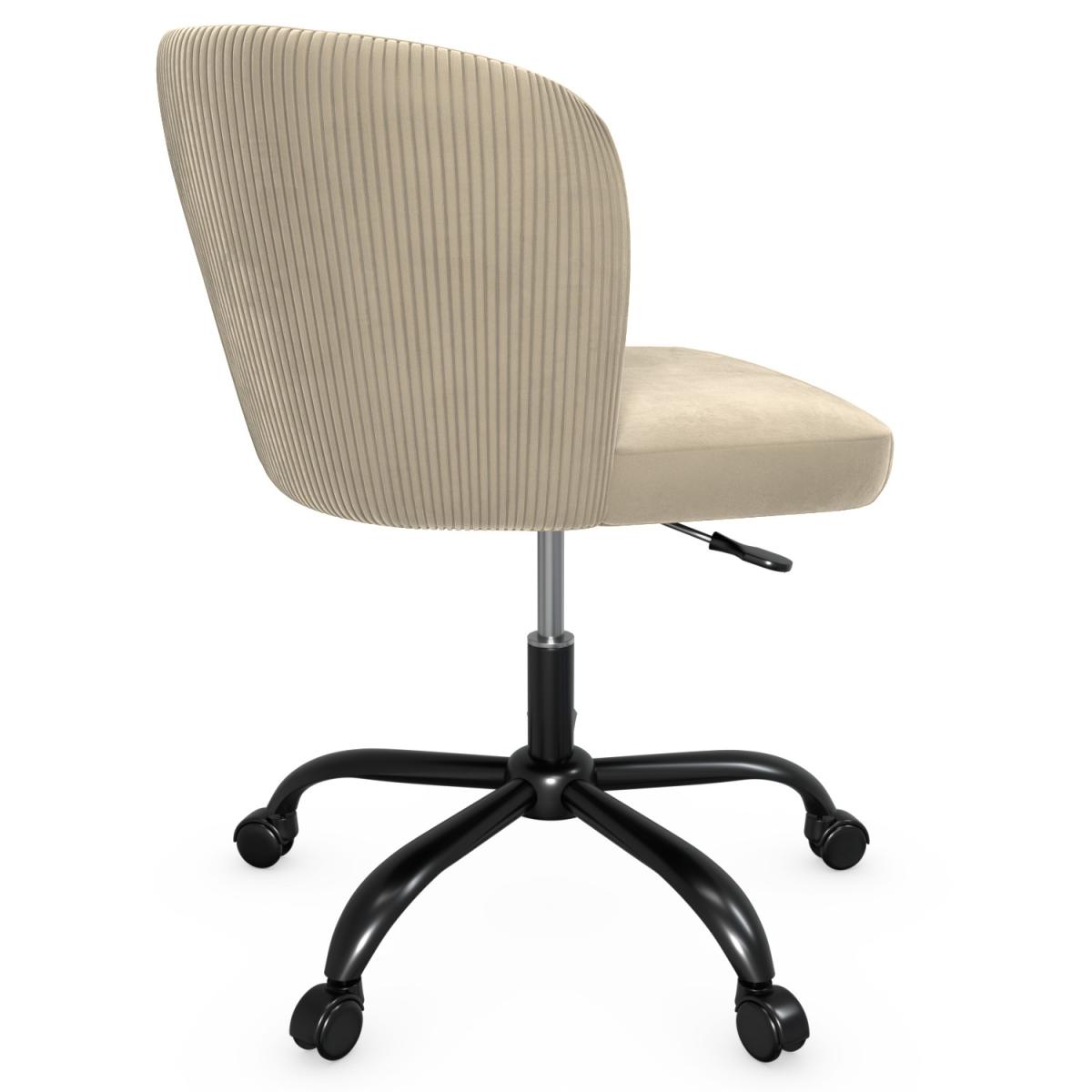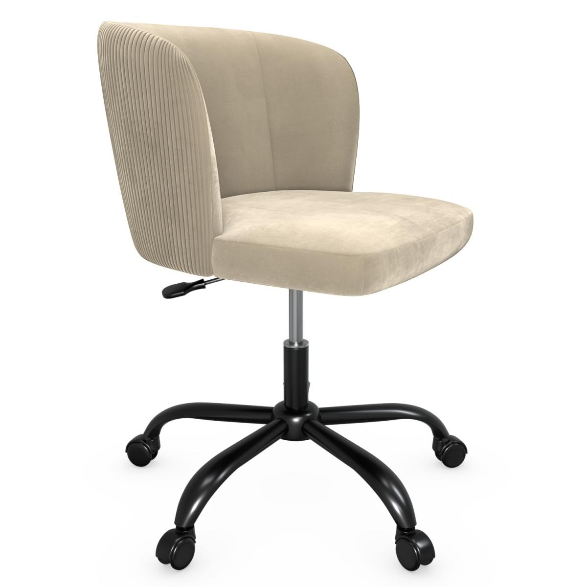 Features we love It adds a luxurious touch to any home office. Upholstered in a beige velvet it’ll coordinate easily. With contrasting black legs and stunning pleated back360-degree swivel gives you freedom while you work. Curved backrest offers comfort and ample back supportGas-lift mechanism ensures the perfect height position. Made to last thanks to its sturdy steel construction Need to know. Dimensions. H75.5-82.5 x W58 x D64 cm Colour. Beige and black Finish. Velvet and painted (legs) Material. Velvet upholstery foam and steel For use. Indoors Weight. 8kg Assembly required. Yes (just the legs) Range. Holly.
