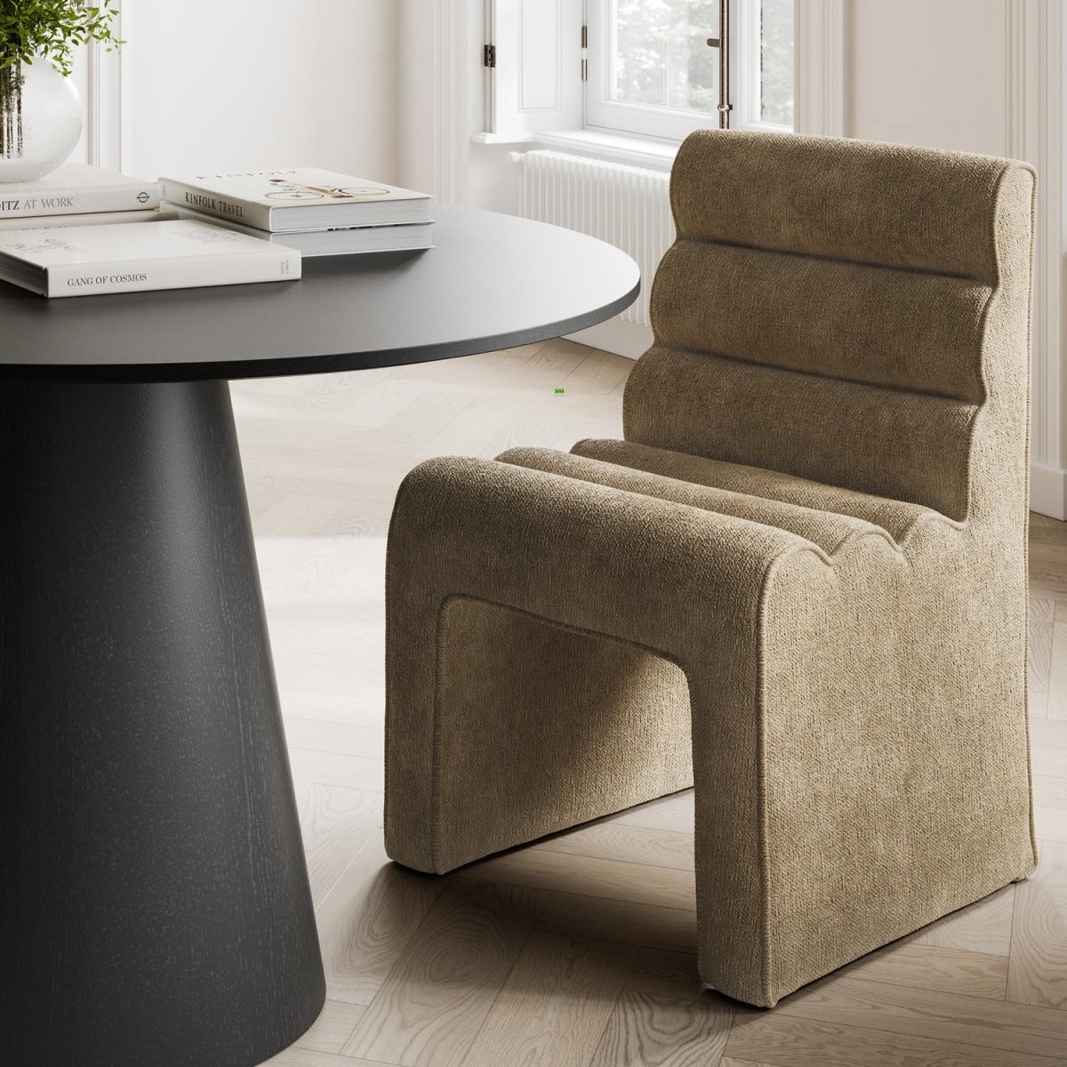 Soft to touch beige chenille upholstery provides a sophisticated touch, perfect for any modern dining space. The unique ribbed design is a standout focal point in your dining space and provides comfort. Its unique shape creates a statement in any room, blending effortlessly with any decor. Easily complements a variety of dining tables, adding elegance and sophistication to your home. The Nami dining chair is a perfect combination of luxury and comfort. Upholstered in beige chenille fabric, this chair features a ribbed and contoured backrest and seat that offer both style and comfort. The sculptural design and smooth, curved silhouette bring an elegant, modern touch to any dining space. Its sturdy and durable which ensures long-lasting durability while providing support, making it an ideal seating choice for both everyday meals and special occasions. The Nami chair effortlessly enhances your dining area with its chic look. Number of chairs: 1 Dimensions:W55.5 x D62.5 x H85.5 cm Weight: 13 kg Maximum Supported Weight: 81kg Colour: Beige Finish: Fully Upholstered Material: Velvet Assembly required: No Package dimensions:W55.5 x D64 x H88 cm For domestic use only. Domestically UKFR certified.