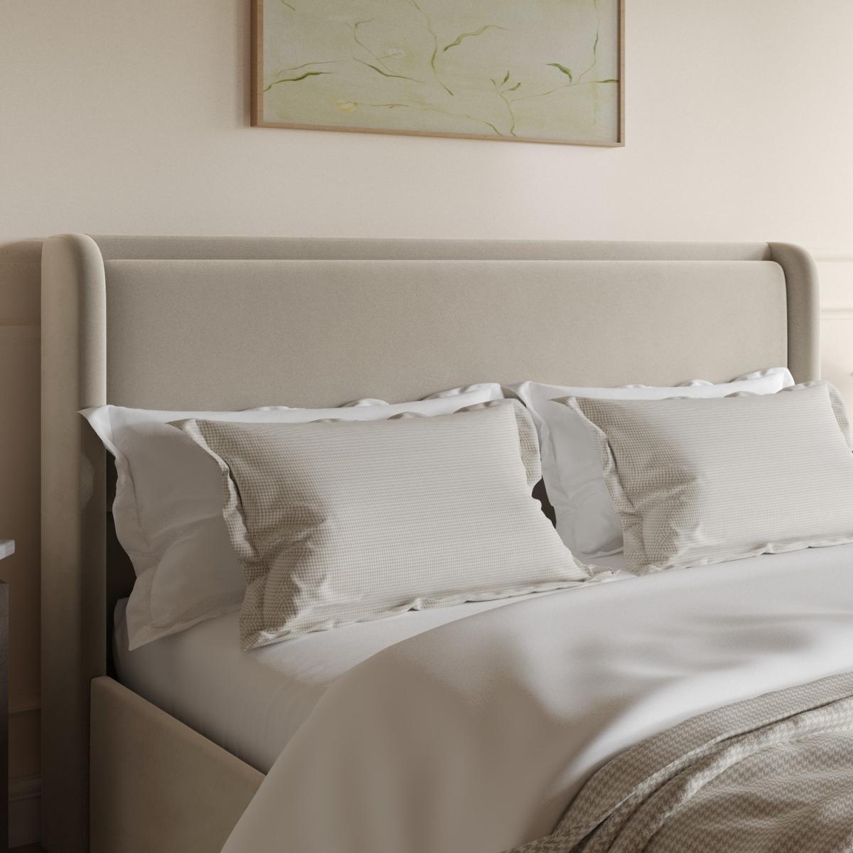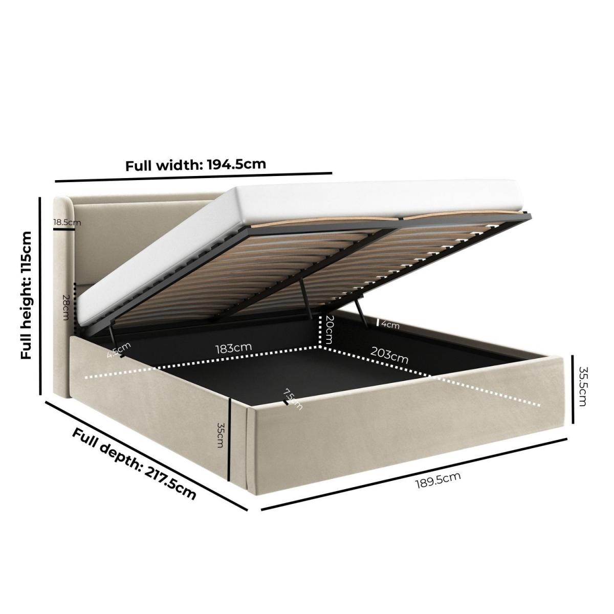 The plush, pillow-style winged headboard adds a touch of modern elegance and luxury to your bedroom. Clean lines and subtly rounded edges create a timeless, versatile style that complements both contemporary and traditional interiors. Upholstered in soft, luxurious beige velvet that effortlessly complements a wide range of interior styles. Convenient storage space accessible via a smooth gas-lift mechanism, ideal for bedding, pillows, or seasonal items. Offers exceptional mattress support while promoting airflow for enhanced comfort and durability. The Frida Ottoman Bed blends modern functionality with timeless style. Upholstered in a neutral beige velvet, its plush, pillow-style winged headboard creates a luxurious focal point that invites relaxation, making it the perfect statement piece for any bedroom. The clean lines and gently rounded edges give it a minimalist aesthetic. Designed with spacious storage, the bed has an end-opening gas-lift mechanism for easy access to a spacious, fabric-lined storage compartment. The sprung slatted base provides enhanced mattress support and ventilation. This bed fits a UK standard super king mattress.