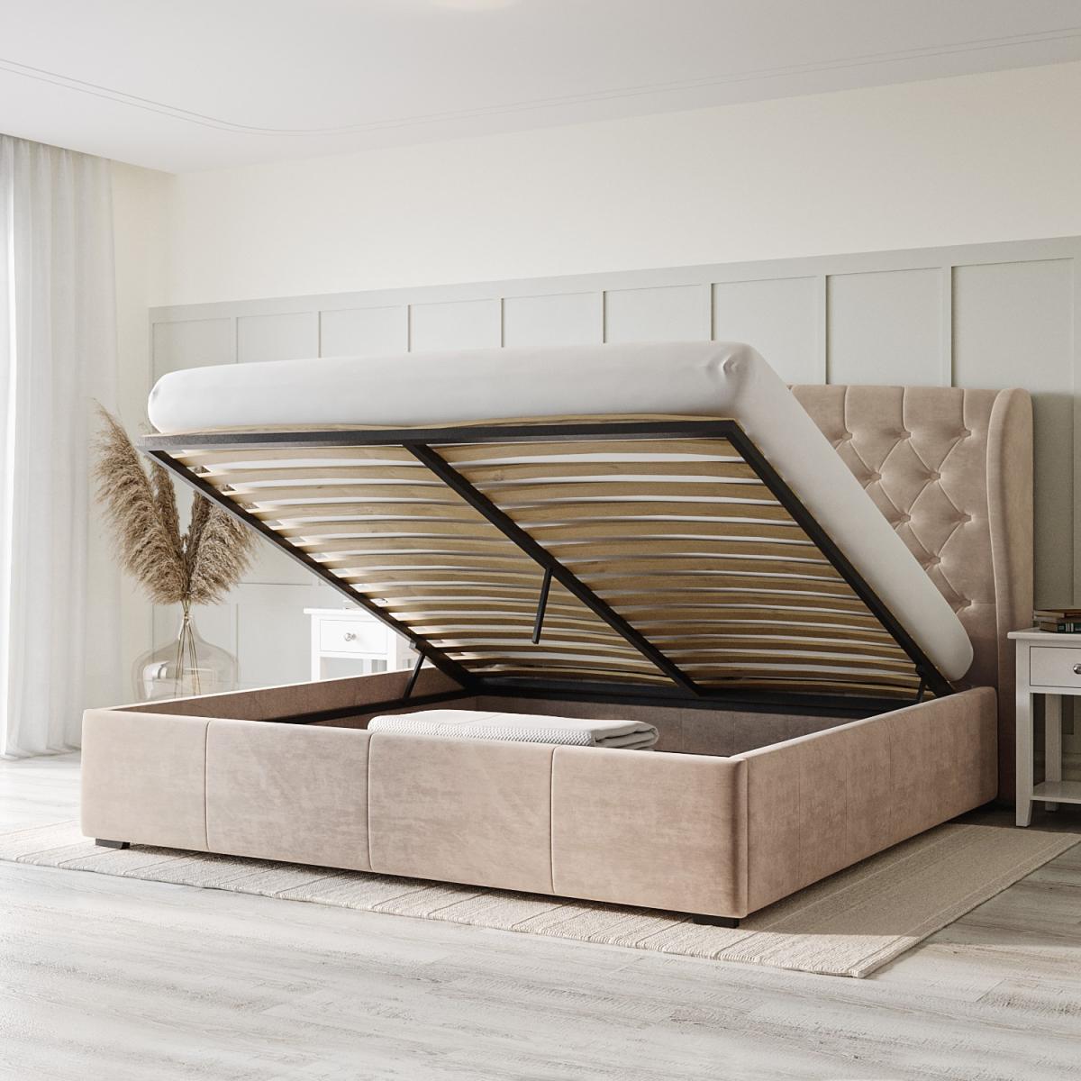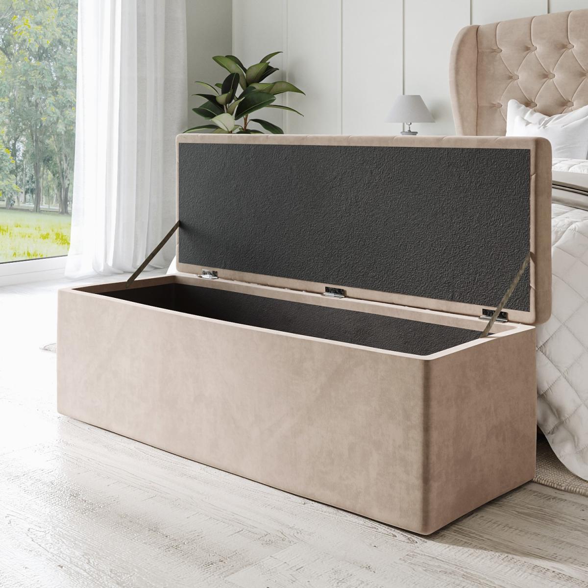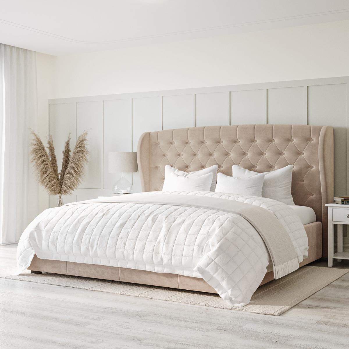 This bundle includes: Beige Velvet Super King Size Ottoman with Winged Headboard – Safina Beige Velvet Super King Size Ottoman Blanket Box - Safina Features we love Ottoman bed with winged headboard and blanket box Upholstered in a lush neutral beige velvet fabric Bed has lift-up front opening with gas lift mechanism Both offer ample storage space for all bedroom items Save 10% off selected mattresses with this bed All about me Make a stunning impression in your bedroom with this luxurious Safina wingback ottoman bed frame and matching blanket box with a chesterfield inspired design. The tall, modern headboard with deep button detailing is perfect for propping up and relaxing. The padded and button-tufted blanket box with stay open lid makes a great end-of-bed bench or even a gorgeous window seat. Both offer plenty of space inside for storage; you'll soon be clutter-free. Need to know Bed packaging dimensions:Box 1: W127 x D198.5 x H13cm / Box 2: W38 x D204 x H20.5 cm Bed Packaging weights: Box 1: 35.6kg / Box 2: 34kg Bed assembled dimensions:W204 cm x D217.5 x H130 cm Bed inner storage dimensions:W184.5 x D200.5 x H30 cm Bed mattress size: Standard UK Super King Size (6ft/180x200cm) Blanket box dimensions: W130 cm x D46 x H44 cm Blanket box inner storage dimensions:W121 x D36 x H33.5 cm Colour: Beige Finish: Upholstered Bed material: Solid wood combination, metal, foam, and velvet fabric Bed base:Wooden sprung slatted Blanket box material: Plywood and velvet fabric Assembly required: Bed yes, it comes flat packed / Blanket box comes fully assembled Mattresses included: No Please be advised the ottoman lift mechanism supports a weight of up to 70kg when open