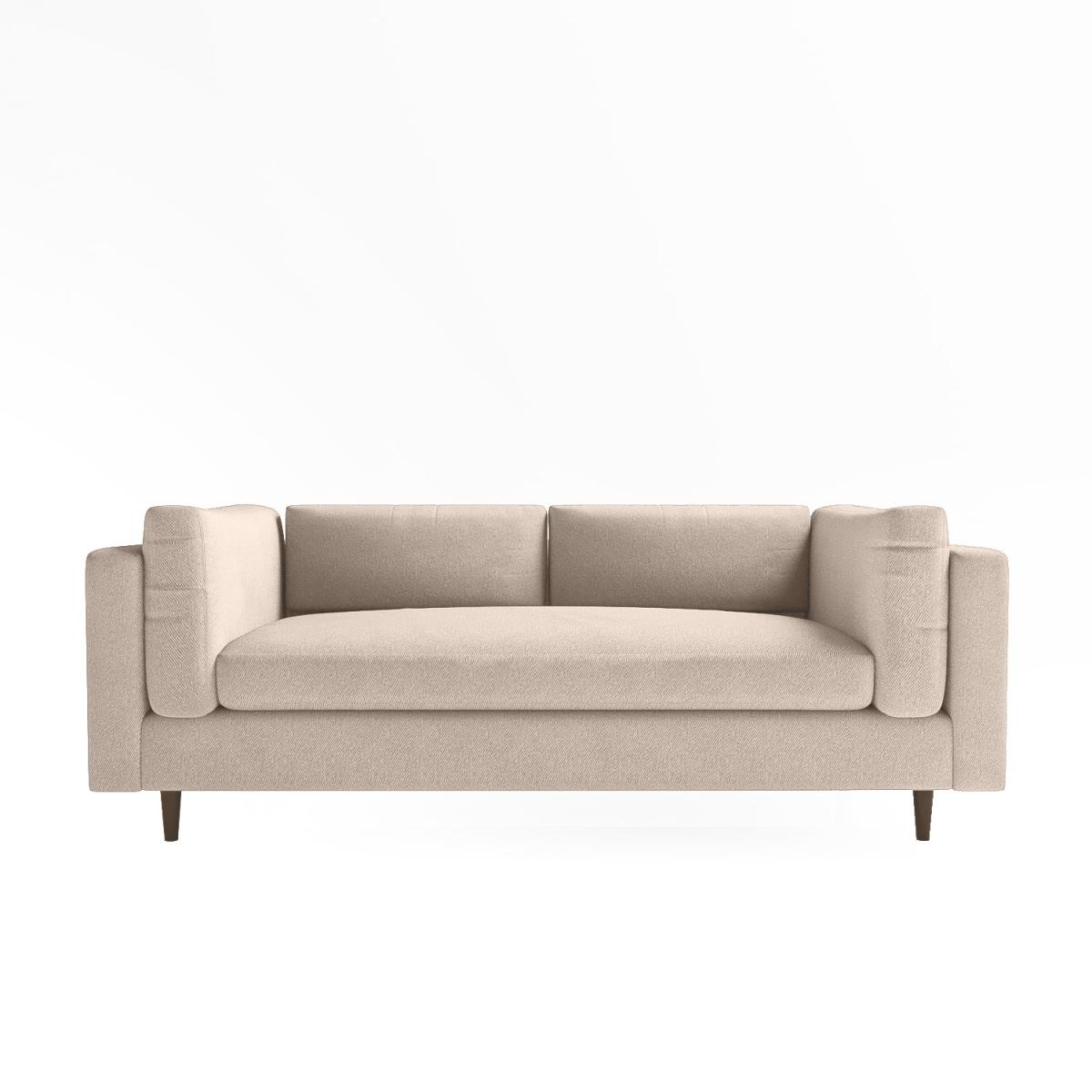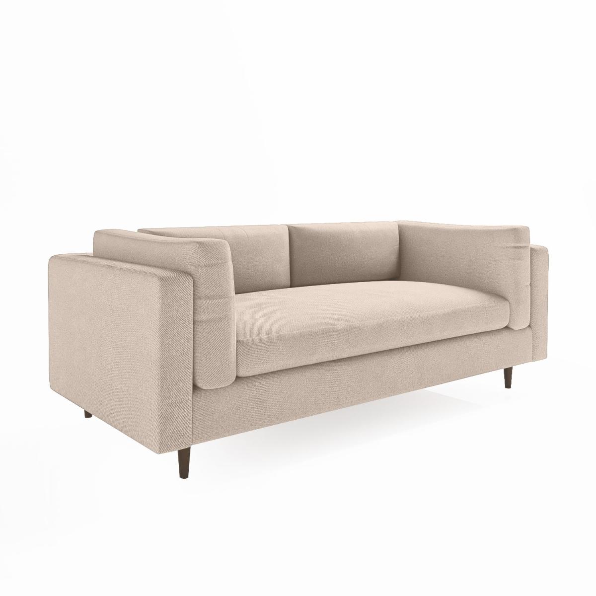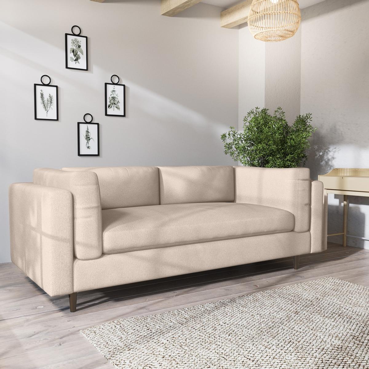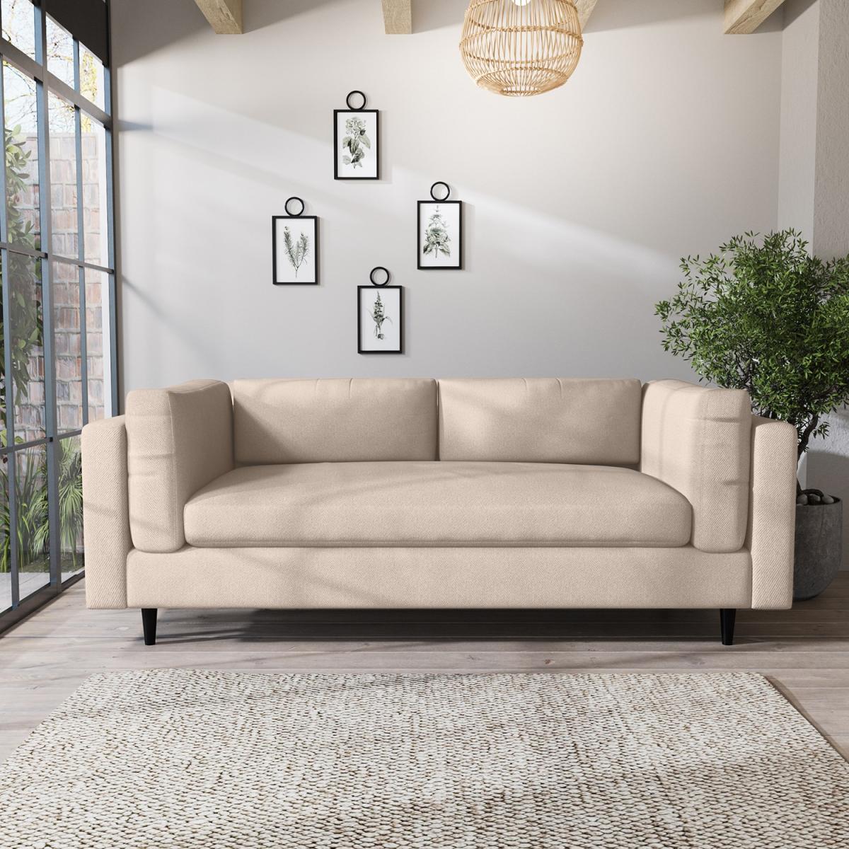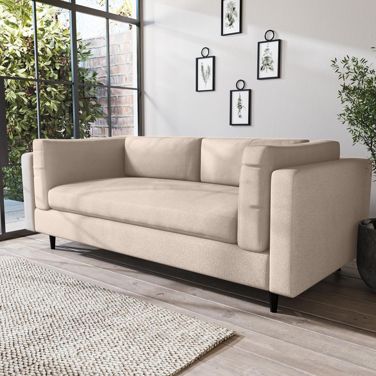 What is the Frankie sofa in a box? It's a practical and convenient solution that's quick and easy to build, simply…out of the box. The assembly requires no tools thanks to the slot and lock mechanism and can be disassembled in minutes if you need to move it. Delivered in manageable boxes It'll arrive in several compact, lightweight boxes, perfect if your home has narrow corridors or even a tricky flight of stairs. From living room to loft conversion, we've got you covered. Unbox and unwind in 1,2,3 Step One Screw in all four legs to the base Step Two Slot the arm and backrests into the base Step Three Add cushions and relax Features we love Designed to fit into any house, flat or tight space Quick and easy assembly with no tools required Luxurious beige woven Sofa in a Box Clean, square lines create a modern silhouette Foam-filled cushions for comfort and support All about me Introducing our new Sofa in a Box range, enjoy the convenience and comfort. The beige woven material adds a sophisticated touch to any space, and it's easy to manoeuvre the manageable boxes into a smaller space like a cellar or attic without worrying about scuffing walls. It's also super simple to assemble with no tools required; the pieces slot together, and the legs screw on. What is a sofa in a box? Sofa in a box is a practical and convenient solution that's quick and easy to build, simply…out of the box. It'll arrive in several compact, lightweight boxes, perfect if your home has narrow corridors or even a tricky flight of stairs. The assembly requires no tools thanks to the slot and lock mechanism and can be disassembled in minutes if you need to move it. It comes available in a 3-seater, 2-seater, loveseat and footstool, and two modern colours. From living room to loft conversion, we've got you covered.--> Need to know Overall dimensions: W201 x D84 x H75 cm Number of boxes: 4 Packed dimensions:W35 x D185 x H72 cm, W37 x D148 x H76 cm, W23 x D86 x H46 cm, W25 x D9 x H25 cm Weight: 58kg Seats: 3 people Colour: Beige Finish:Woven upholstery and wooden legs Material:Woven fabric Filling: Foam Assembly required: Yes - slot the pieces together and screw in the legs.