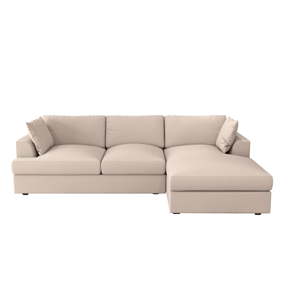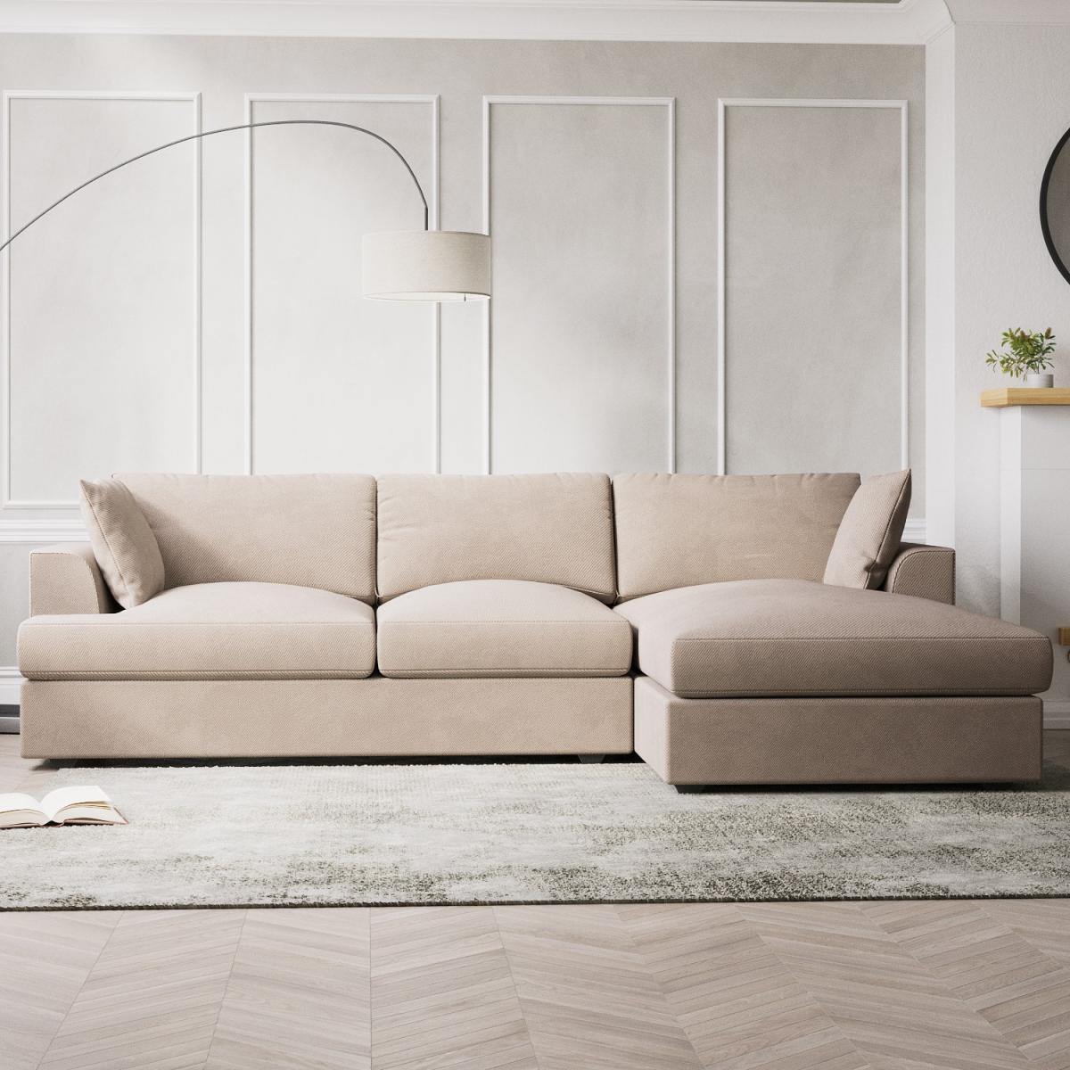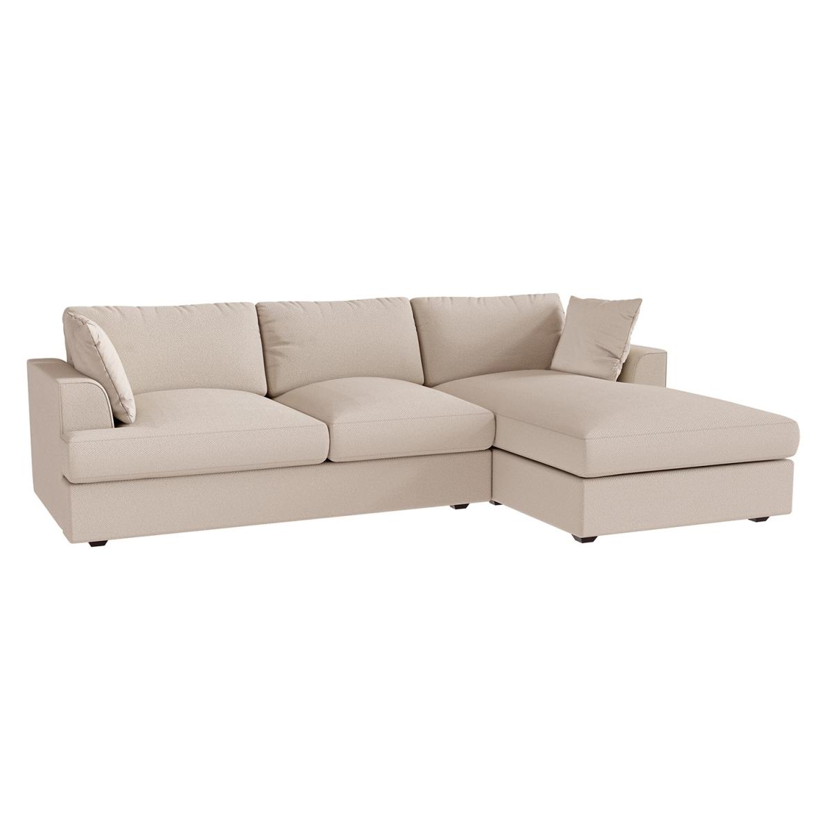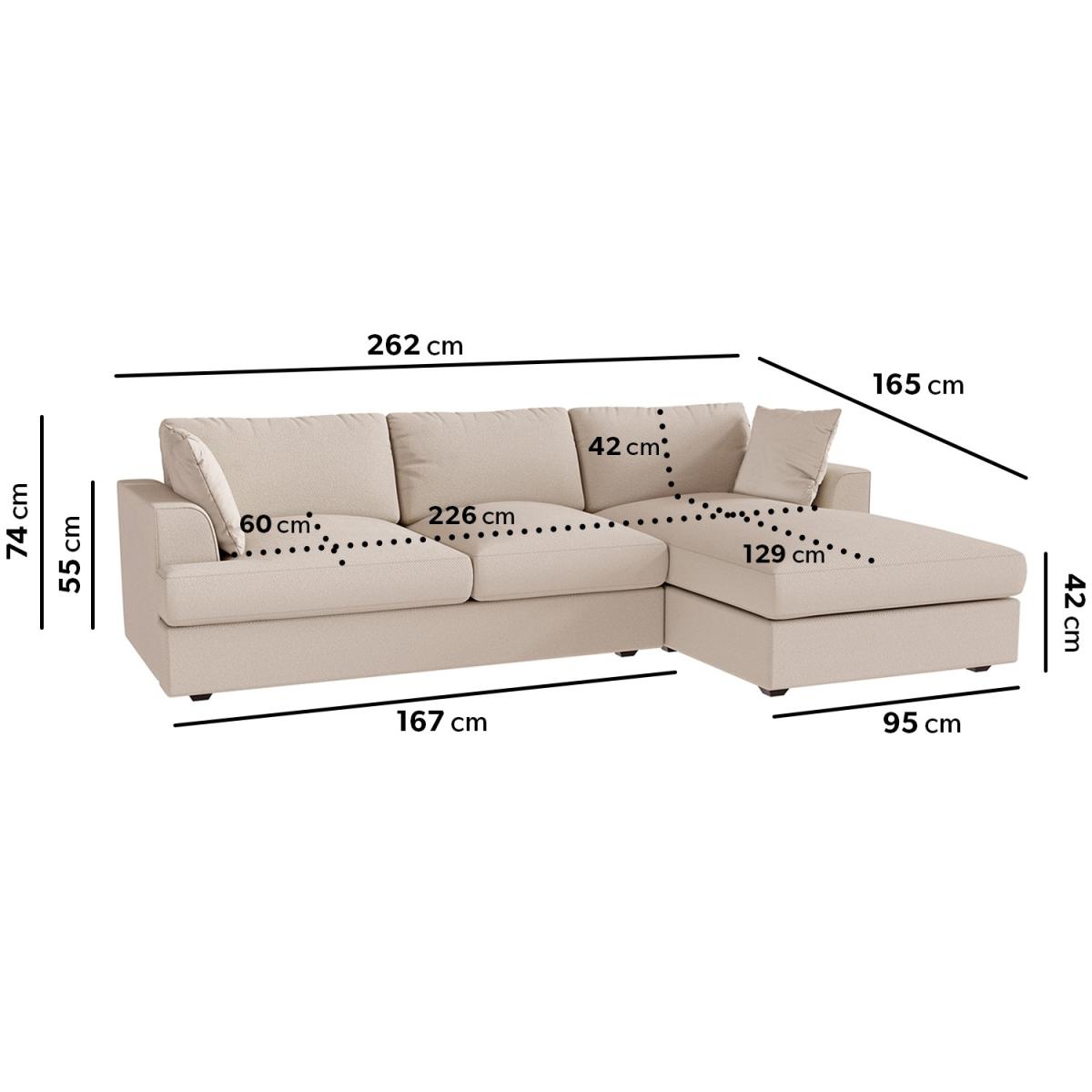 Features we love L-shaped sofa upholstered in soft woven fabric Cushion covers are removable and easy to clean Back upholstery allows versatile placement in any room Seat and back cushions filled with spongey foam Arrives in 2 pieces, for effortless manoeuvring and assembly All about me Create the perfect modern statement in any living room with the August L-shaped sofa, beautifully upholstered in soft woven fabric with tailored piping detail. The chaise feature and foam-filled seats provide extra comfort, great for cosying up. Need to know Dimensions:W262 x D165 x H74 cm Packed dimensions: Box 1: W170 x D97 x H61 cm / Box 2:W167 x D97 x H61 cm Packed weights: Box 1: 42 kg / Box 2: 40 kg Seats: 4 Colour: Beige Finish:Woven upholstery and dark wooden legs Material:Woven fabric (100% polyester), wooden frame Filling: Foam Assembly required: Yes – simply attach pieces together