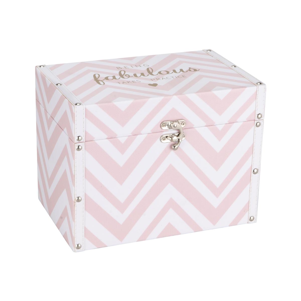 The perfect way to store and transport your cosmetics or keepsakes, this Being Fabulous Takes Practice Box features a chic pink and white zig-zag pattern with gold font atop its hinged lid. Complete with a latch and black fabric interior, this stylish box will help keep your make-up or treasured items safe and in one place.