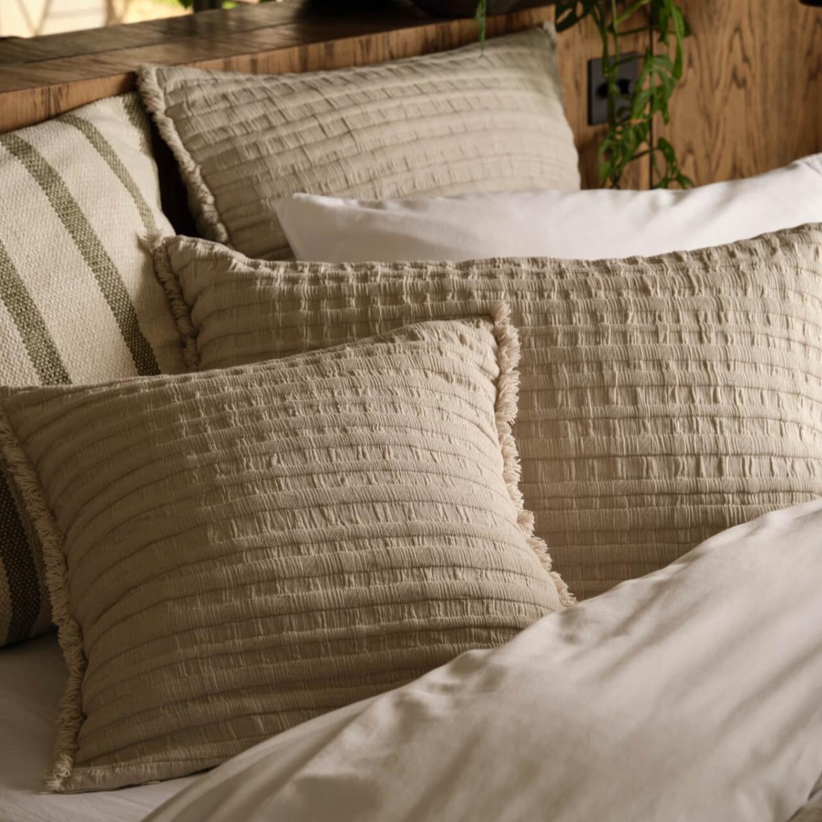 The Beja range of cushion covers and throws make layering your bed easy. Designed with beautifully textured pattern, these super soft textiles provide an abundance of rich warmth to the layering of your bed. Finished with a heavy fringed edge the overall look is one of sheer luxury and sophistication. Choose from 2 different colour ways: soft putty or rich khaki and 3 different sizes so you can curate your own style accordingly. Sold individually, does not include fillers.