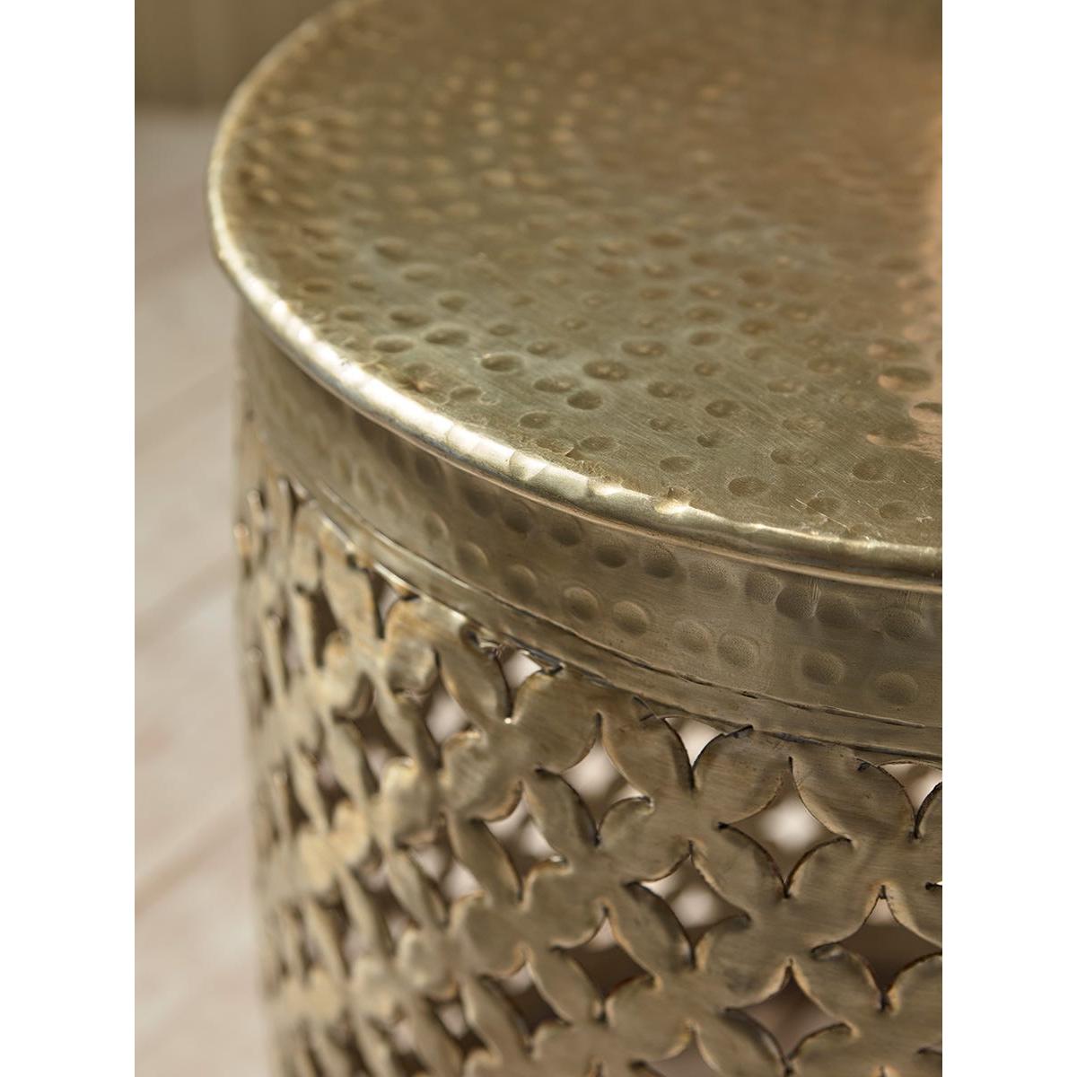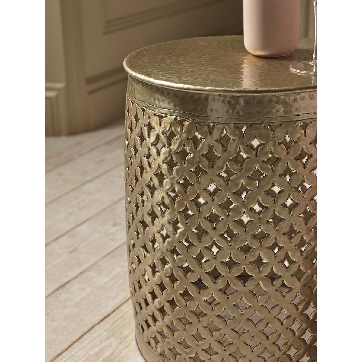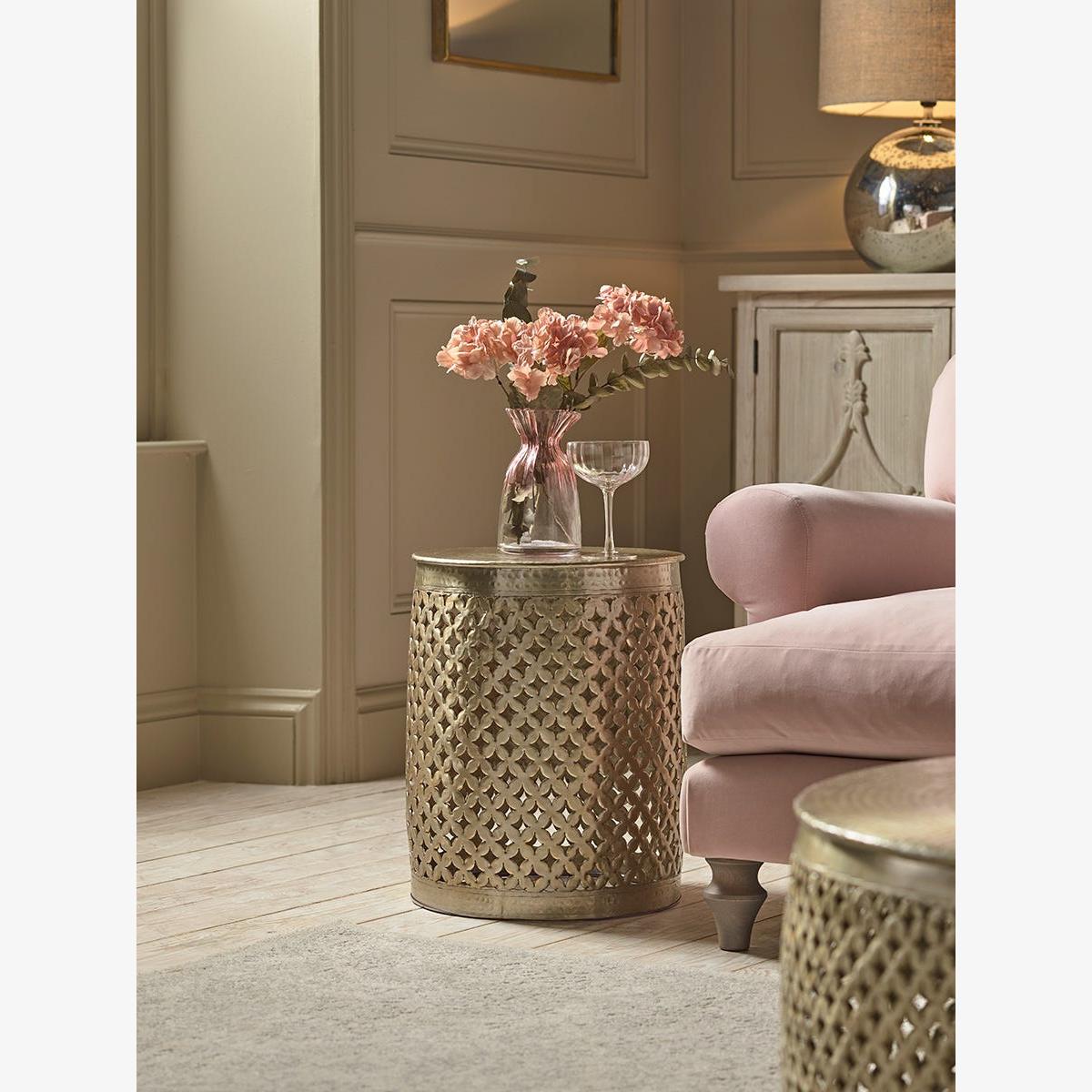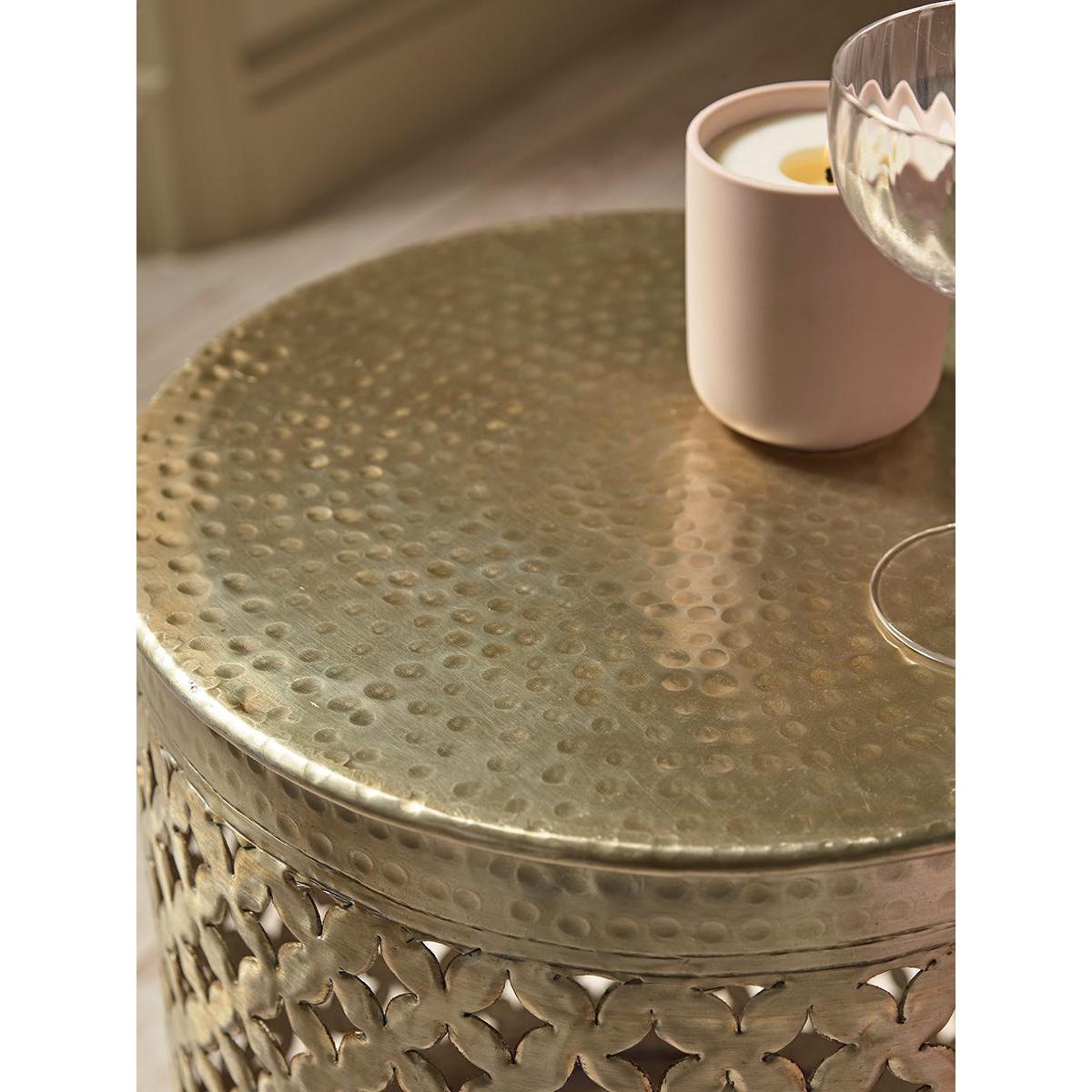 Move beyond the ordinary with our Beja side table. Crafted from metal, the brass effect creates an elevated look, ideal for adding a touch of elegance to your space. The dimpled table top creates a textural contrast with the middle-eastern style laser pattern on the base for a statement piece that will bring both warmth and visual interest to your home. Also available as a coffee table.