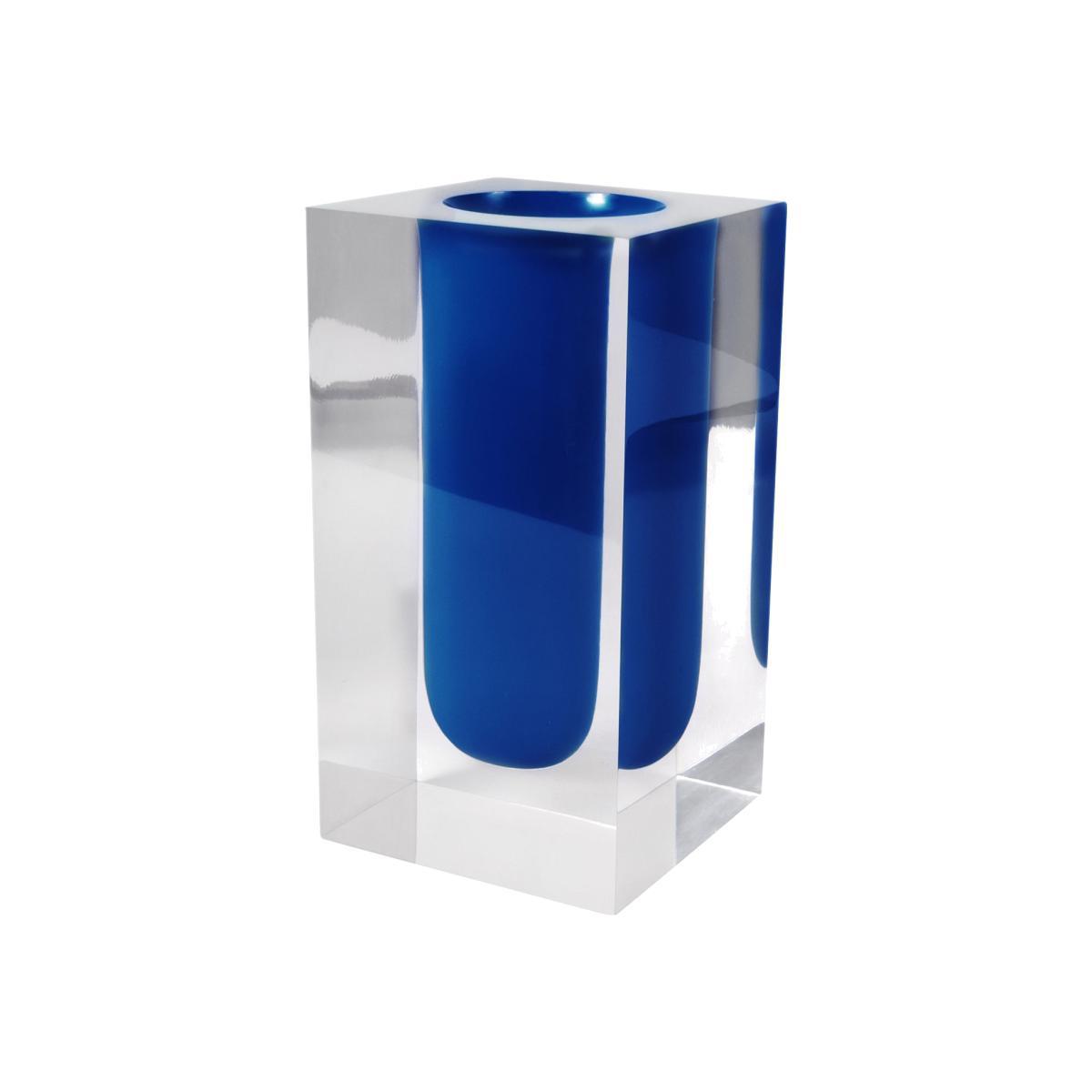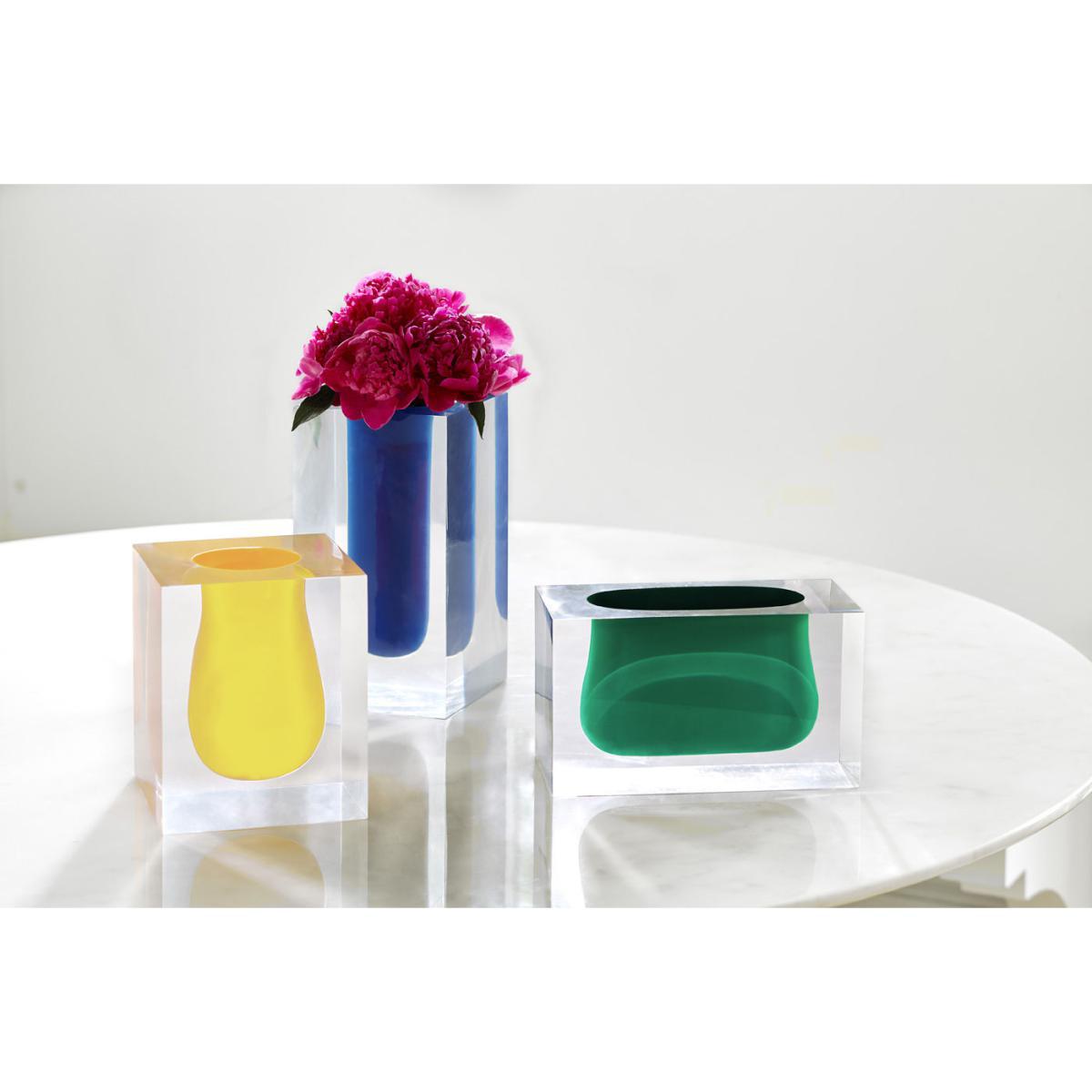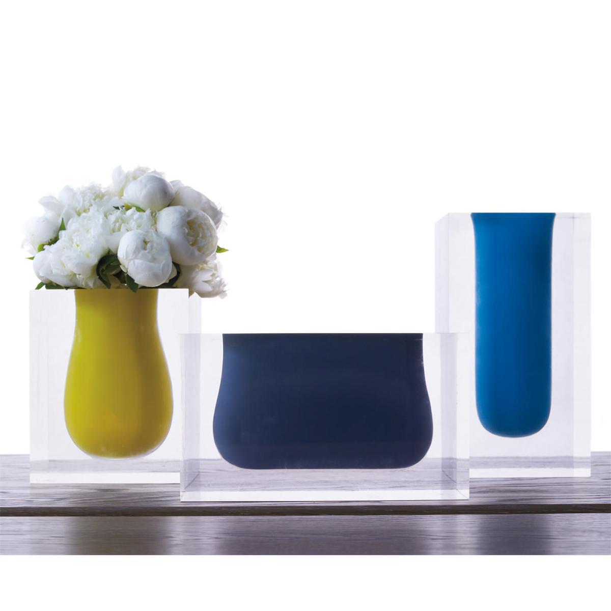 Suspended beauty. This surprising vase is writing a new chapter in terms of exacting research into forms and materials. It is made up of a colourful acrylic container with a curved and organic form enclosed in a block made from transparent acrylic. The colourful form seems to float inside of the transparent tube. The shapes overlay to form a dual-walled object, creating a subtle interplay of colours and transparency.