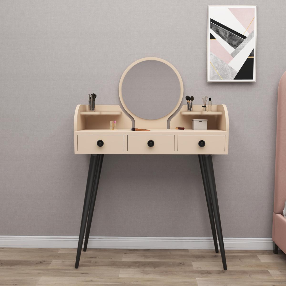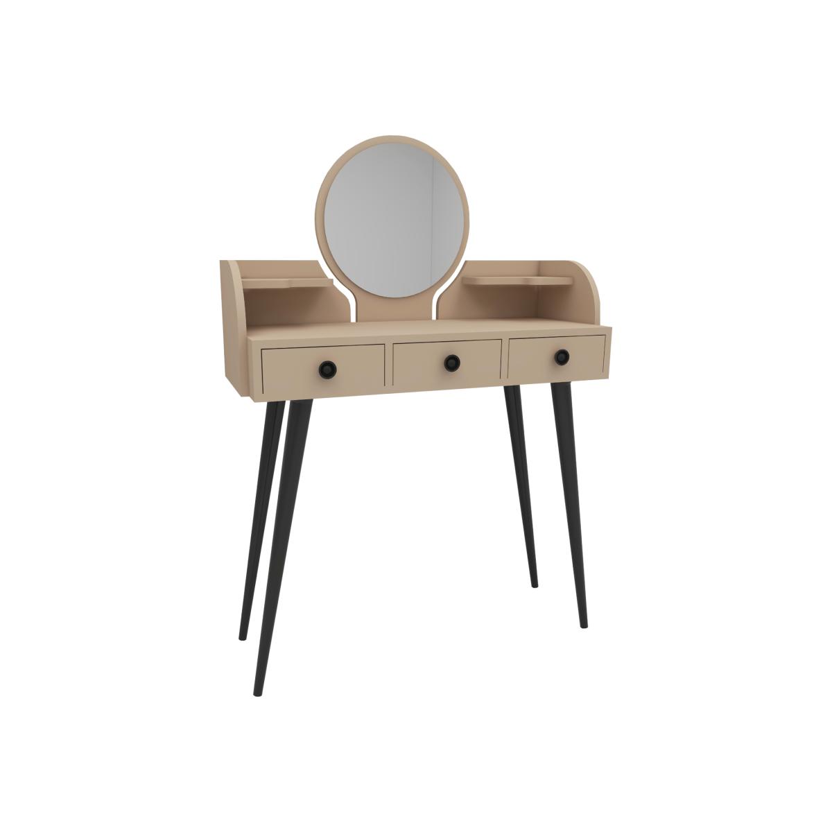 MATERIAL The makeup table is made of an 18 mm thick quality melamine-coated particleboard. The manufactured wood surface is water-resistant to some extent and the edges are banded with PVC edge banding tape. First-class assemblyinstallation hardware and accessories are used. Our products are produced from certified raw materials that do not contain carcinogenic substances and comply with European Union health norms. CLEANING You can clean your furniture with a dry cloth. Avoid prolonged contact of your product with moisture and water. ASSEMBLY The product will be delivered to the customer in the original package as disassembled. It is designed to be assembled by the customer using a power drill and screwdriver. Assembly instructions and installation hardware are included in the box. Product parts are numbered with stickers per the assembly guide for fast and error-free installation.