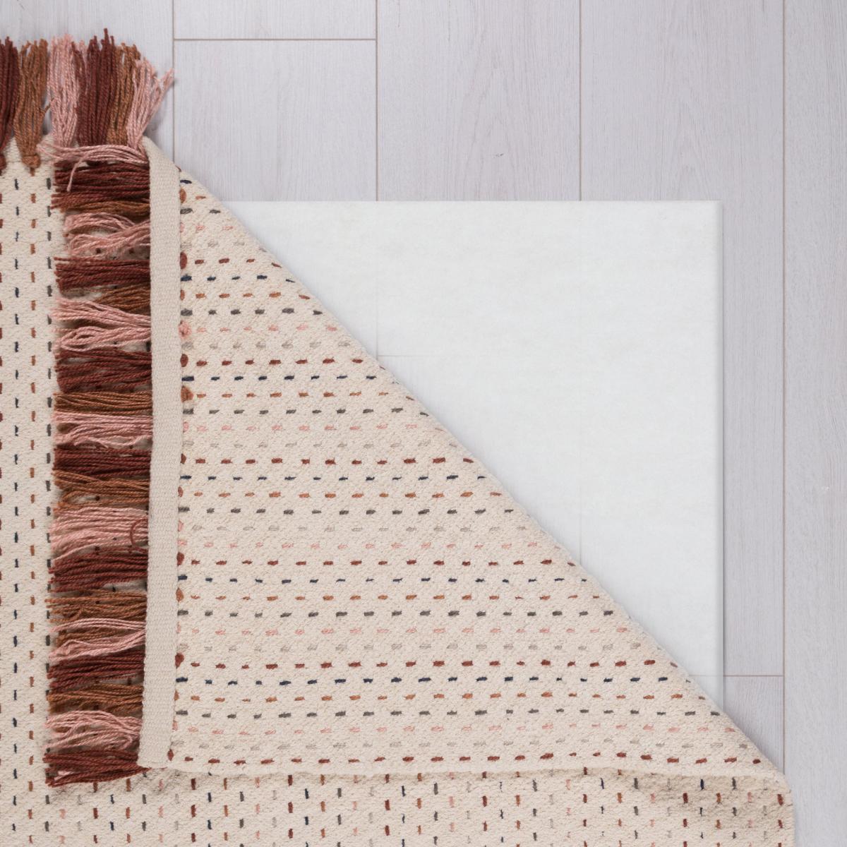 Contrasting tassels in an on-trend russet and pink colour combination set the tone for the Belen Hand Woven rug. Pairing a stab-stitch effect with a cotton blend composition for a raw, natural look. Hand woven by Skilled Artisans in India, the cotton/polyester blend increases durability while keeping the natural feel of the design. The low-profile and foldable composition makes this the perfect rug for any space. Don. ’. T forget to buy our anti-slip mat. Here. ,. Available in a choice of sizes. This is a hand-made flatweave rug. When opening, re-roll your rug pile out and leave in a warm room for 24 hours before putting in place, this will help to reduce wrinkles and curling from packing. Turn your rug regularly to ensure even wear and reduce pressure marks from furniture. Do not pull any loose threads, please cut them carefully with scissors to remove. Avoid prolonged exposure to direct sunlight as this may cause fading of the colour. A small amount of fibre loss is normal on a new rug. Before using any cleaning products on your rug, test on an inconspicuous area first to ensure it does not affect the colour. Clean spills immediately by blotting with a clean dry white cloth - do not rub as this may stain the fibres. Vacuum your rug regularly to remove everyday dirt, we recommend the use of a suction type vacuum cleaner as a rotating vacuum brush can cause damage to the pile surface. We recommend the use of an anti-slip mat beneath your rug to prevent it from slipping and sliding out of place. Please do not leave babies or young children unsupervised on this rug.