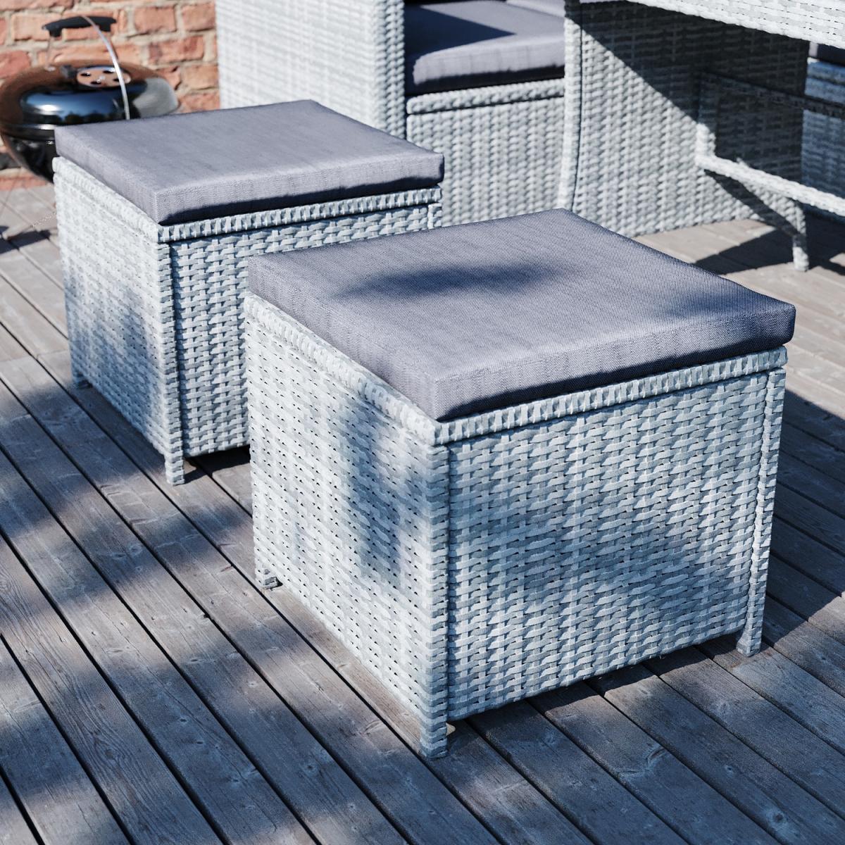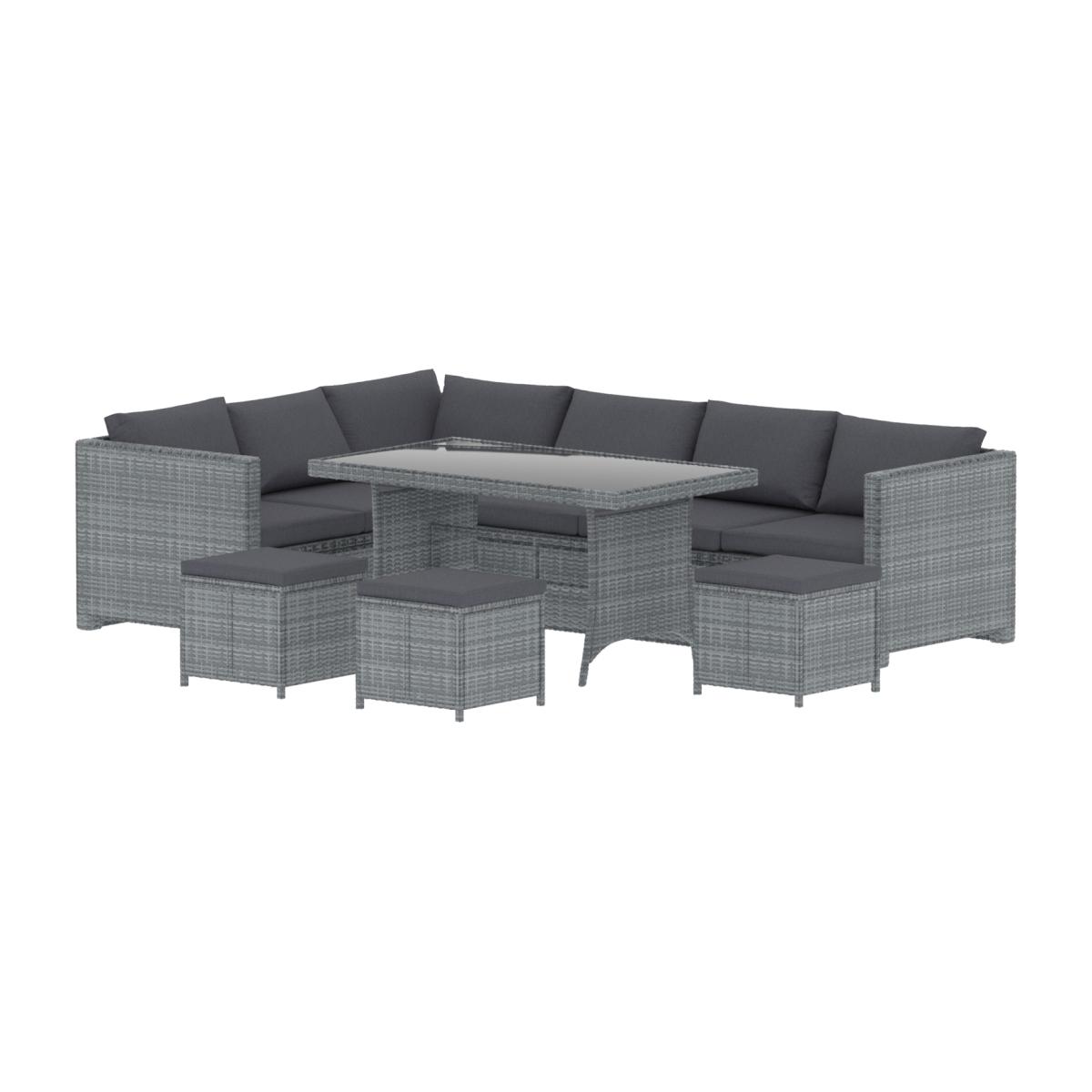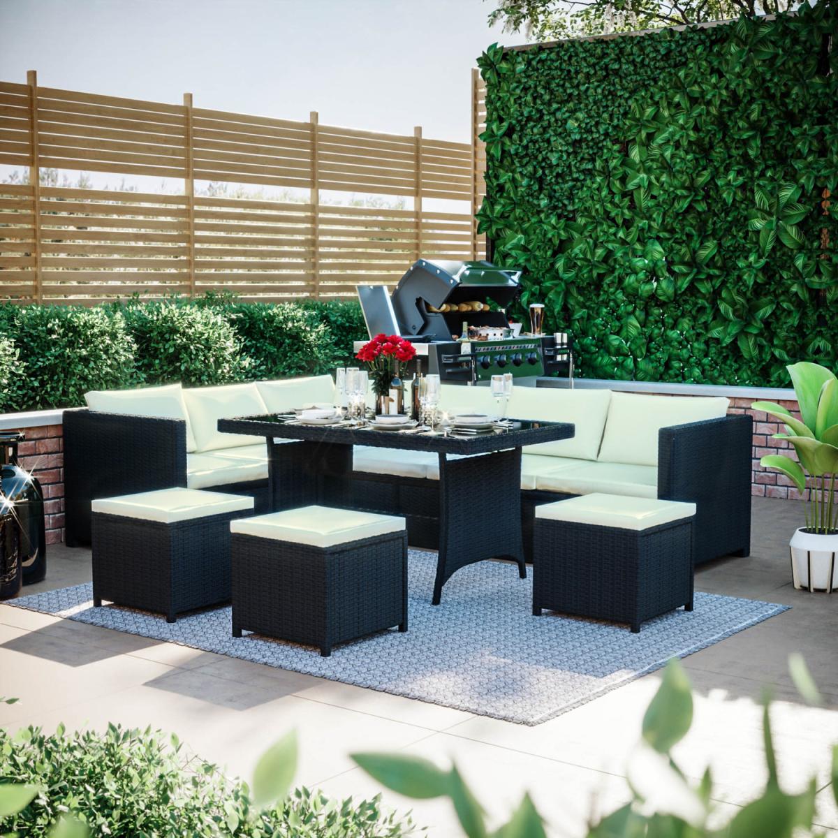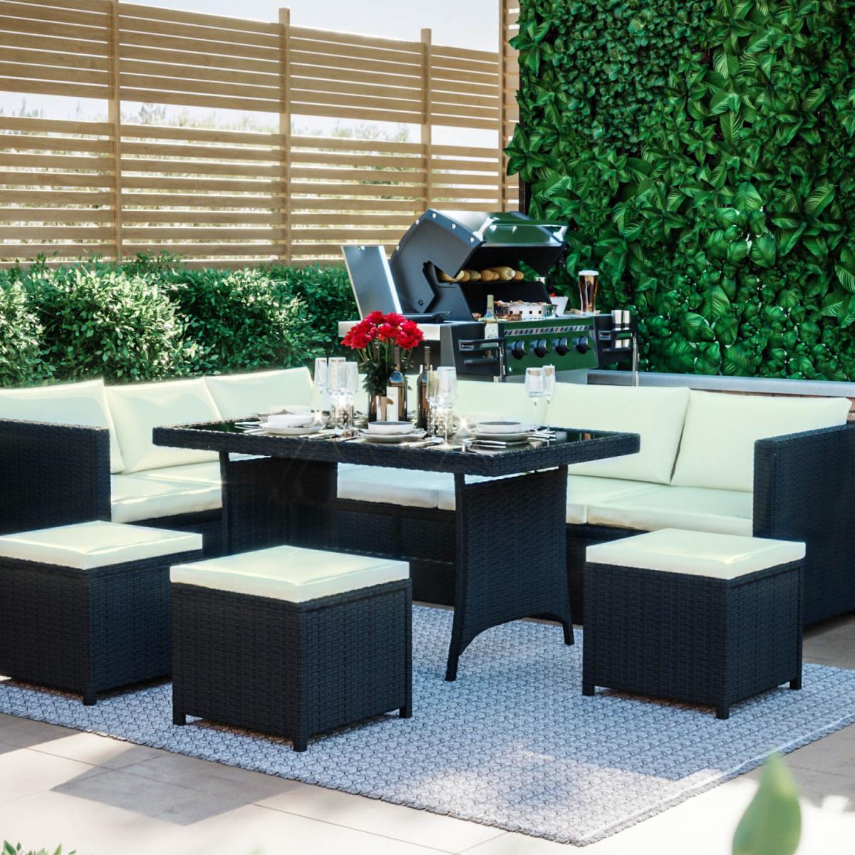 With this product, Belgrave 9 Seater Rattan Set, you will be able to hold all your BBQ parties and family days making it the perfect addition to your garden, giving a chic and modern touch to your outdoor decor, without forgetting comfort. Featuring one 3-seat sofa and one 3-seat corner sofa with 3 stools and 1 table topped with black tempered glass, including back and seat cushions, it will give enough places to sit for everyone to enjoy together. This set is both fire retardant and UV resistant, ensuring that it will withstand all weather conditions. Furthermore, all cushions are washable, so you don't need to worry anymore about stains. Measurements: 1*Three-seat sofa:W 187 x D 76.5 x H 64 cm1*Three-seat corner sofa:W 175.5 x D 76.5 x H 64 cm3*Stool:W 43 x D 43 x H 36 cm1*table: W 130 x D 75 x H 65.5