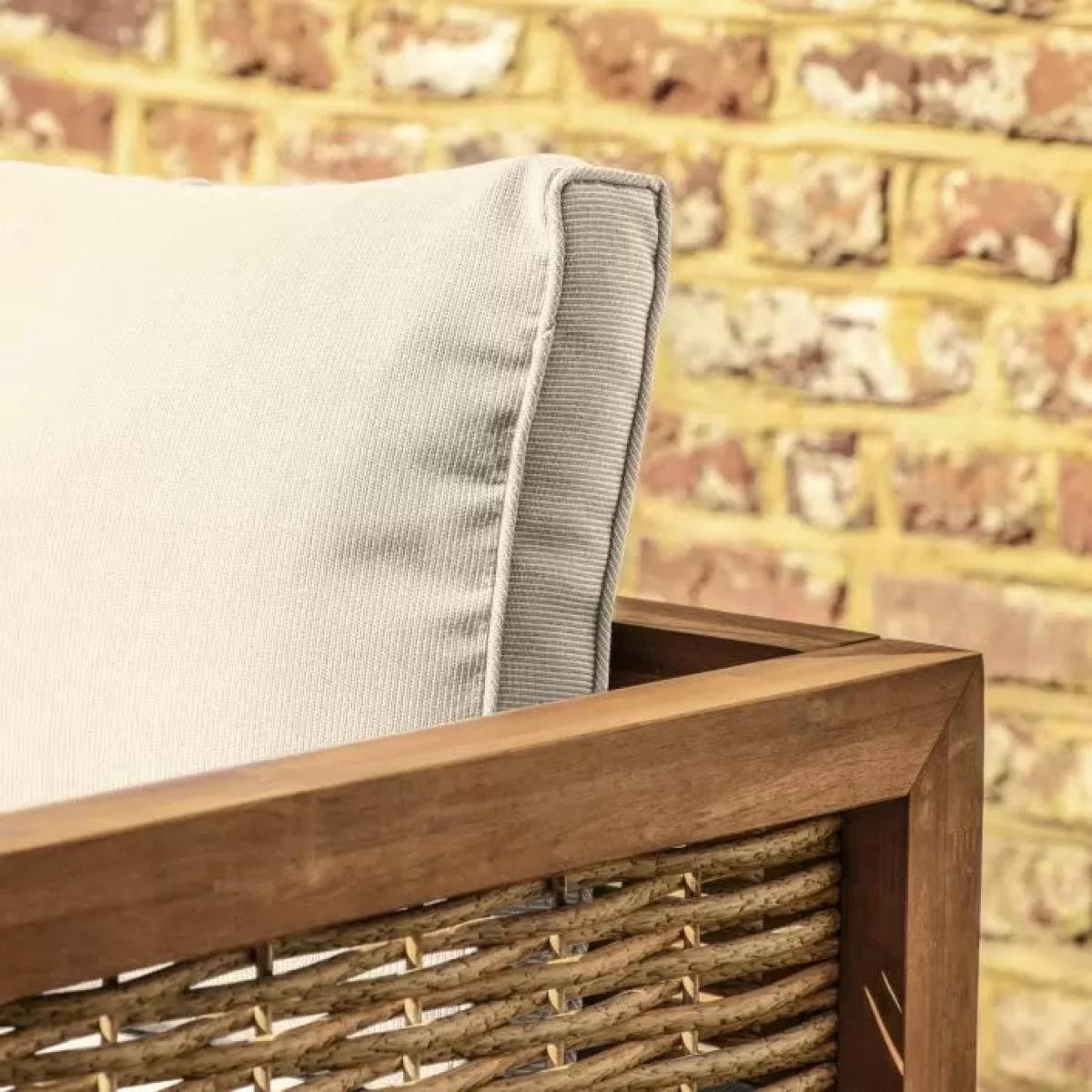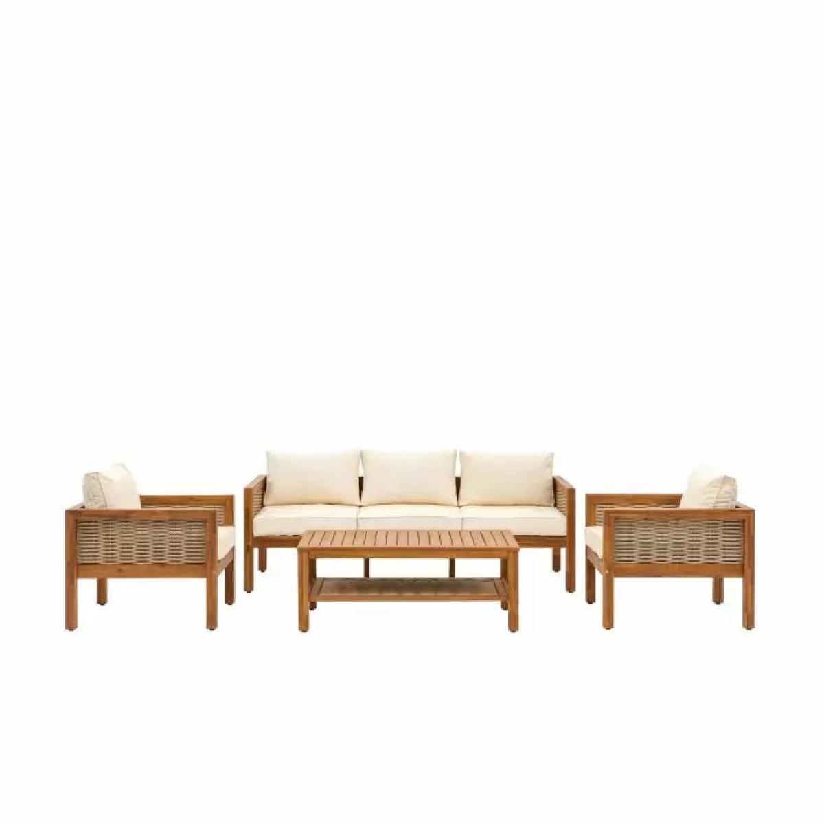 With a 3 seater sofa, 2 armchairs and a large coffee table there's plenty of space to relax on this lounge set. The elegantly modern design features beautiful Aciaia wood finished with woven wicker details on the arms and coffee table, combined with comfortable cushions creating the perfect place to sit and enjoy the summer.