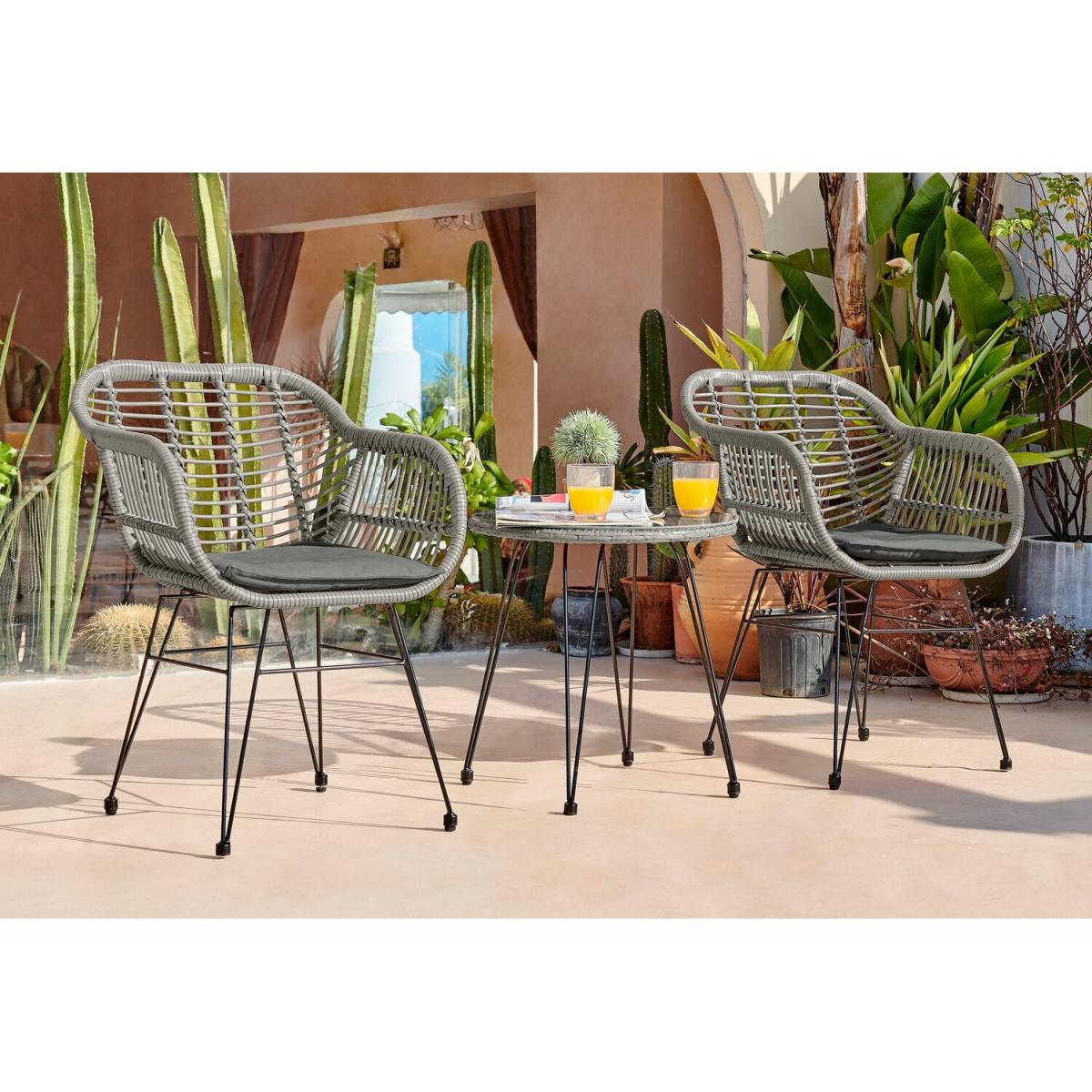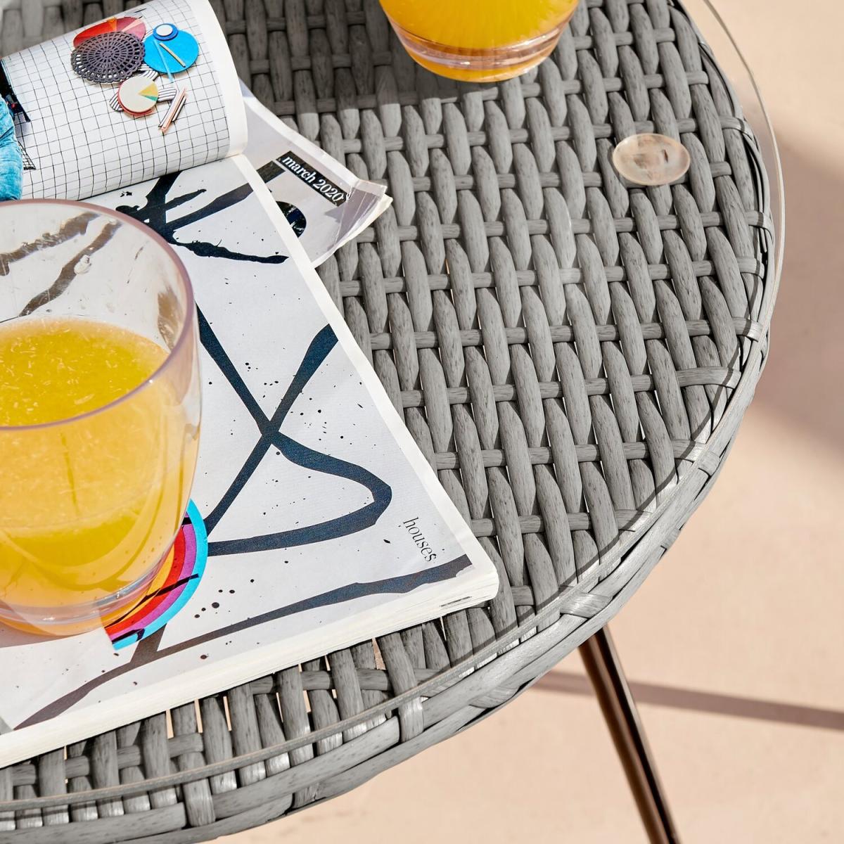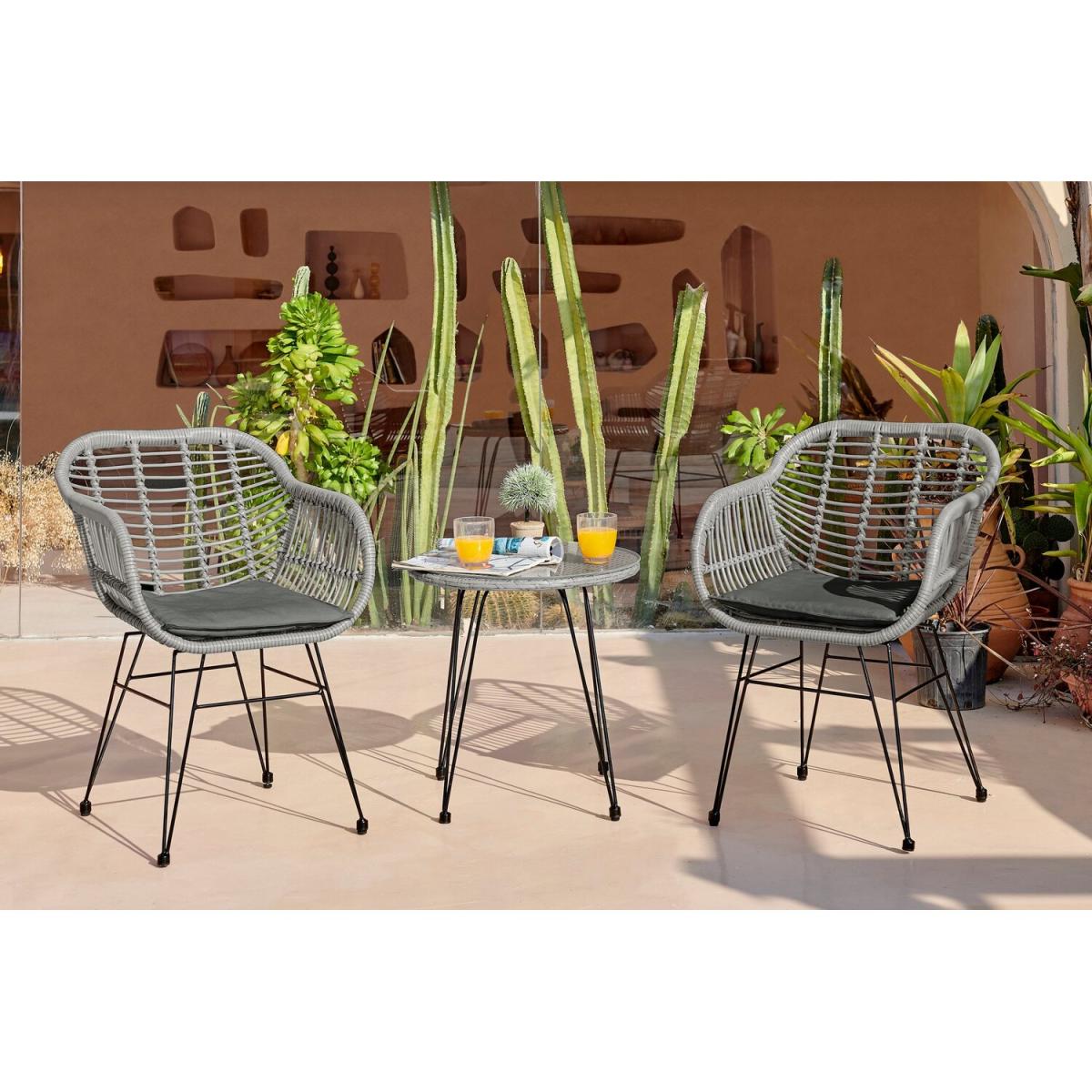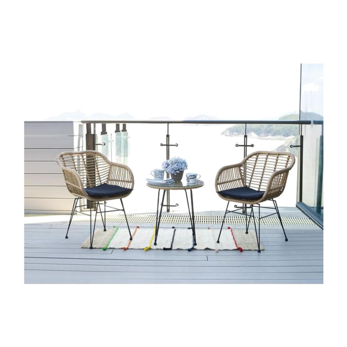 Our Belize Outdoor 2 Seat Round Table Bistro Set is a compact little garden table and chairs that packs some serious style. Featuring 2 rustic boho open-weave PE rattan tub chairs and a small round table on black steel metal hairpin legs. Perfect for sun rooms, patios, decks and balconies! We adore this little set. It's bang on trend with the mix of boho rustic and industrial Scandi stylings. The chair and table frames are sturdy steel wrapped in natural brown PE rattan, with the legs black powder-coated steel. The round compact bistro table features a rattan tabletop with clear tempered glass topper, keeping it feeling light and bright. The grey fabric seat pads add some extra comfort. This design screams sun-drenched coffees in the early morning, or evening cocktails by a firepit. The table and chair frames are UV and weather resistant so shouldn't fade. The cushions are splash proof (so if any spills occur, pick up the cushion and give it a firm pat on the underside to encourage the droplets to roll off). However, the cushions should not be left outside or in damp conditions. Store them somewhere warm and dry. If they do get wet then allow them to fully dry in the sun or somewhere warm before you store them. This set includes a FREE water resistant cover but please note, this is not fully waterproof and you should still store your cushions somewhere dry during wet weather and through winter. We're excited to bring you our new outdoor range developed in-house by our product design team! We've overseen the process, from creating initial designs to hand-selecting the colours and fabrics. So, you can rest assured that you'll receive a Furniturebox design that won't compromise on style or comfort and won't break the bank!