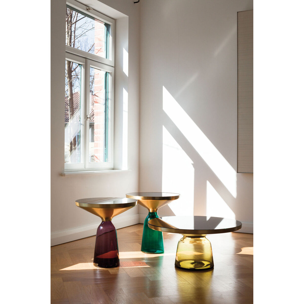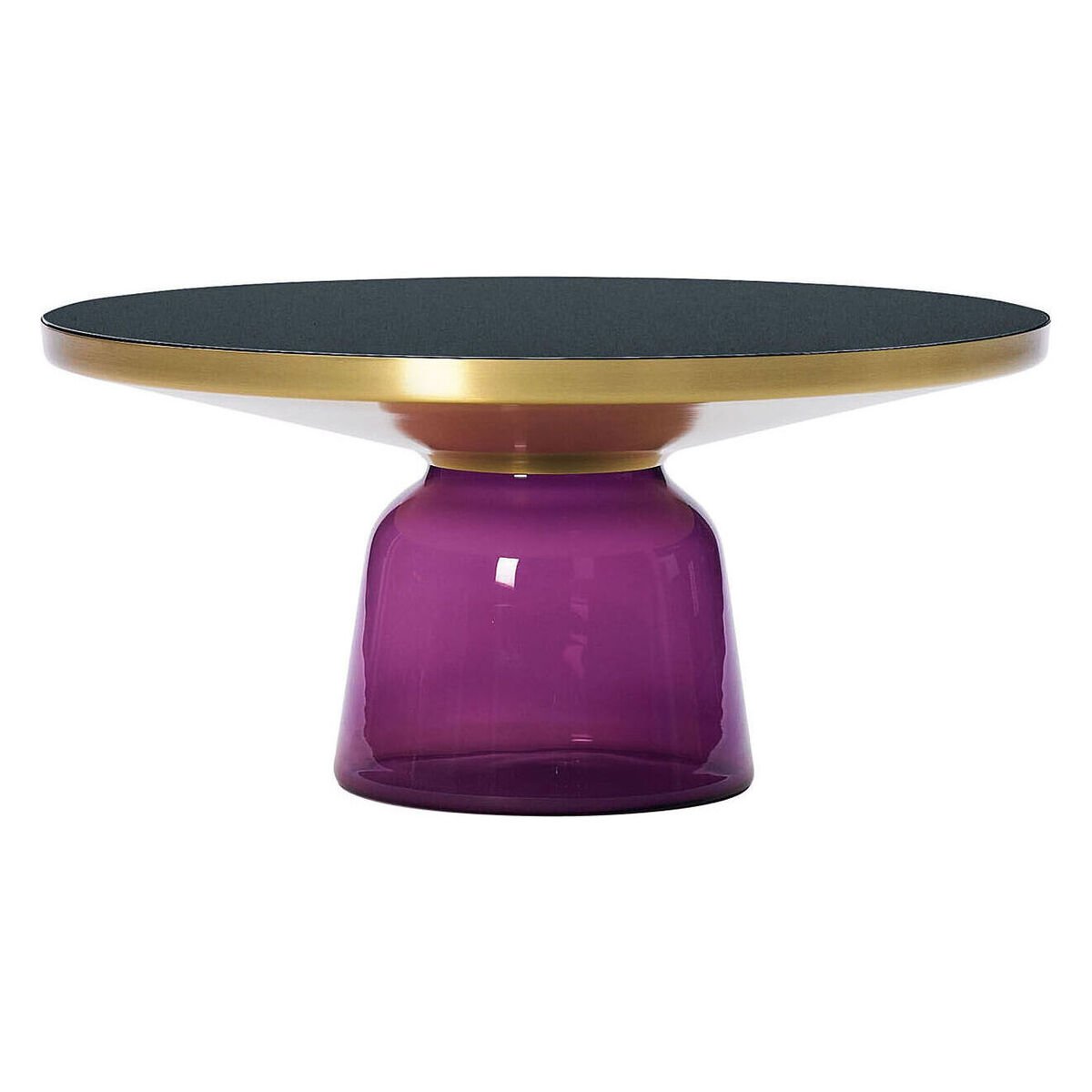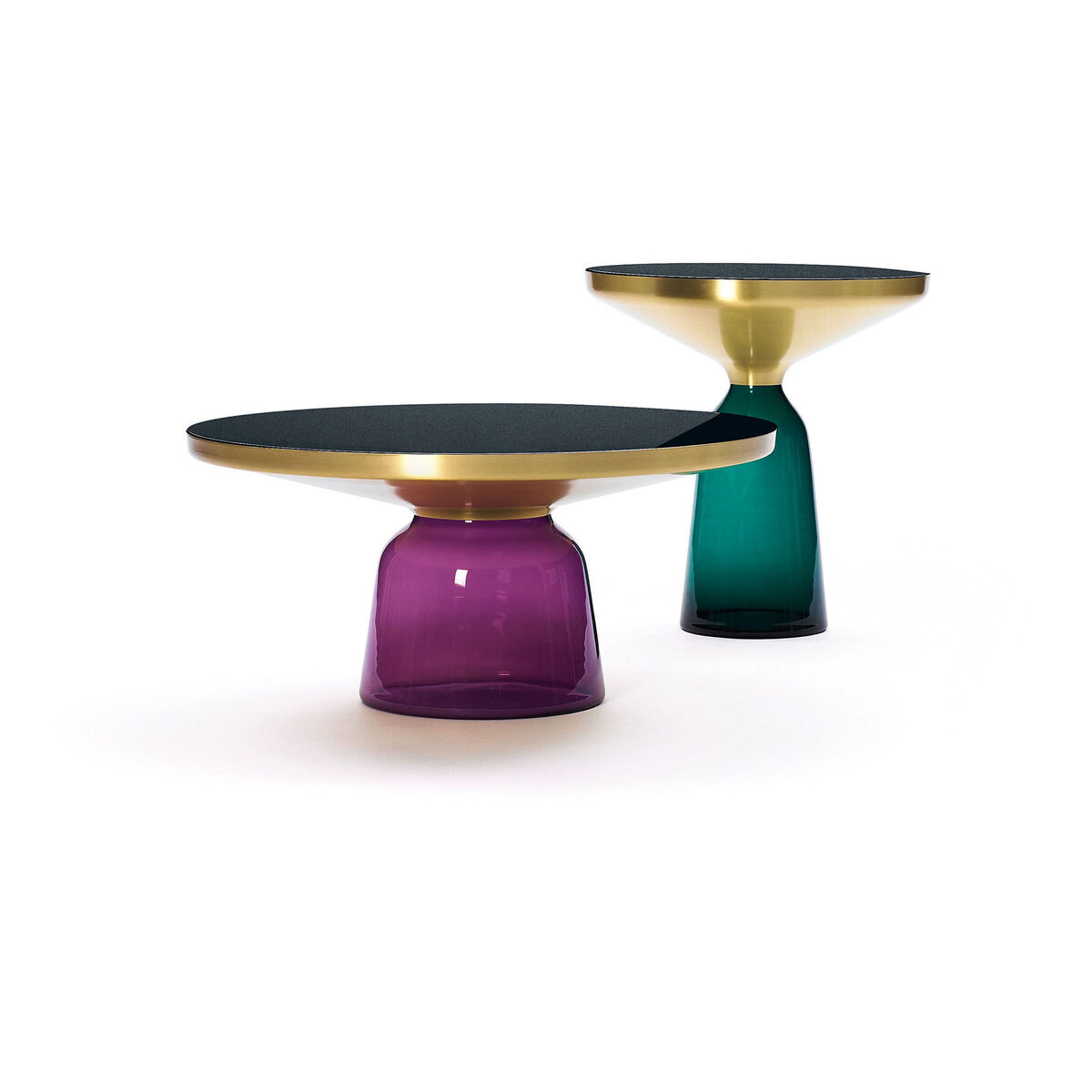 An upside down world: Bell table collection by Sebastian Herkner plays with our perception. The heavy glass leg looks like an upside down water bottle supporting a brass top. Bell table makes an impression by its weight and by the quality of its handcrafted production. Strictly respecting the tradition, the leg is blown using a traditional wooden mould. Bell celebrates the beauty and purity of materials, their colours and surfaces by playing with bright reflections and by the fascinating fusion of materials. This table comes in two versions: coffee table (Ø 75 x H 36 cm) or supplement table (Ø 50 x H 54 cm) and is available in amethyst purple, emerald green and topaz yellow.