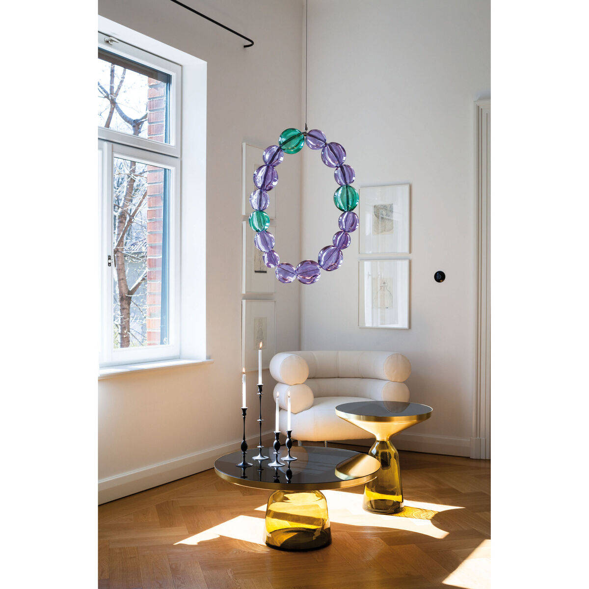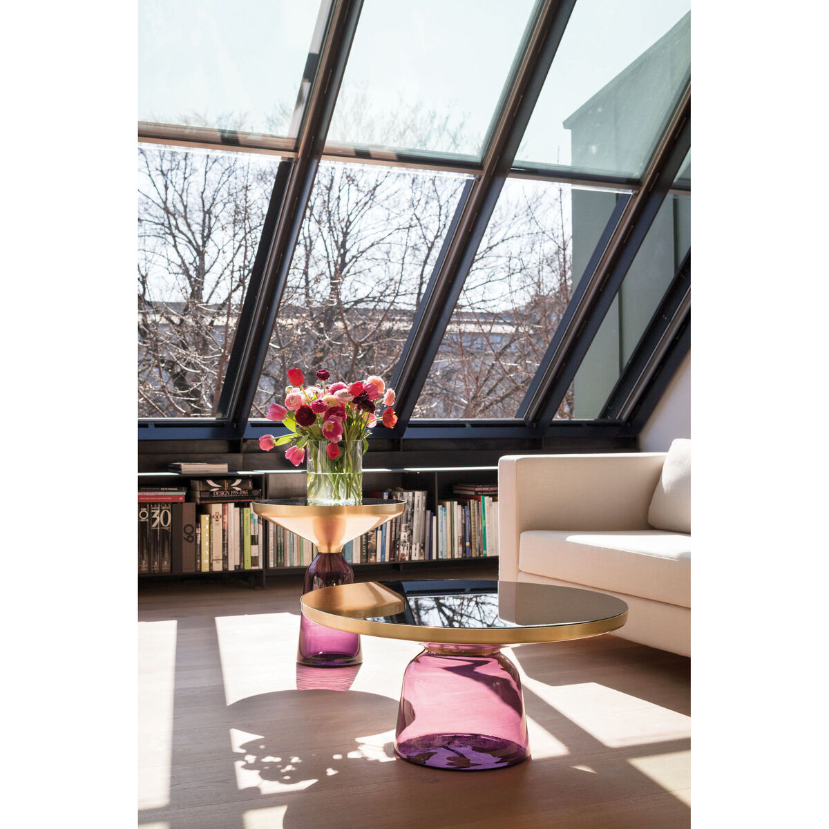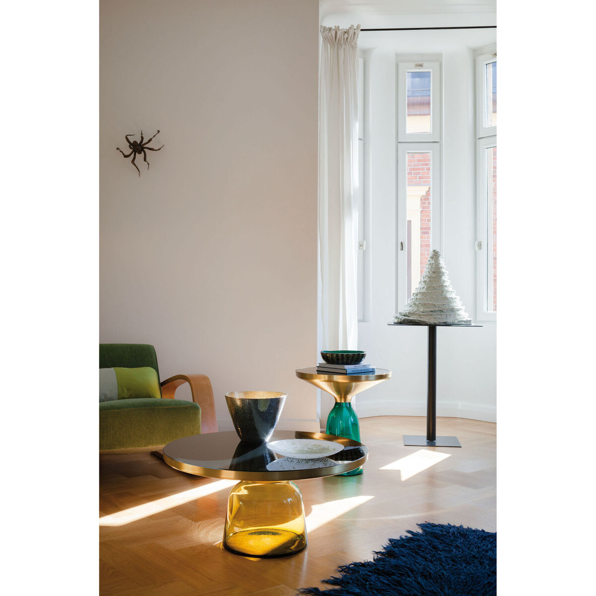 An upside down world: Bell table collection by Sebastian Herkner plays with our perception. The heavy glass leg looks like an upside down water bottle supporting a brass top. Bell table makes an impression by its weight and by the quality of its handcrafted production. Strictly respecting the tradition, the leg is blown using a traditional wooden mould. Bell celebrates the beauty and purity of materials, their colours and surfaces by playing with bright reflections and by the fascinating fusion of materials. This table comes in two versions: coffee table (Ø 75 x H 36 cm) or supplement table (Ø 50 x H 54 cm) and is available in amethyst purple, emerald green and topaz yellow.