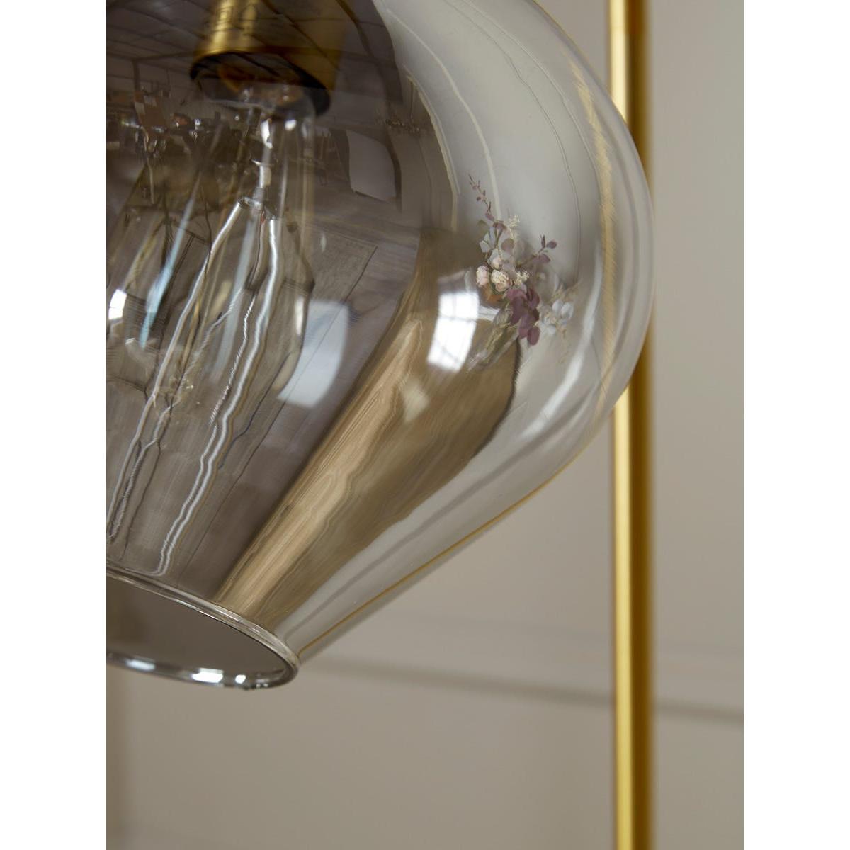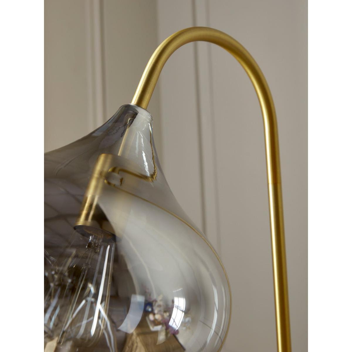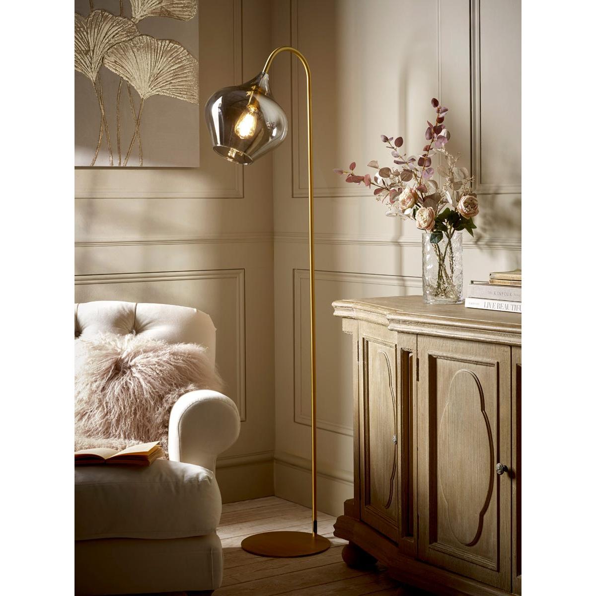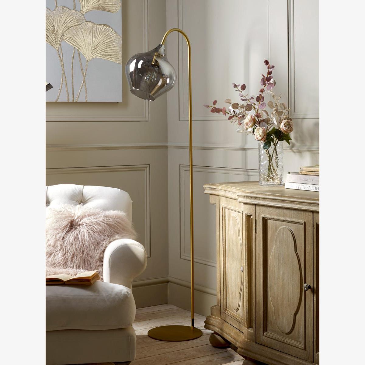 Sleek and modern, this floor lamp has an elegant and unique design, warming your home in the most delicate of ways. A bell shaped smoked glass shade creates a muted golden hue to gently light your space which is complemented by a brass arm and base, adding a touch of elegance and luxury. Place by an armchair to light a cosy reading nook, or in the corner of a room to create a relaxing atmosphere in your home.  Discover how to create the perfect lighting scheme for your home using our Lighting Buying Guide.