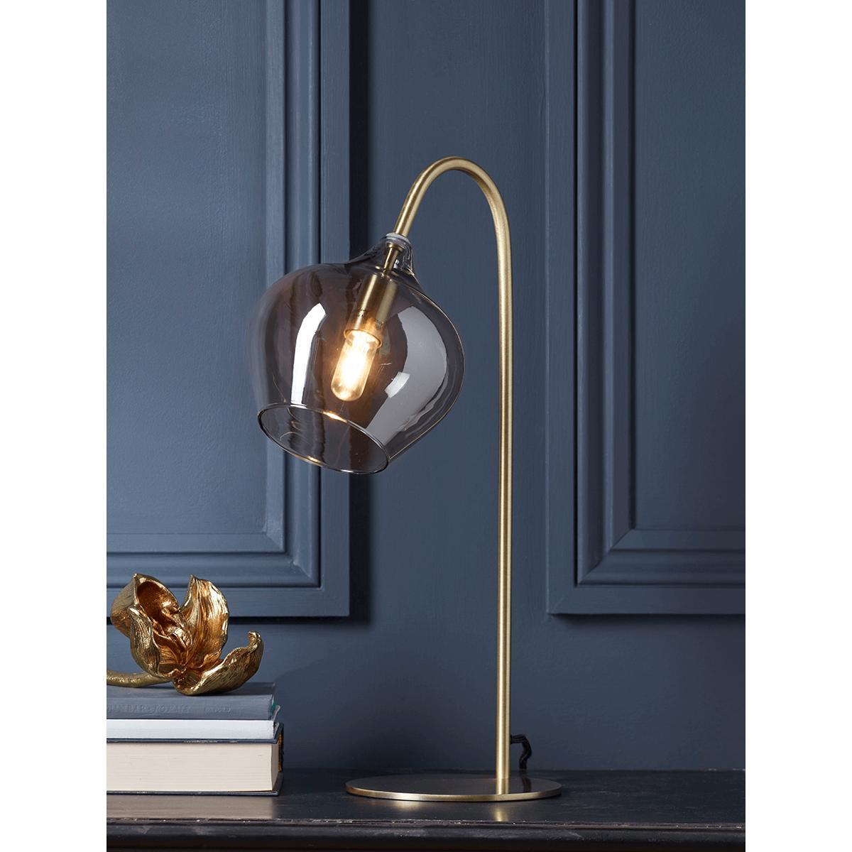 Back in stock soon!. Make a statement with the luxe tone of our deco-inspired table lamp. The balance of the slender base and arching stem makes a striking frame for the beautiful grey glass bell shade.