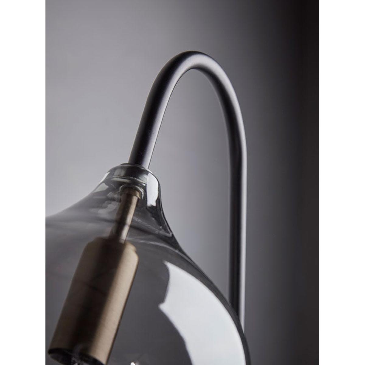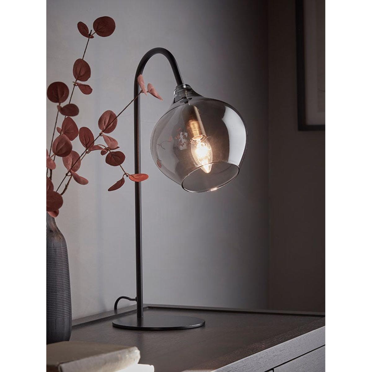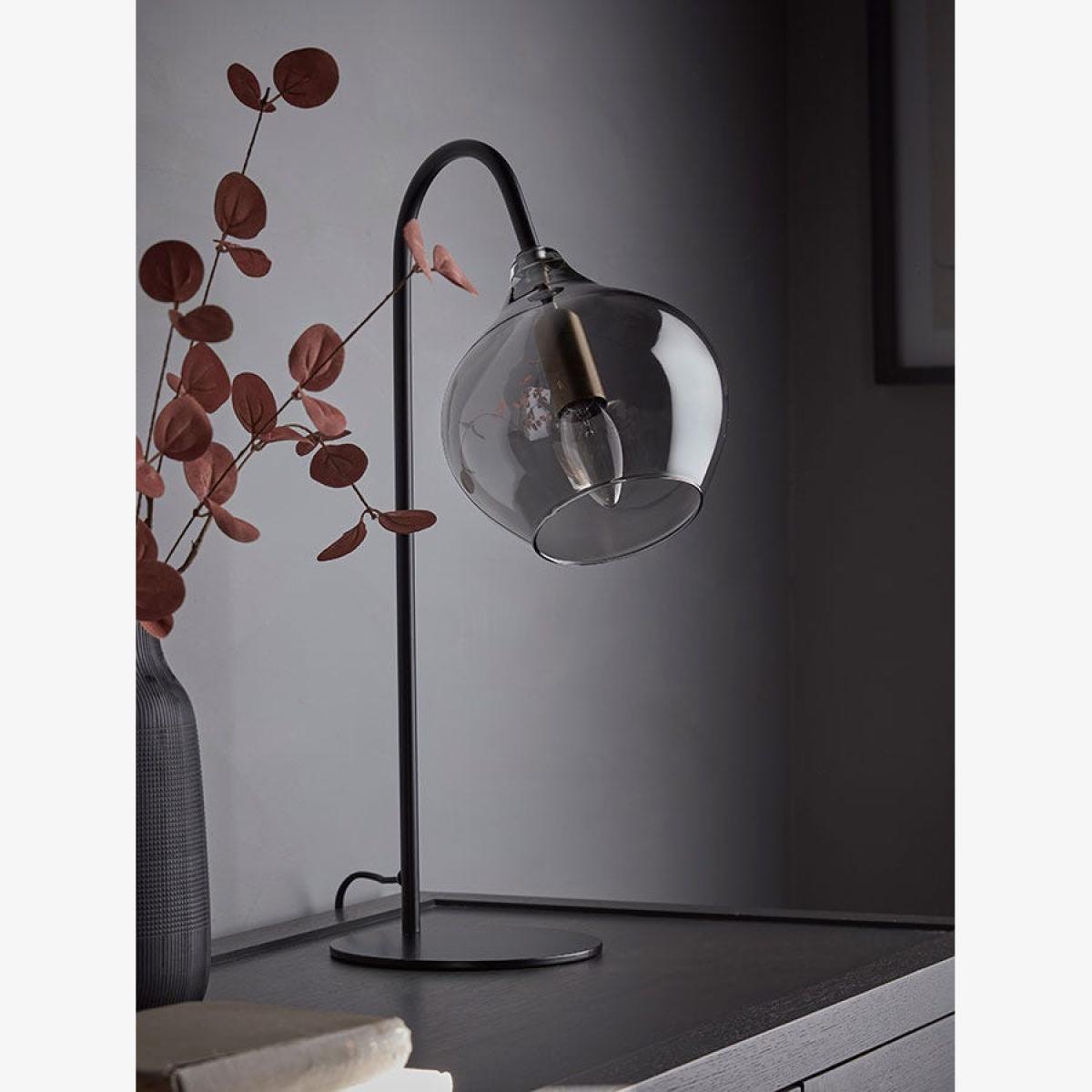 Sleek and modern, this table lamp warms your home in the most delicate of ways. A bell shaped smoked glass shade creates a muted golden hue to gently light your space, and the slightly harsher curved black metal arm is softened by this smoky effect. Place on a side table for a modern reading nook, or in your hallway to light your entranceway.