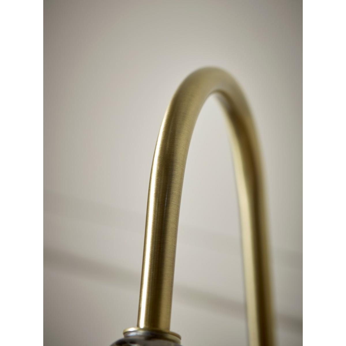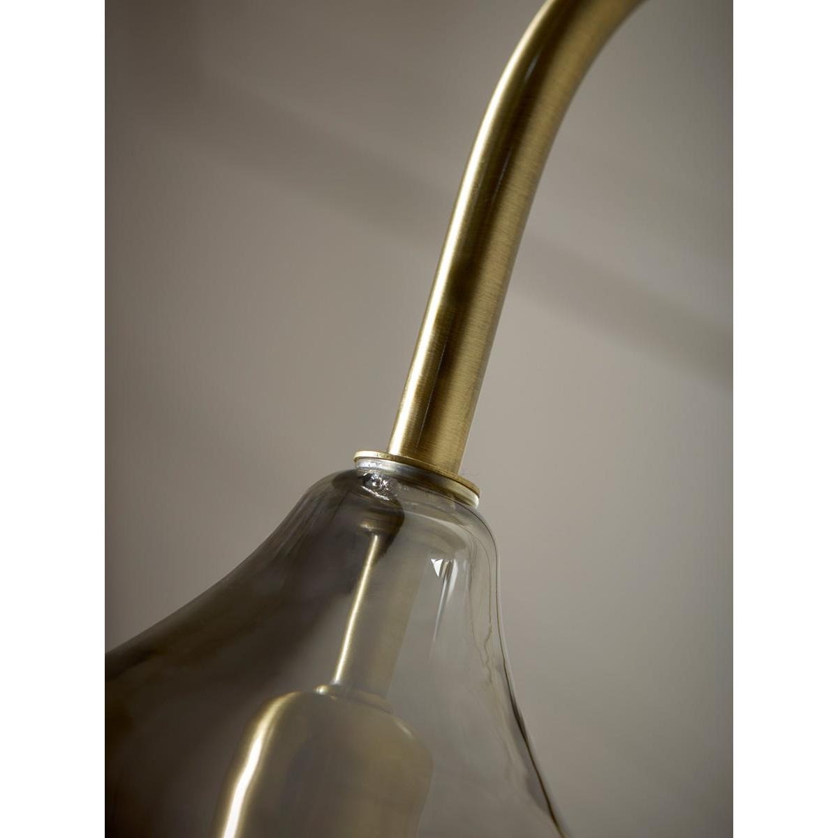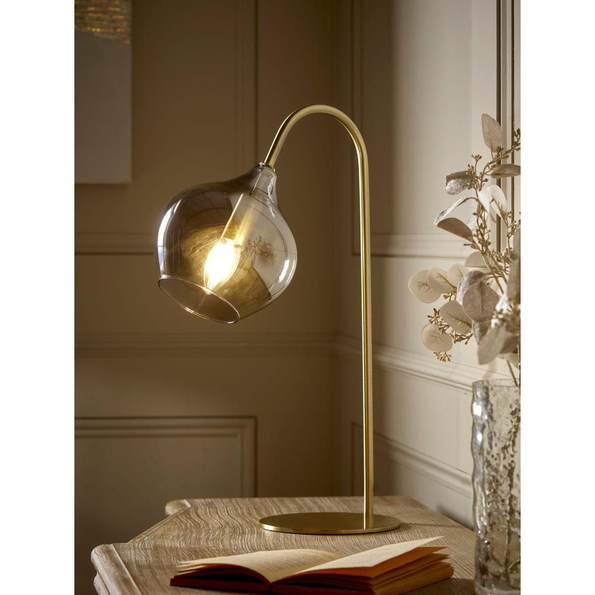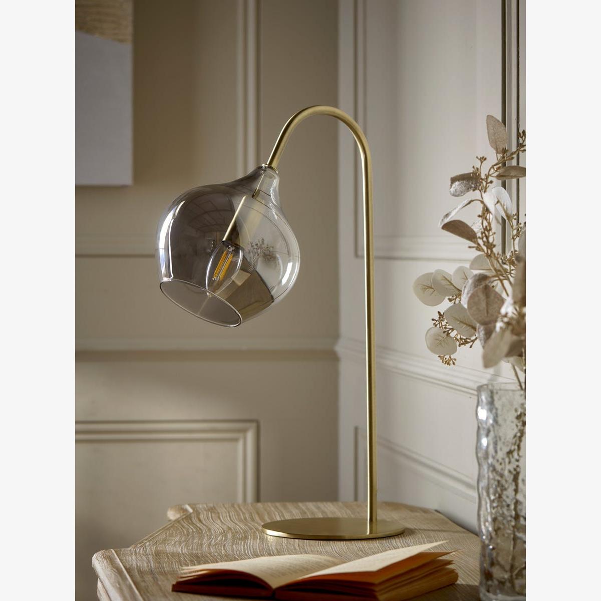 Sleek and modern, this table lamp warms your home in the most delicate of ways. A bell shaped smoked glass shade creates a muted golden hue to gently light your space. A brass curved arm and base adds elegance and luxury, bringing an elevated touch to your space. Place on a side table for a modern reading nook, or in your hallway to light your entranceway.  Discover how to create the perfect lighting scheme for your home using our Lighting Buying Guide.