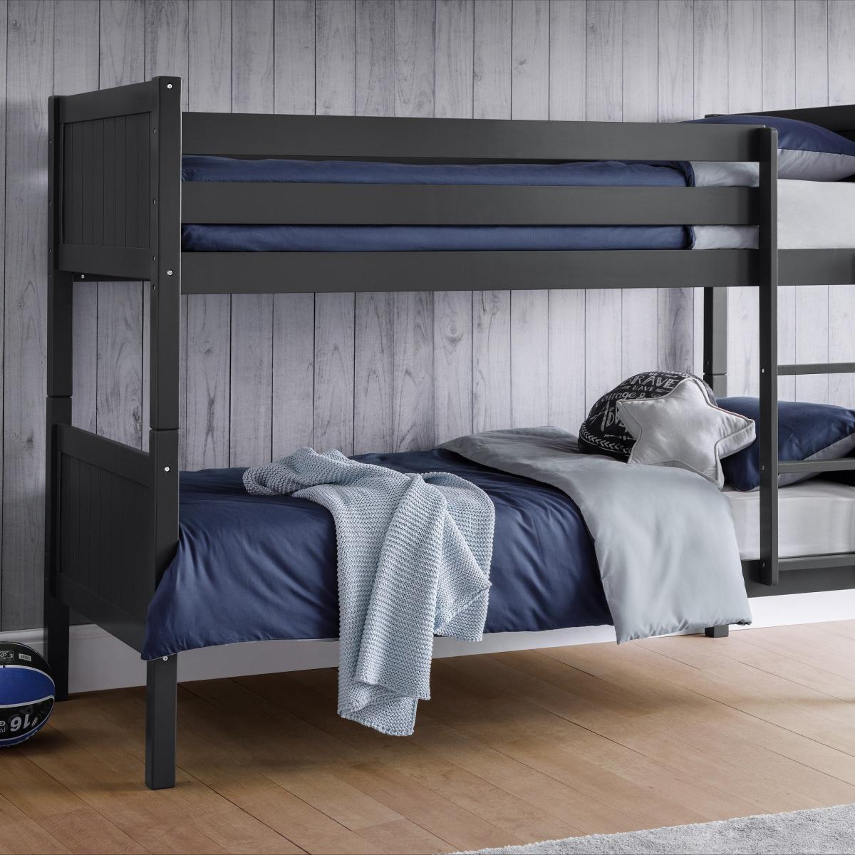 I’m a fan of this black bunk for its clean lines and sturdy metal frame - it suits everything from a minimalist loft to a cosy children’s room. The matt finish keeps it looking fresh and pairs well with pale walls or exposed brick for an industrial edge. For styling, layer in soft textiles: think pastel or jewel-toned bedding to soften the frame, plus a couple of patterned cushions on the bottom bunk. Use under-bed storage boxes or woven baskets to make the most of the space, and clip-on LED reading lights to each side rail for evening stories. A narrow wall shelf or peg rail beside it can hold books, plants or a small clock without cluttering the floor.