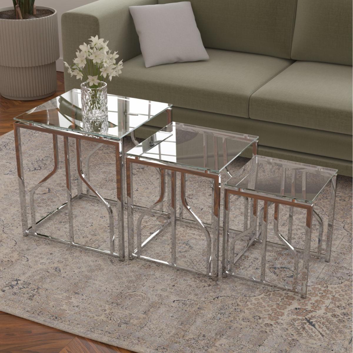 Introducing a stunning blend of contemporary elegance and practical design, this Nest of Glass Tables is the perfect addition to any modern home. Crafted with precision and attention to detail, these tables offer more than just functionality - they bring a sense of sophistication to your living space. Featuring clear glass tabletops, they exude sleekness while creating an airy, open feel. The polished chrome-finished metal frames not only provide durability but also deliver a shiny, reflective look that catches the light beautifully. The crisscross bracing on the base adds a touch of stylish detail while ensuring exceptional stability. Designed for versatility, these tables are ideal for use as coffee tables, side tables, or decorative stands, offering endless possibilities to enhance your space. The nested design allows the three descending-sized tables to fit seamlessly under one another, saving space when not in use. Flat-packed for your convenience, this set is easy to assemble, with all tools and instructions included. Whether you're hosting guests or looking to elevate your interior, this nest of tables blends minimalist aesthetics with functional versatility, making it a must-have for any home. Dimensions: Large Table: H: 49cm x W: 47cm x D: 47cm Medium Table: H: 42cm x W: 38cm x D: 36cm Small Table: H: 36cm x W: 30cm x D: 31cm Add this luxurious, space-saving trio to your home today and experience the perfect harmony of design and utility!
