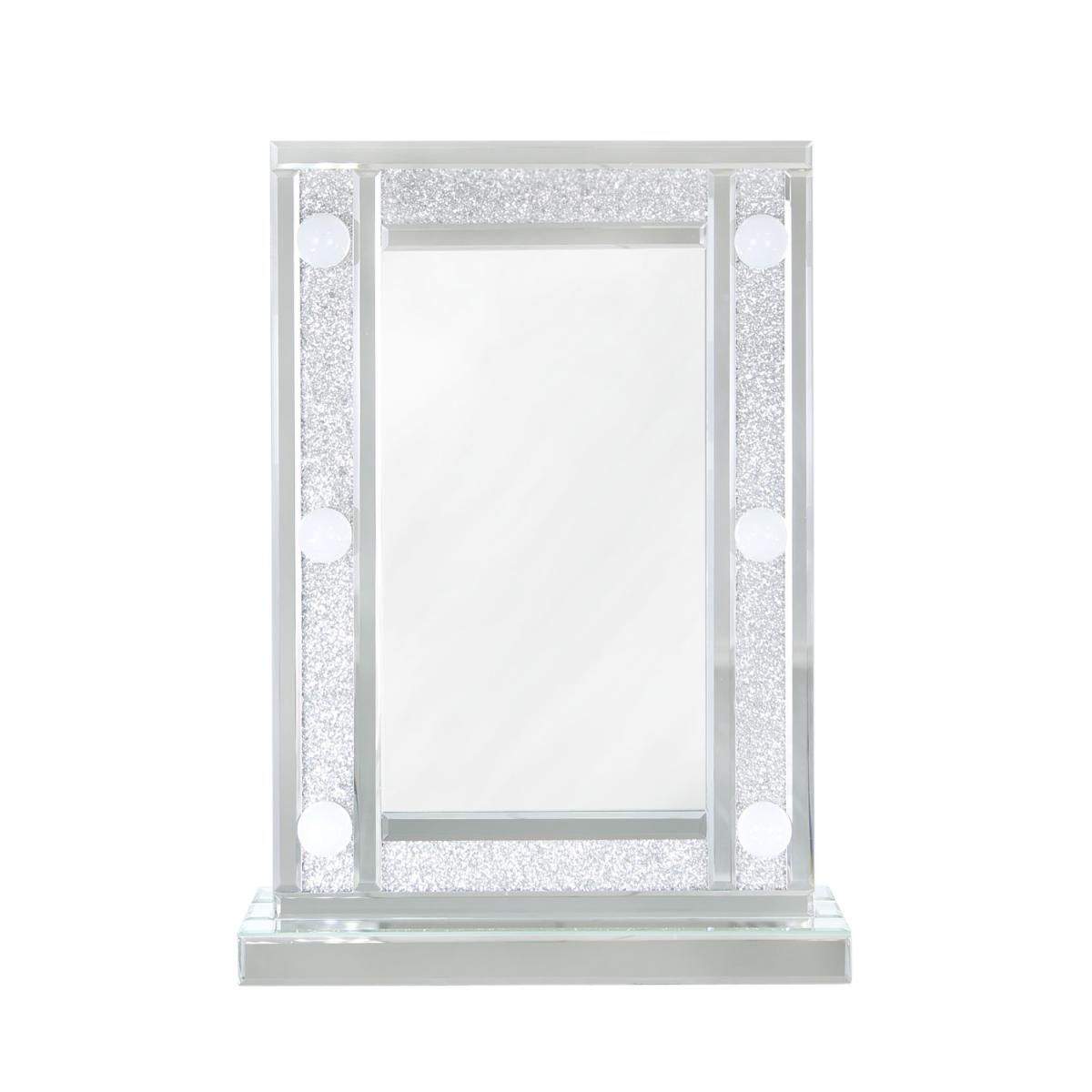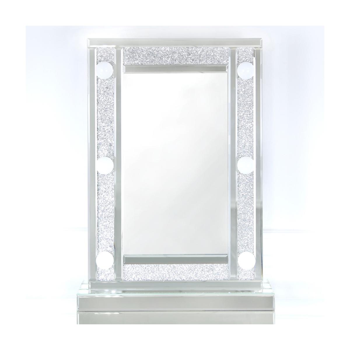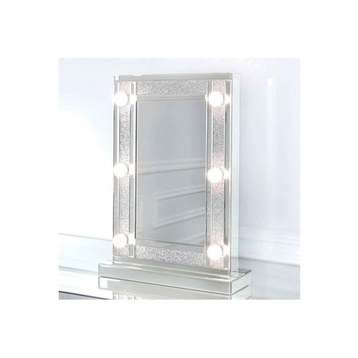 Dimensions H70 x W50 x D17 cm. Complete your dressing table with this Crumpler Makeup/Shaving Mirror featuring small diamond shaped pieces of glass inlaid into the frame and finished off with bevelled edged glass. This mirror is completed with 6 energy efficient LED bulbs included with a dimmer switch that allows you to change the perfect addition to any dressing area. Features. 6 LED bulbs included with a light dimmable switch. Cable length 190 cm6 Bulbs included; type E14/ 2. W..